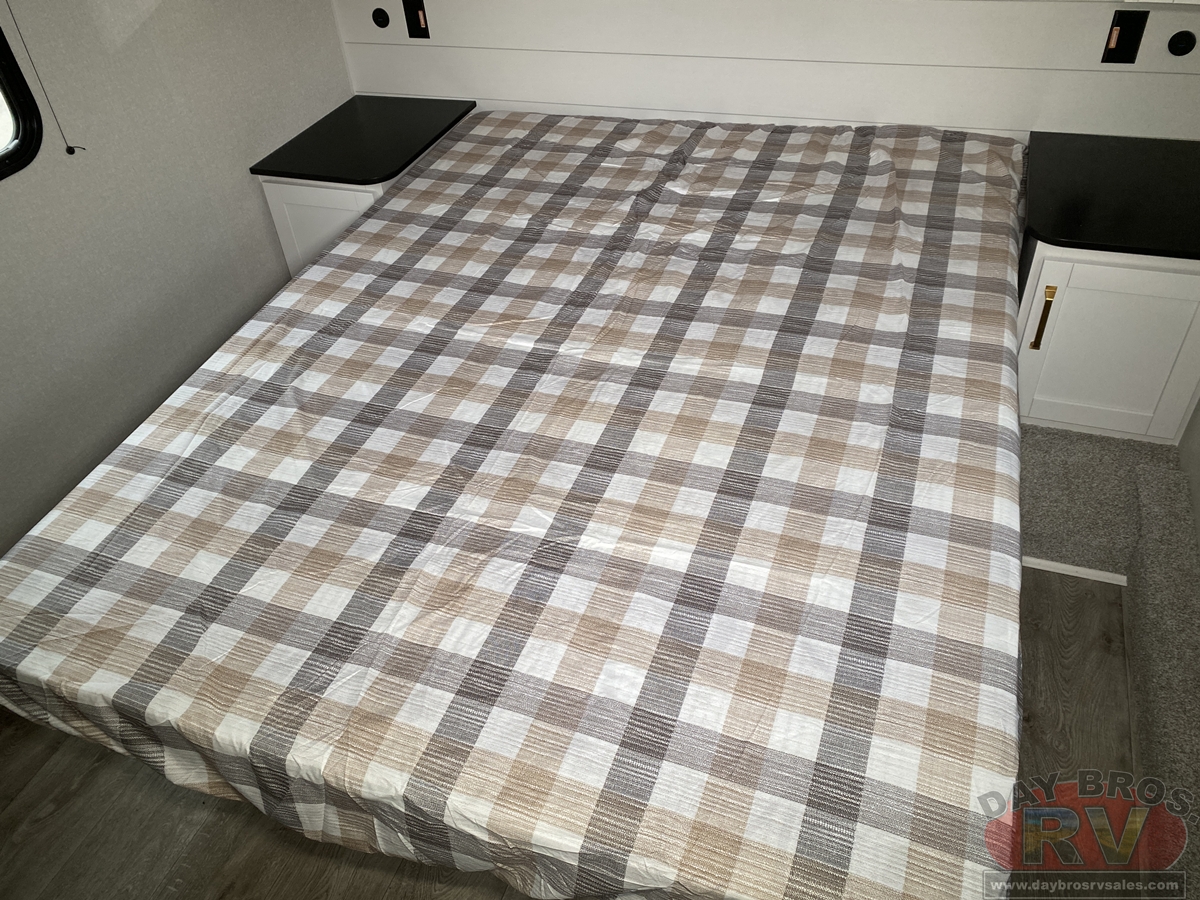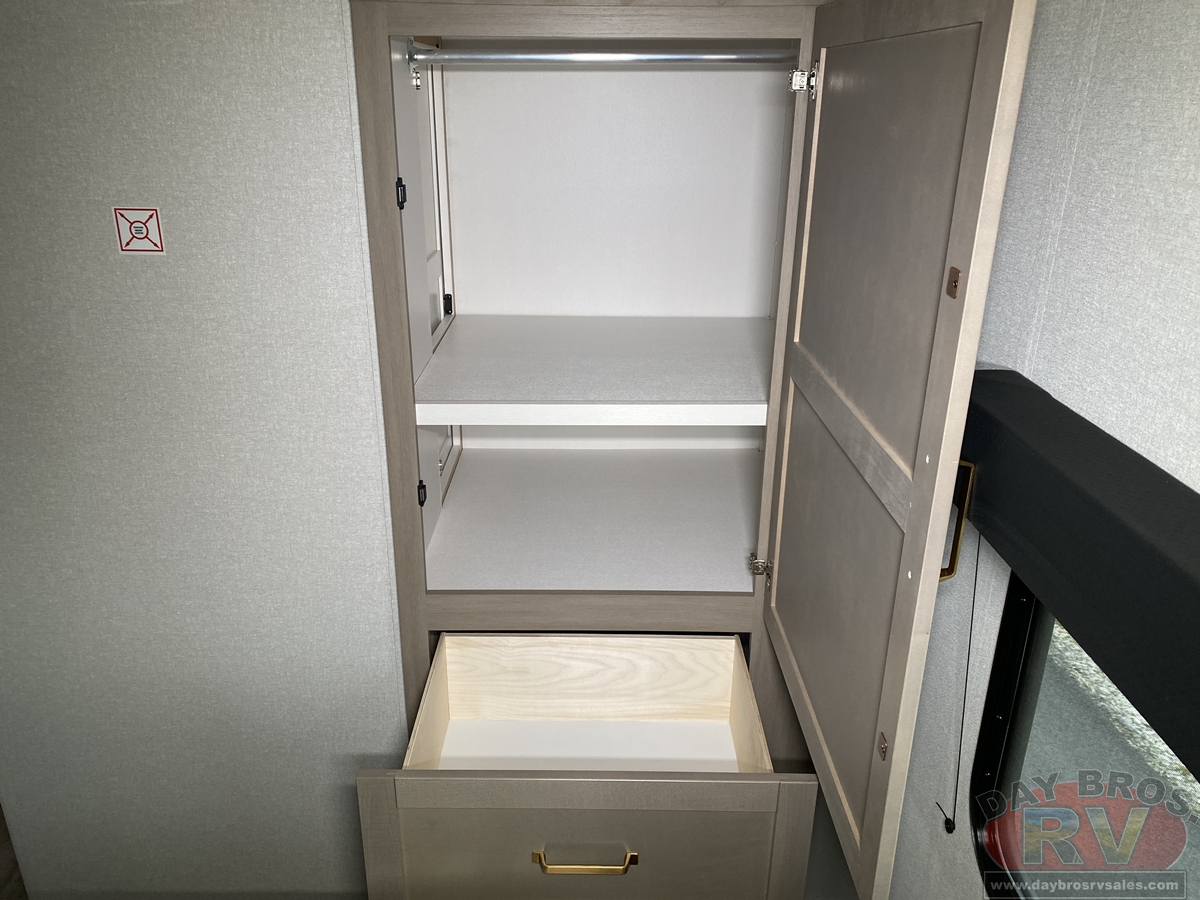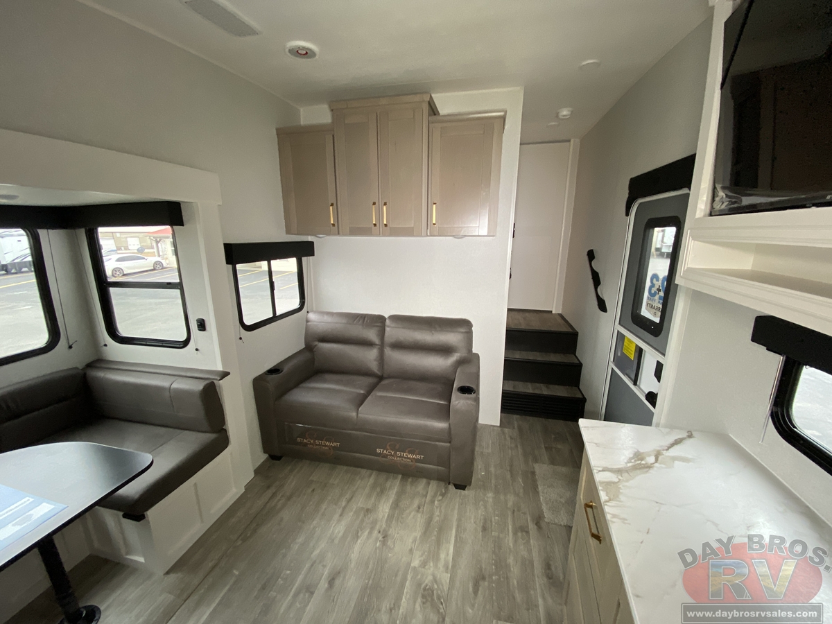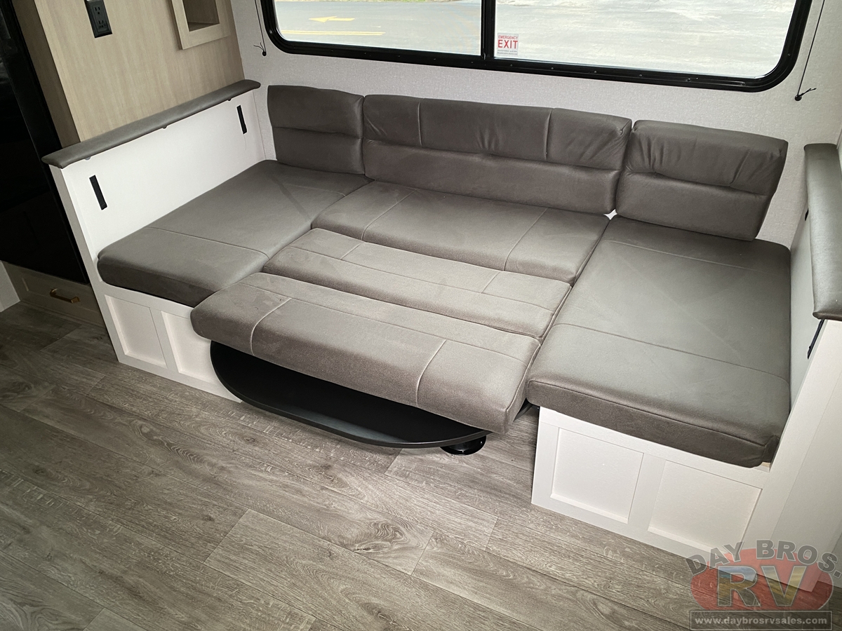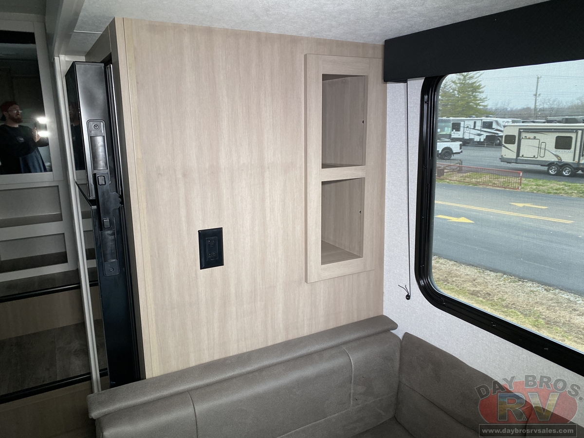Step inside, and you’ll be greeted by an open-concept living space, complete with residential-style finishes and thoughtful details that elevate your RV experience. The Whisper Quiet 15K BTU A/C system ensures a peaceful retreat, while the HELIX Cooling System™ dual-duct design keeps temperatures steady, even in the summer heat. Relax by the optional LED fireplace with a 5,000 BTU space heater, perfect for cozying up on chilly nights. The deep stainless-steel sink with a pull-out sprayer, spacious countertops, and full-extension 75-lb. drawer guides make meal prep effortless. The tri-fold hide-a-bed sofa with a memory foam sleep surface (select models) ensures every guest sleeps in comfort. With USB-C charging ports, a 40” 4K Ultra LED HD Smart TV, and Bluetooth audio connectivity, your entertainment is always at your fingertips.