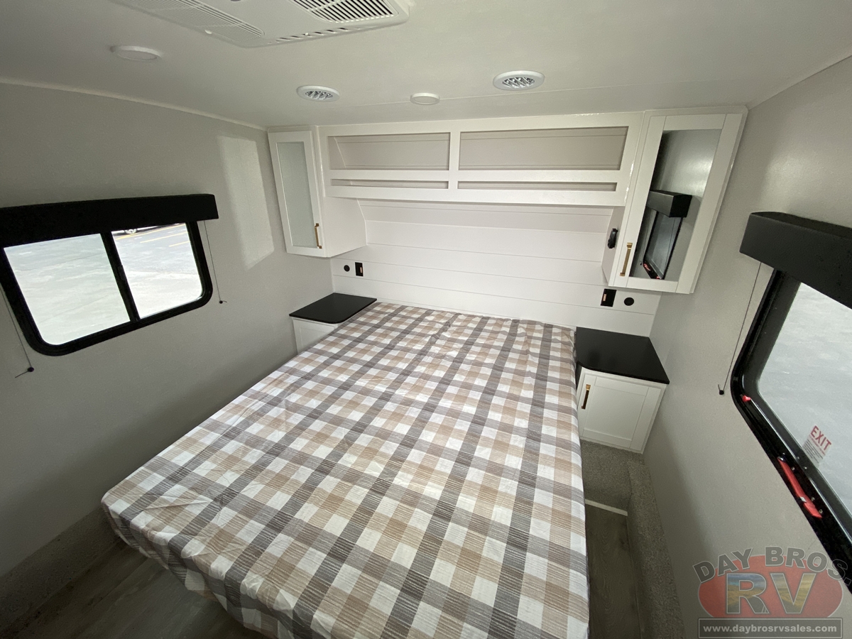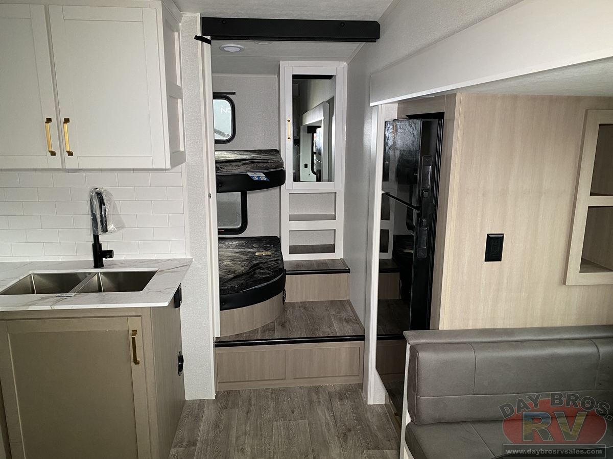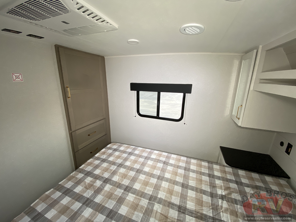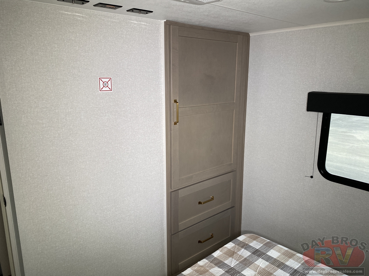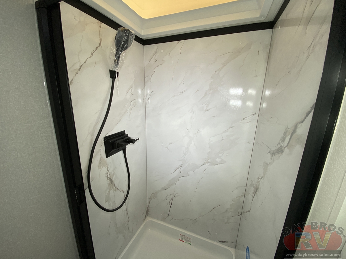 Step inside, and you’ll be greeted by an open-concept living space, complete with residential-style finishes and thoughtful details that elevate your RV experience. The Whisper Quiet 15K BTU A/C system ensures a peaceful retreat, while the HELIX Cooling System™ dual-duct design keeps temperatures steady, even in the summer heat. Relax by the optional LED fireplace with a 5,000 BTU space heater, perfect for cozying up on chilly nights. The deep stainless-steel sink with a pull-out sprayer, spacious countertops, and full-extension 75-lb. drawer guides make meal prep effortless. The tri-fold hide-a-bed sofa with a memory foam sleep surface (select models) ensures every guest sleeps in comfort. With USB-C charging ports, a 40” 4K Ultra LED HD Smart TV, and Bluetooth audio connectivity, your entertainment is always at your fingertips.