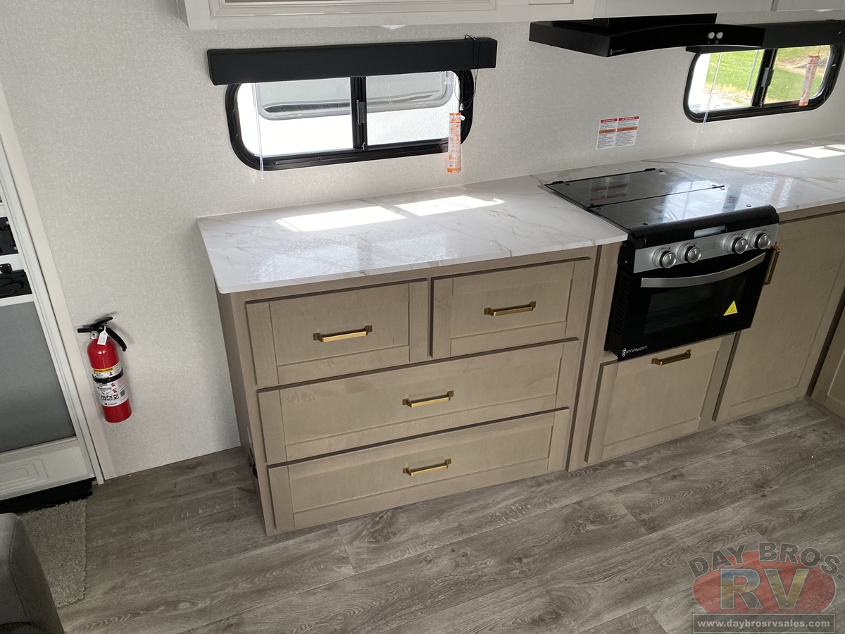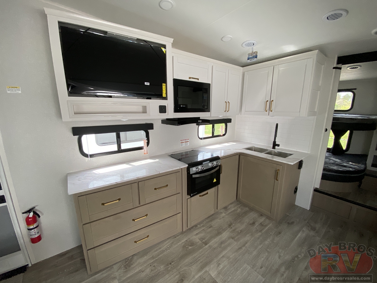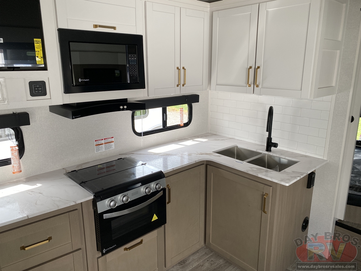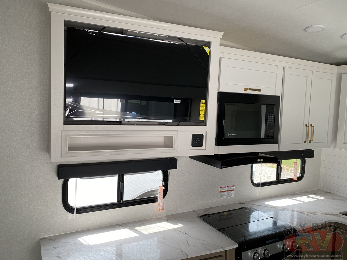Step inside, and you’ll be greeted by an open-concept living space, complete with residential-style finishes and thoughtful details that elevate your RV experience. The Whisper Quiet 15K BTU A/C system ensures a peaceful retreat, while the HELIX Cooling System™ dual-duct design keeps temperatures steady, even in the summer heat. Relax by the optional LED fireplace with a 5,000 BTU space heater, perfect for cozying up on chilly nights. The deep stainless-steel sink with a pull-out sprayer, spacious countertops, and full-extension 75-lb. drawer guides make meal prep effortless. The tri-fold hide-a-bed sofa with a memory foam sleep surface (select models) ensures every guest sleeps in comfort. With USB-C charging ports, a 40” 4K Ultra LED HD Smart TV, and Bluetooth audio connectivity, your entertainment is always at your fingertips.