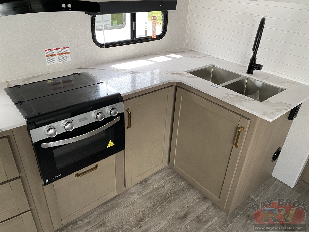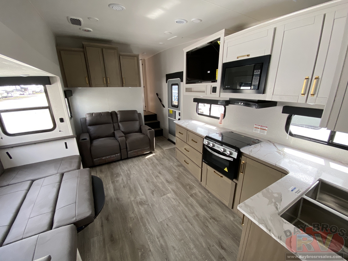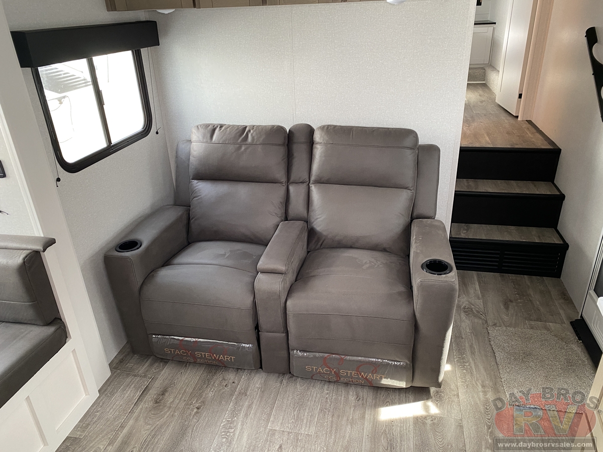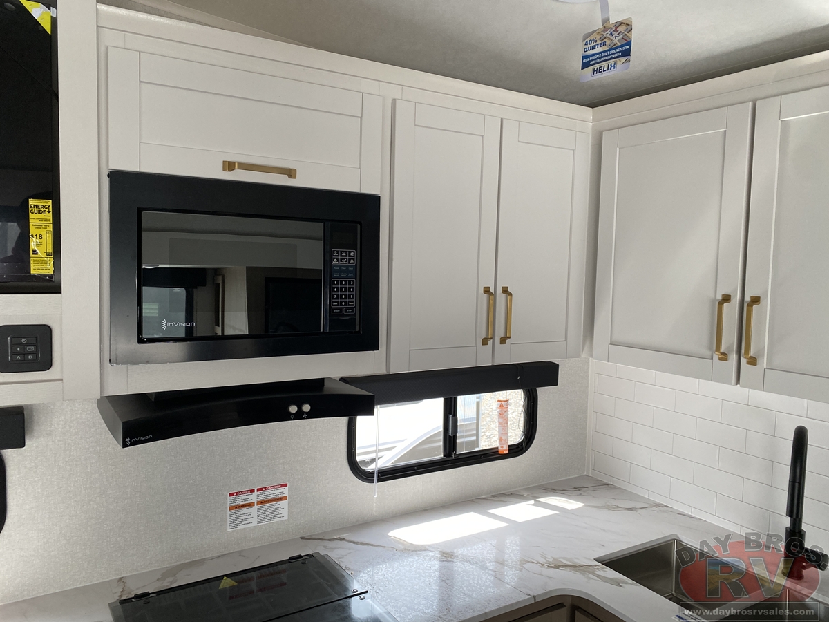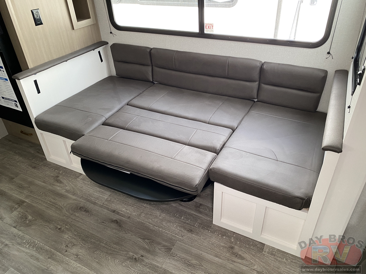 Step inside, and you’ll be greeted by an open-concept living space, complete with residential-style finishes and thoughtful details that elevate your RV experience. The Whisper Quiet 15K BTU A/C system ensures a peaceful retreat, while the HELIX Cooling System™ dual-duct design keeps temperatures steady, even in the summer heat. Relax by the optional LED fireplace with a 5,000 BTU space heater, perfect for cozying up on chilly nights. The deep stainless-steel sink with a pull-out sprayer, spacious countertops, and full-extension 75-lb. drawer guides make meal prep effortless. The tri-fold hide-a-bed sofa with a memory foam sleep surface (select models) ensures every guest sleeps in comfort. With USB-C charging ports, a 40” 4K Ultra LED HD Smart TV, and Bluetooth audio connectivity, your entertainment is always at your fingertips.