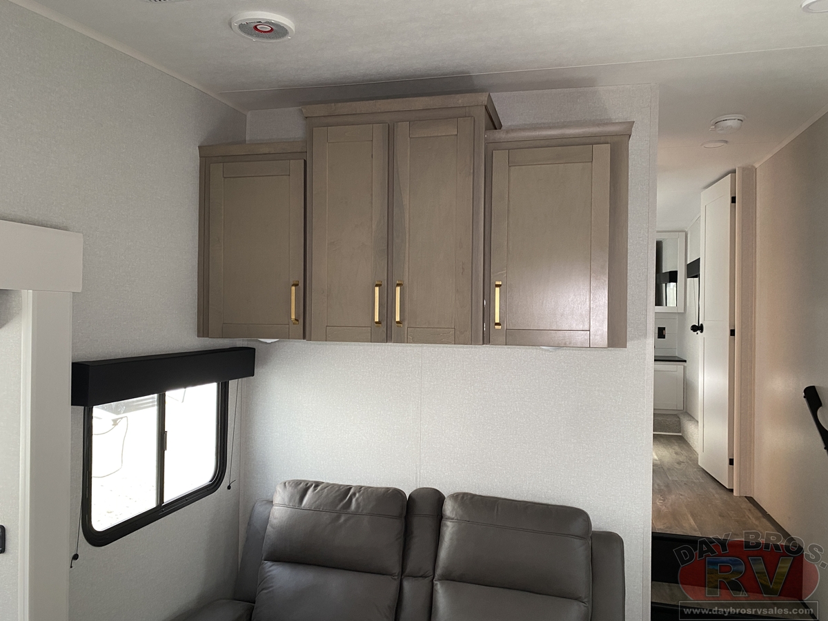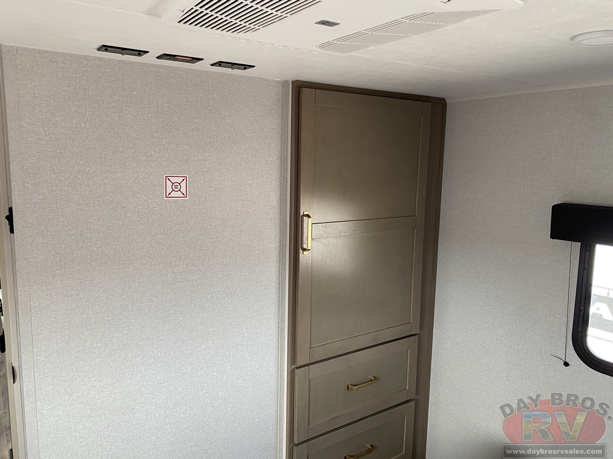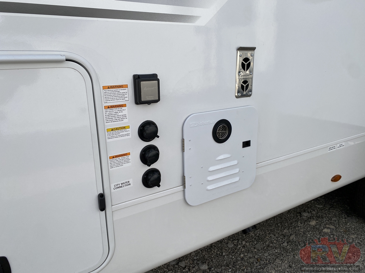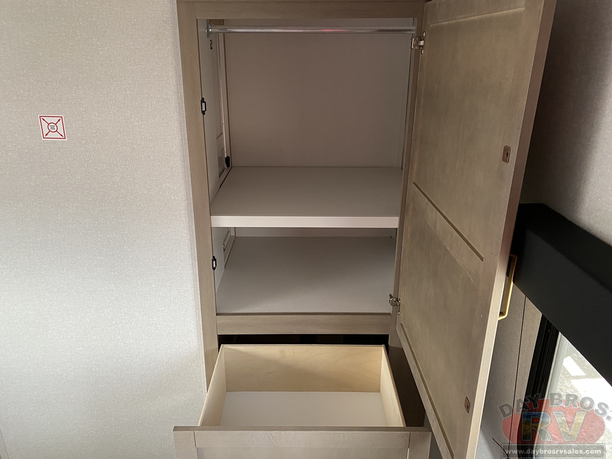 Step inside, and you’ll be greeted by an open-concept living space, complete with residential-style finishes and thoughtful details that elevate your RV experience. The Whisper Quiet 15K BTU A/C system ensures a peaceful retreat, while the HELIX Cooling System™ dual-duct design keeps temperatures steady, even in the summer heat. Relax by the optional LED fireplace with a 5,000 BTU space heater, perfect for cozying up on chilly nights. The deep stainless-steel sink with a pull-out sprayer, spacious countertops, and full-extension 75-lb. drawer guides make meal prep effortless. The tri-fold hide-a-bed sofa with a memory foam sleep surface (select models) ensures every guest sleeps in comfort. With USB-C charging ports, a 40” 4K Ultra LED HD Smart TV, and Bluetooth audio connectivity, your entertainment is always at your fingertips.