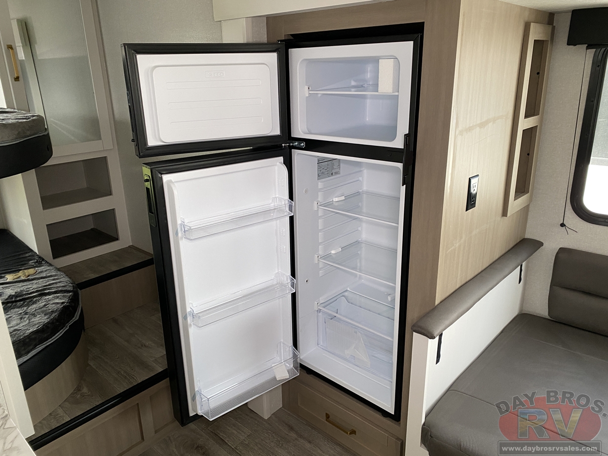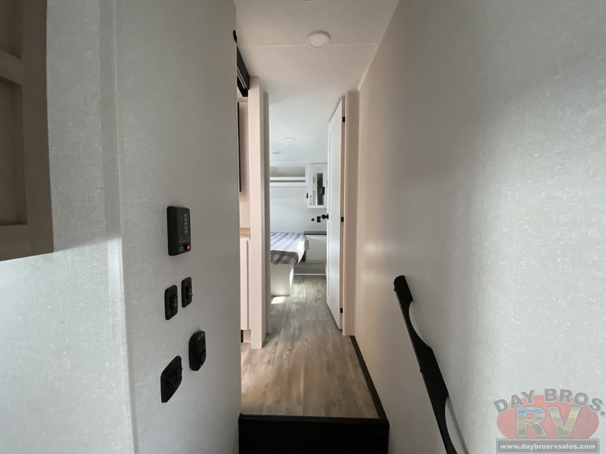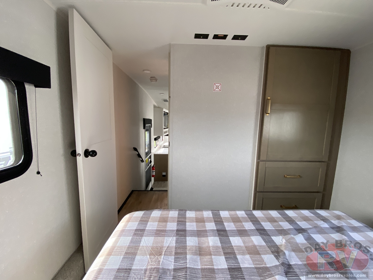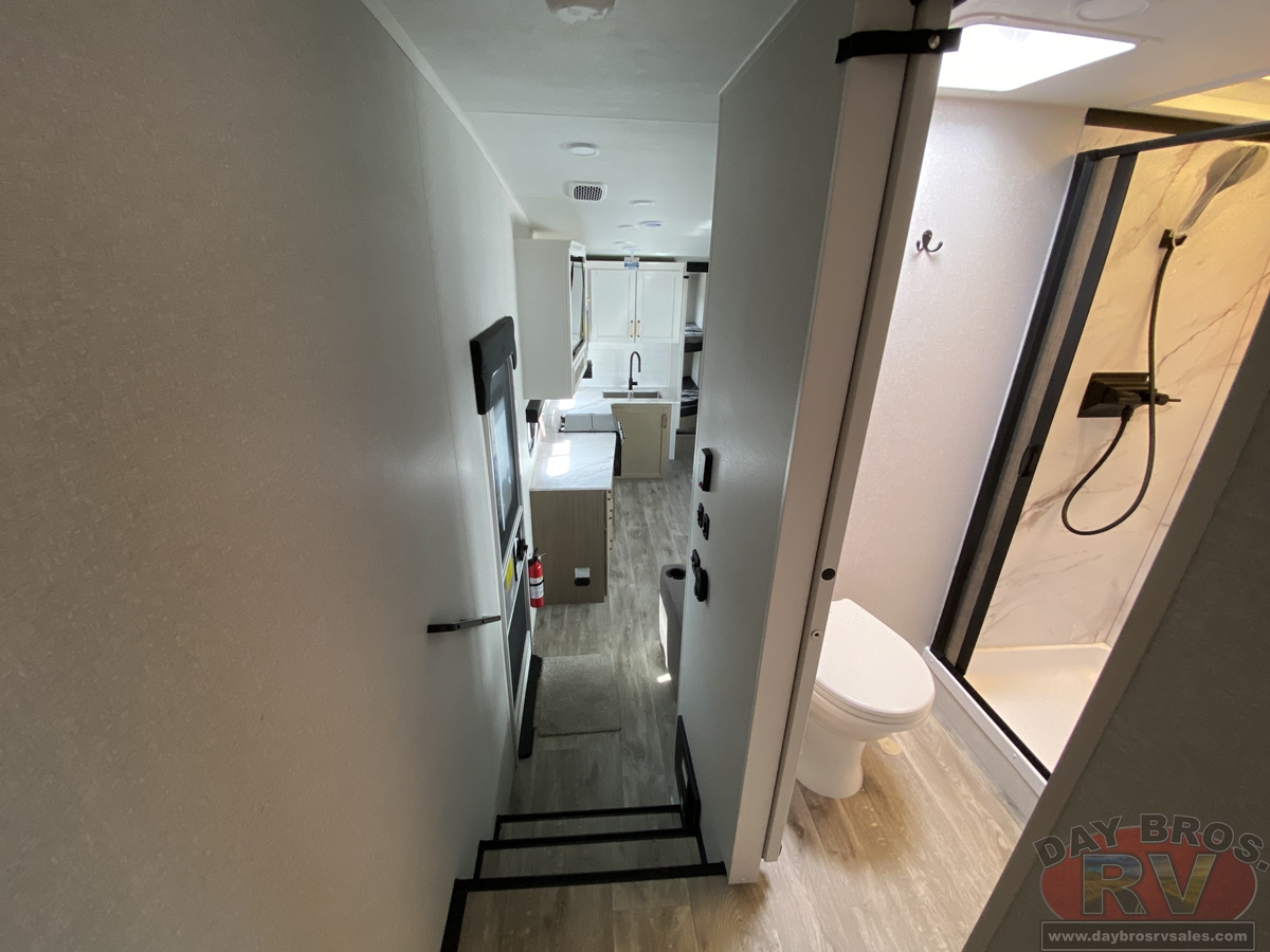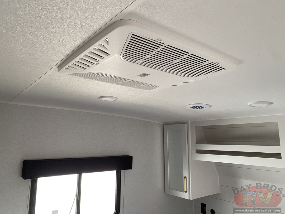 Step inside, and you’ll be greeted by an open-concept living space, complete with residential-style finishes and thoughtful details that elevate your RV experience. The Whisper Quiet 15K BTU A/C system ensures a peaceful retreat, while the HELIX Cooling System™ dual-duct design keeps temperatures steady, even in the summer heat. Relax by the optional LED fireplace with a 5,000 BTU space heater, perfect for cozying up on chilly nights. The deep stainless-steel sink with a pull-out sprayer, spacious countertops, and full-extension 75-lb. drawer guides make meal prep effortless. The tri-fold hide-a-bed sofa with a memory foam sleep surface (select models) ensures every guest sleeps in comfort. With USB-C charging ports, a 40” 4K Ultra LED HD Smart TV, and Bluetooth audio connectivity, your entertainment is always at your fingertips.