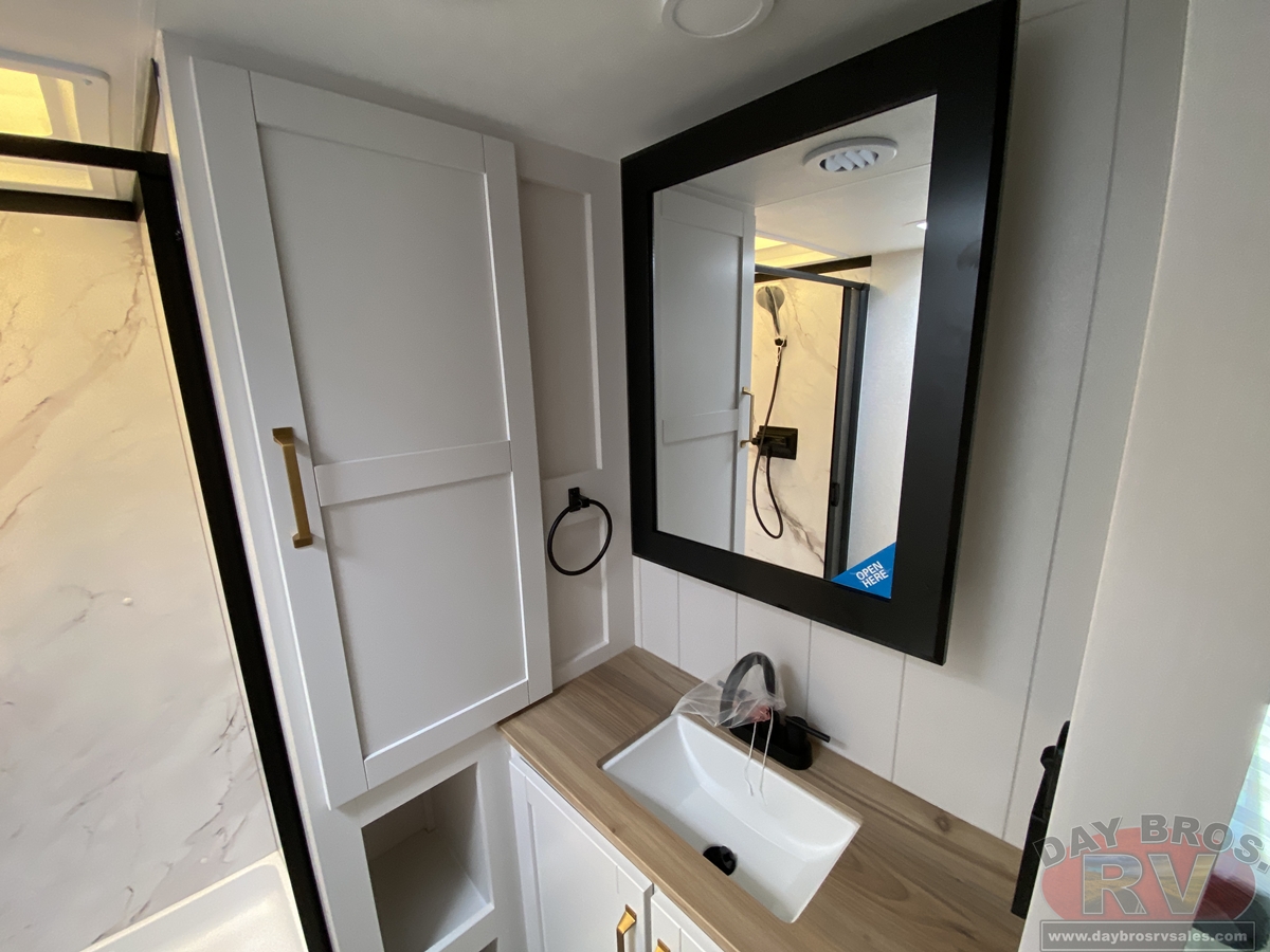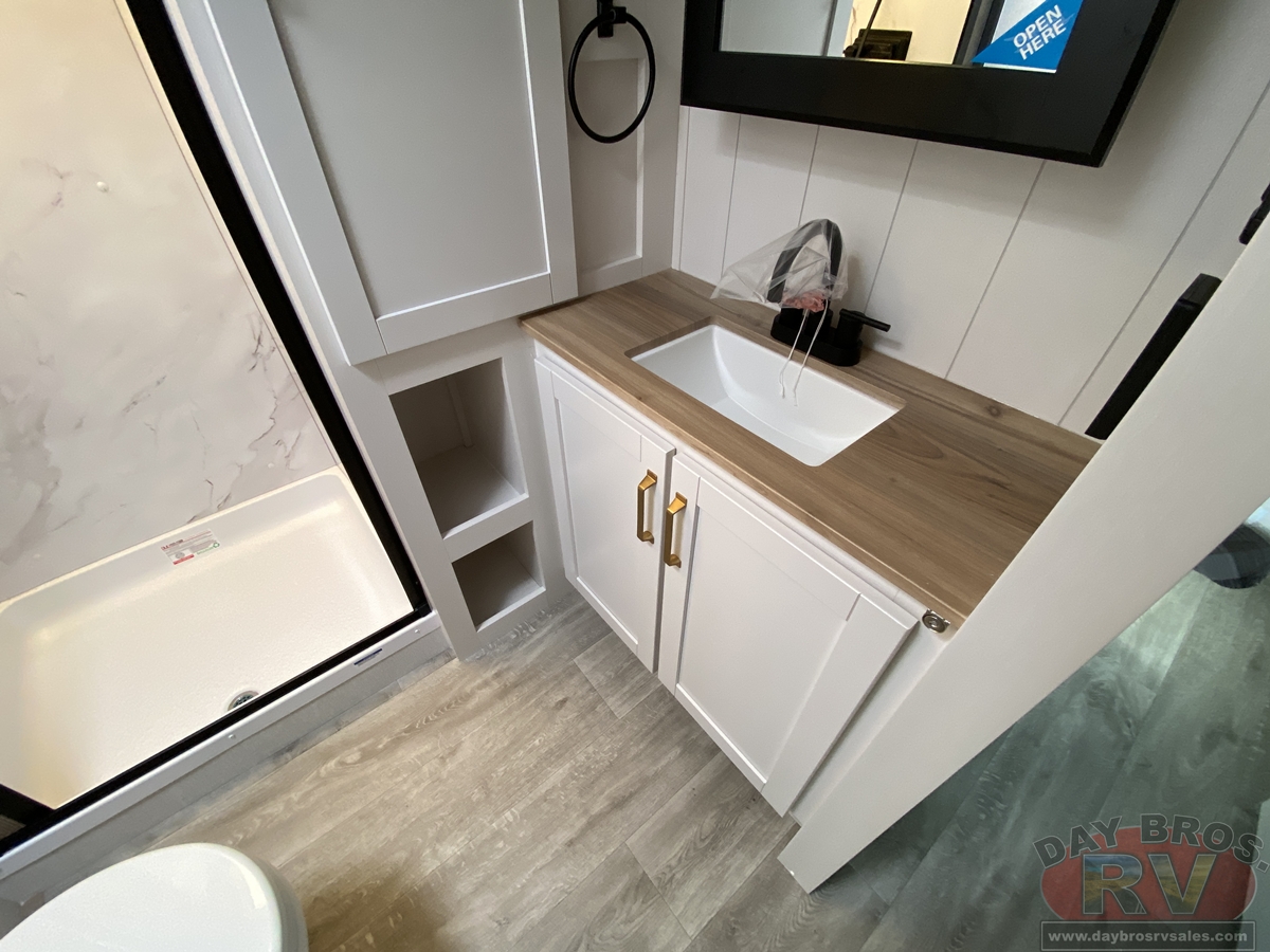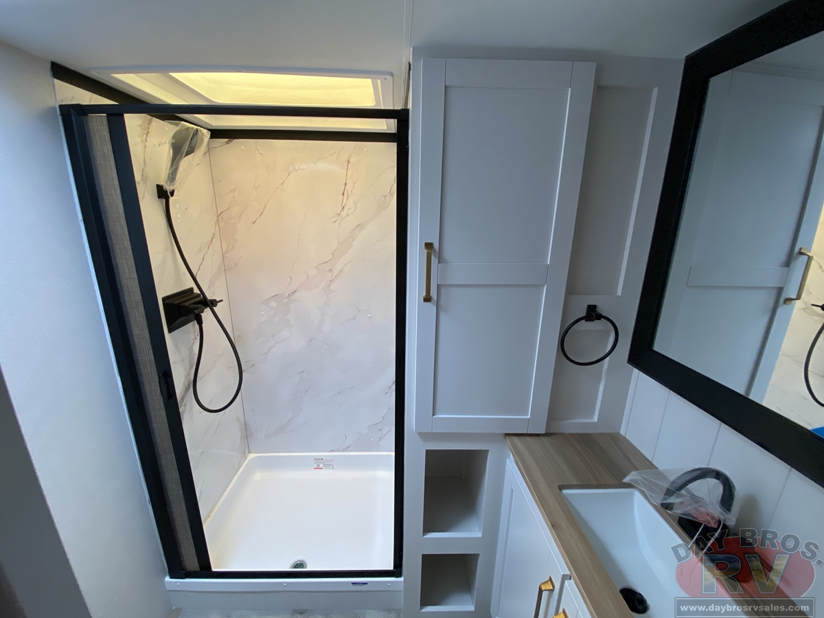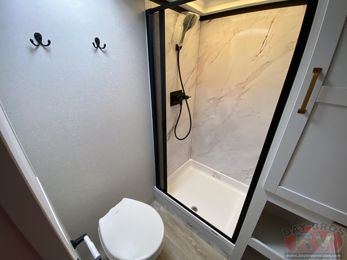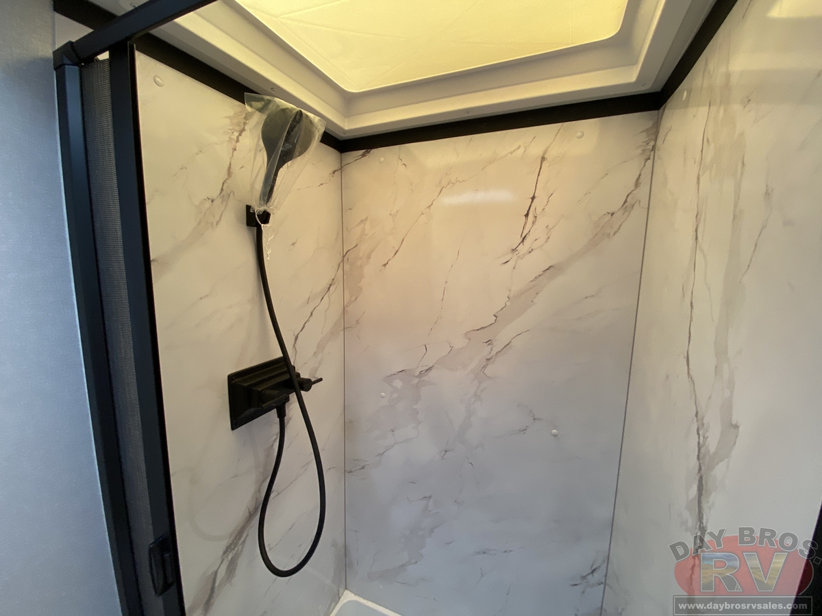 After a day of hiking, fishing, or exploring new destinations, retreat to the private master suite, where high-end finishes and smart design guarantee a restful night’s sleep. Gas-strutted under-bed storage provides extra room for all your essentials, and the design of the bed area is prepped for added convenience, including space for a CPAP machine. Panoramic windows let in natural light and fresh air, creating a breezy, open feel.