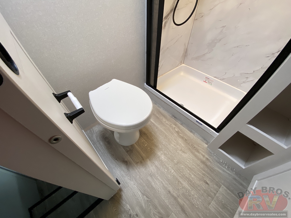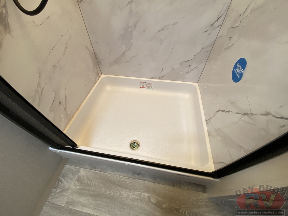 The Eagle SLE Fifth Wheel isn’t just about aesthetics—it’s engineered for real-world adventures. Flush-floor linoleum flooring throughout eliminates carpet and tripping hazards, offering easy cleaning and a sleek, modern look. The porcelain foot-flush toilet ensures even the little luxuries matter. Stay connected, stream movies, and keep up with your favorite shows from anywhere with the Winegard Air 360 Antenna. Dexter® Suspension & Wet Bolt Fasteners ensure a smoother, more stable ride. Want to go off-grid? The Overlander II Solar Package (optional) adds 400W of solar power and an 1800W inverter, making dry camping easier than ever.
