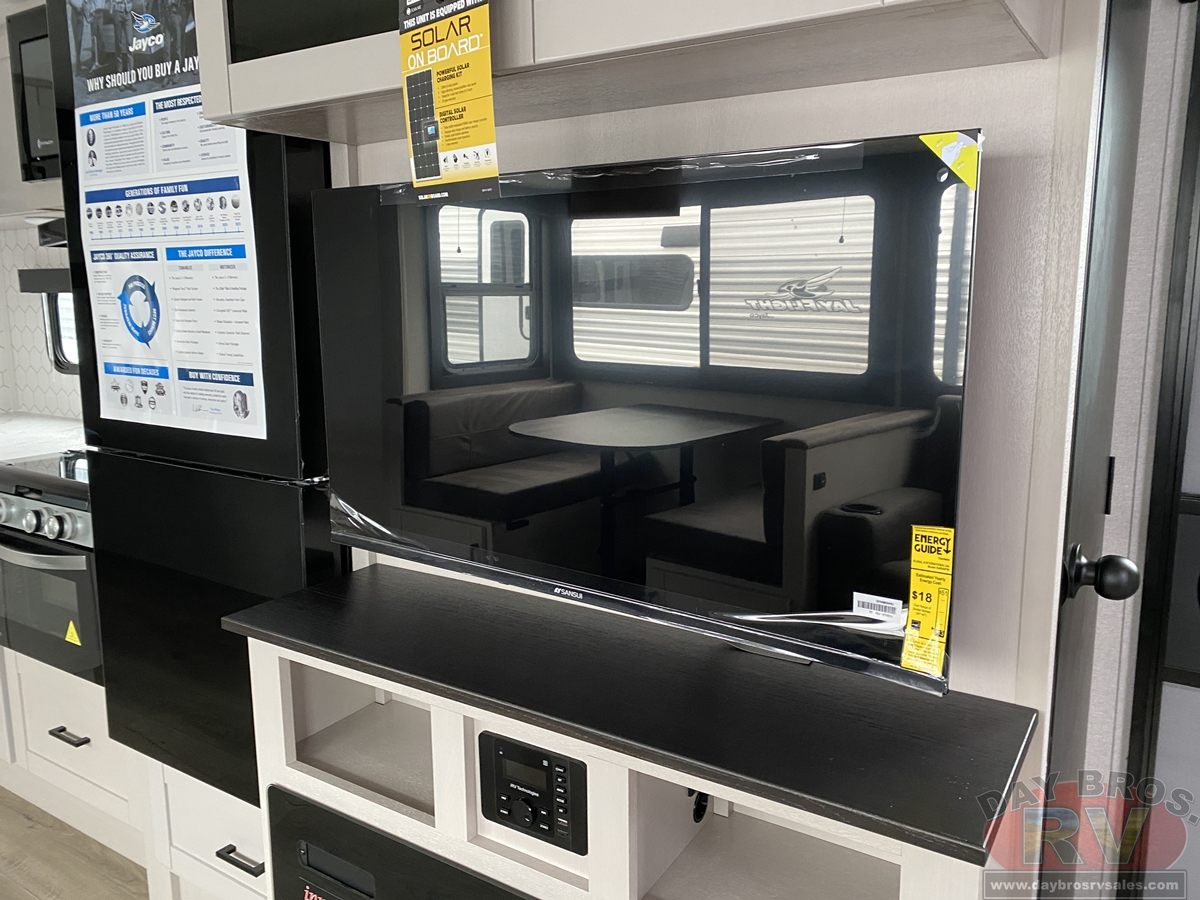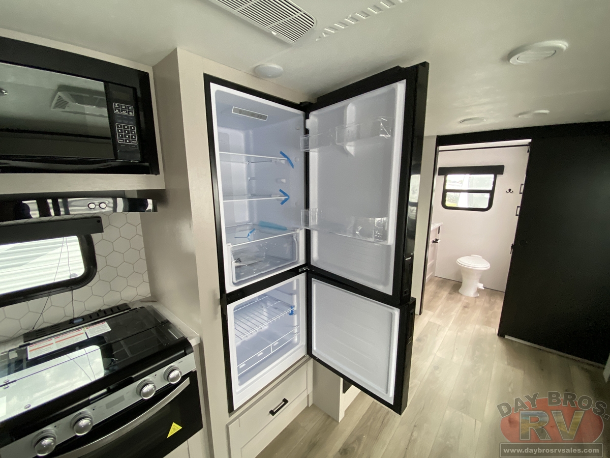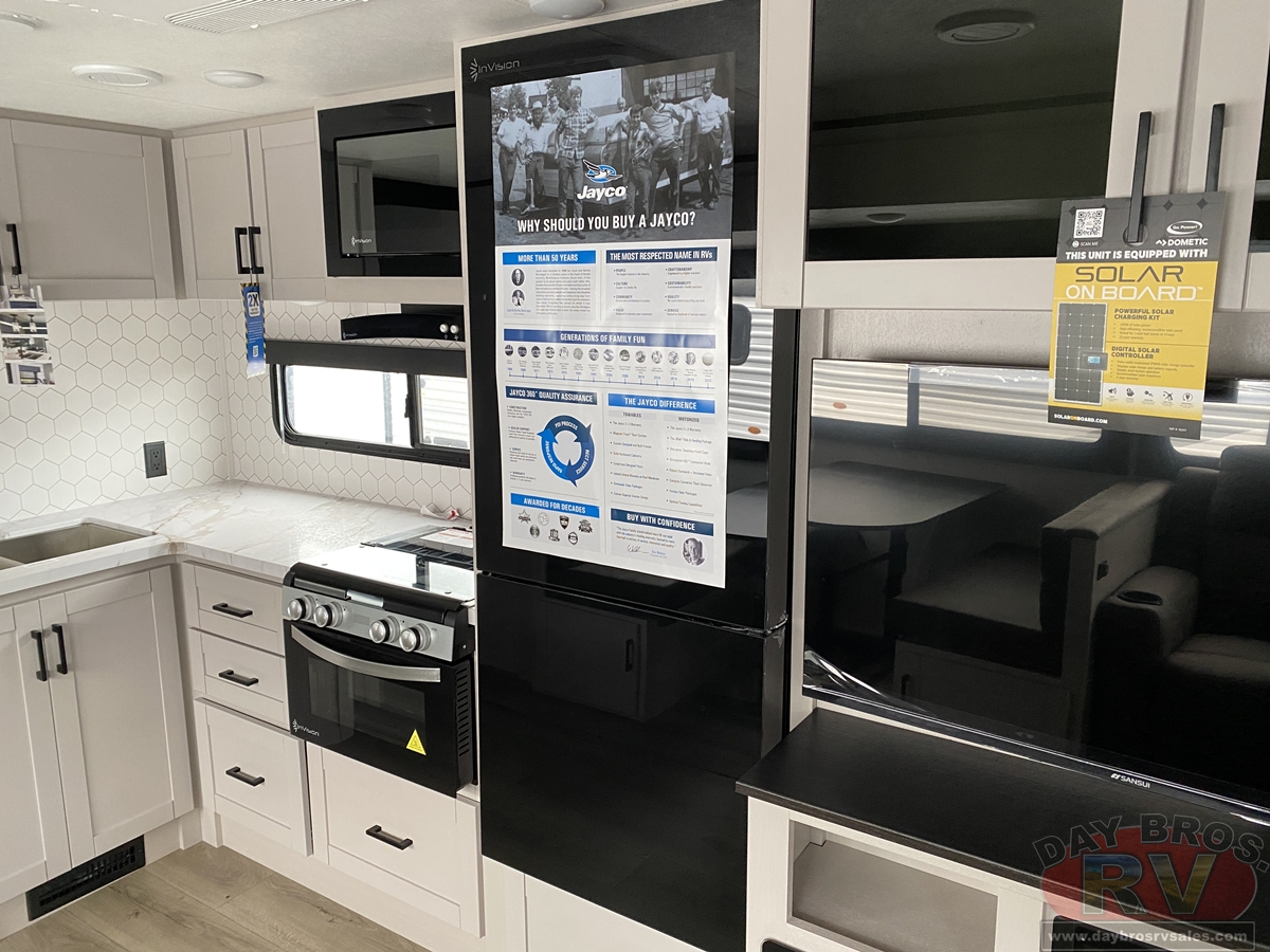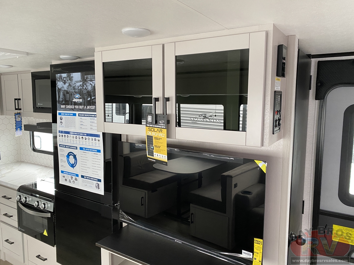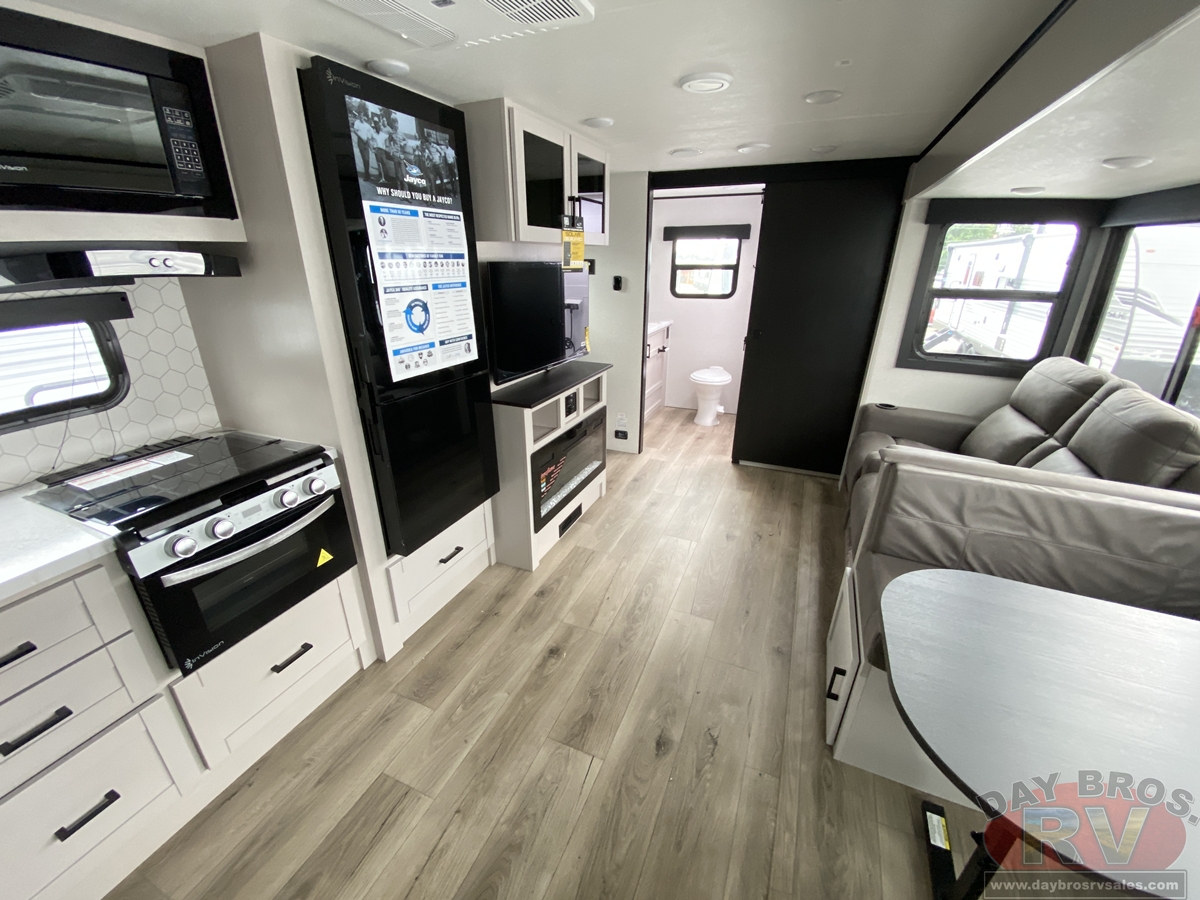The amenities for 2026 don’t stop there! In the kitchen area, you'll find seamless countertops throughout, a stainless-steel sink with a high-rise faucet and pull-out sprayer. You'll also be blown away by the all-new InVision Suite appliance package with an 11 cubic foot 12V fridge, standard in all Jay Feather models. This fridge has a shiny, black glass front with a two-door fridge over the freezer. Store more on the go with oversized cabinet doors and drawers. The cabinet doors are attached with hidden hinges to give each Jay Feather that sought-after residential look and feel.