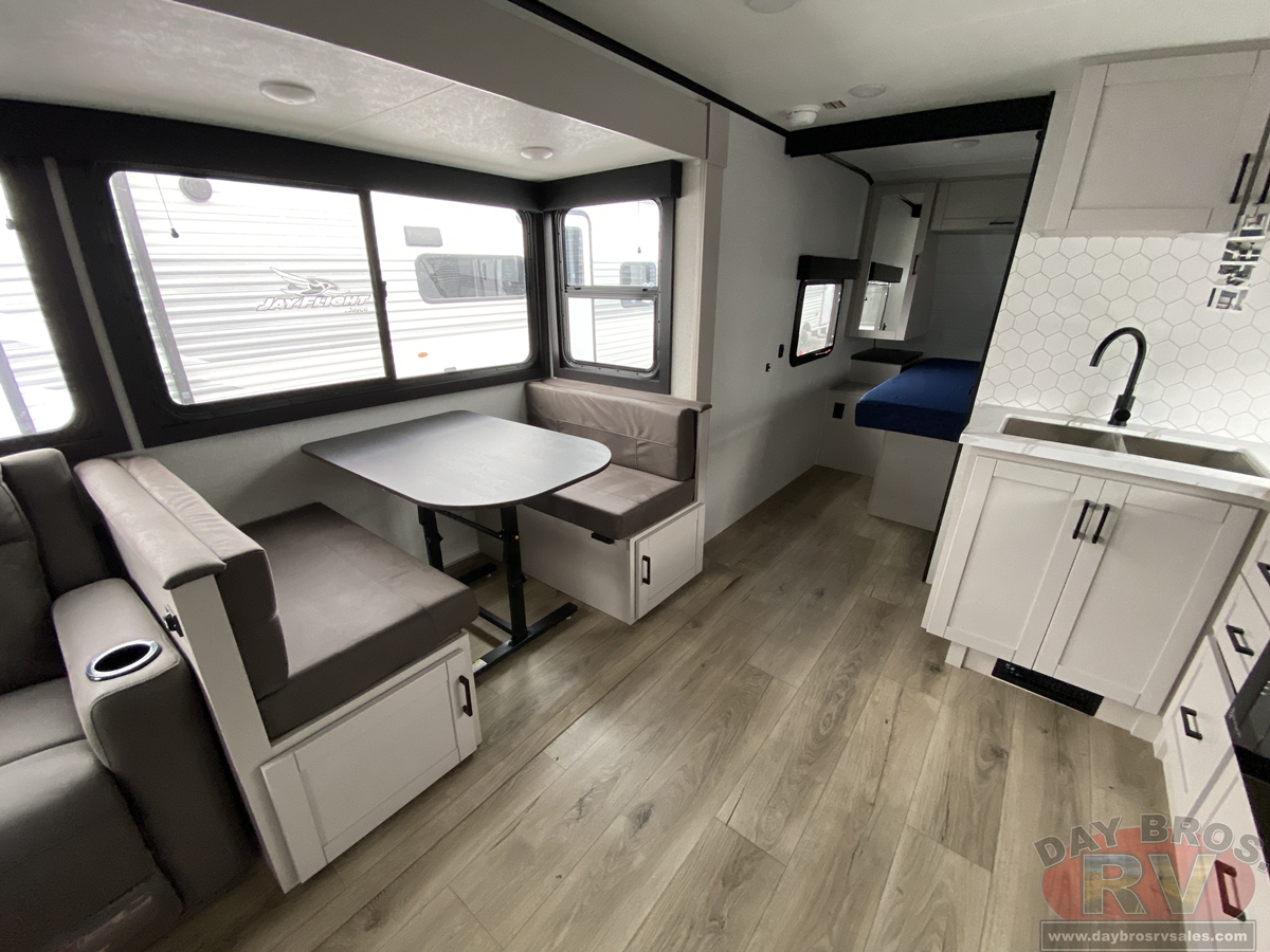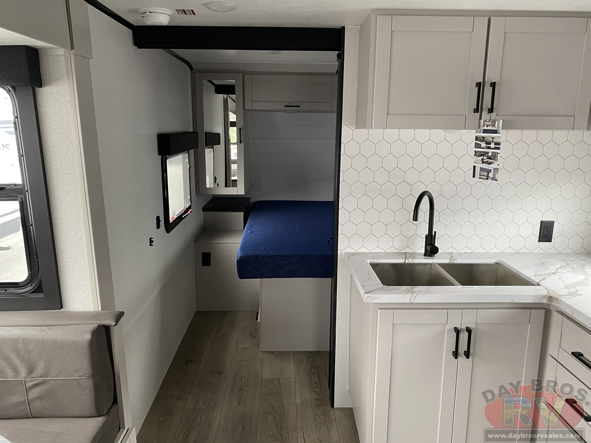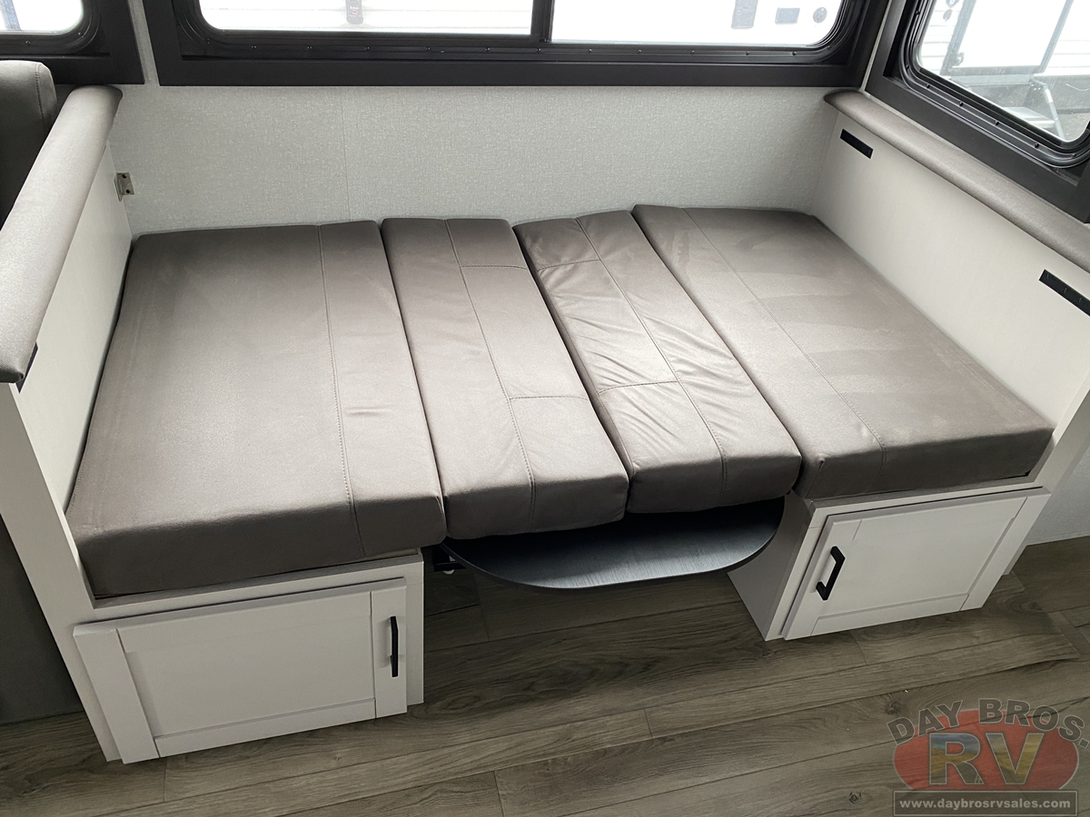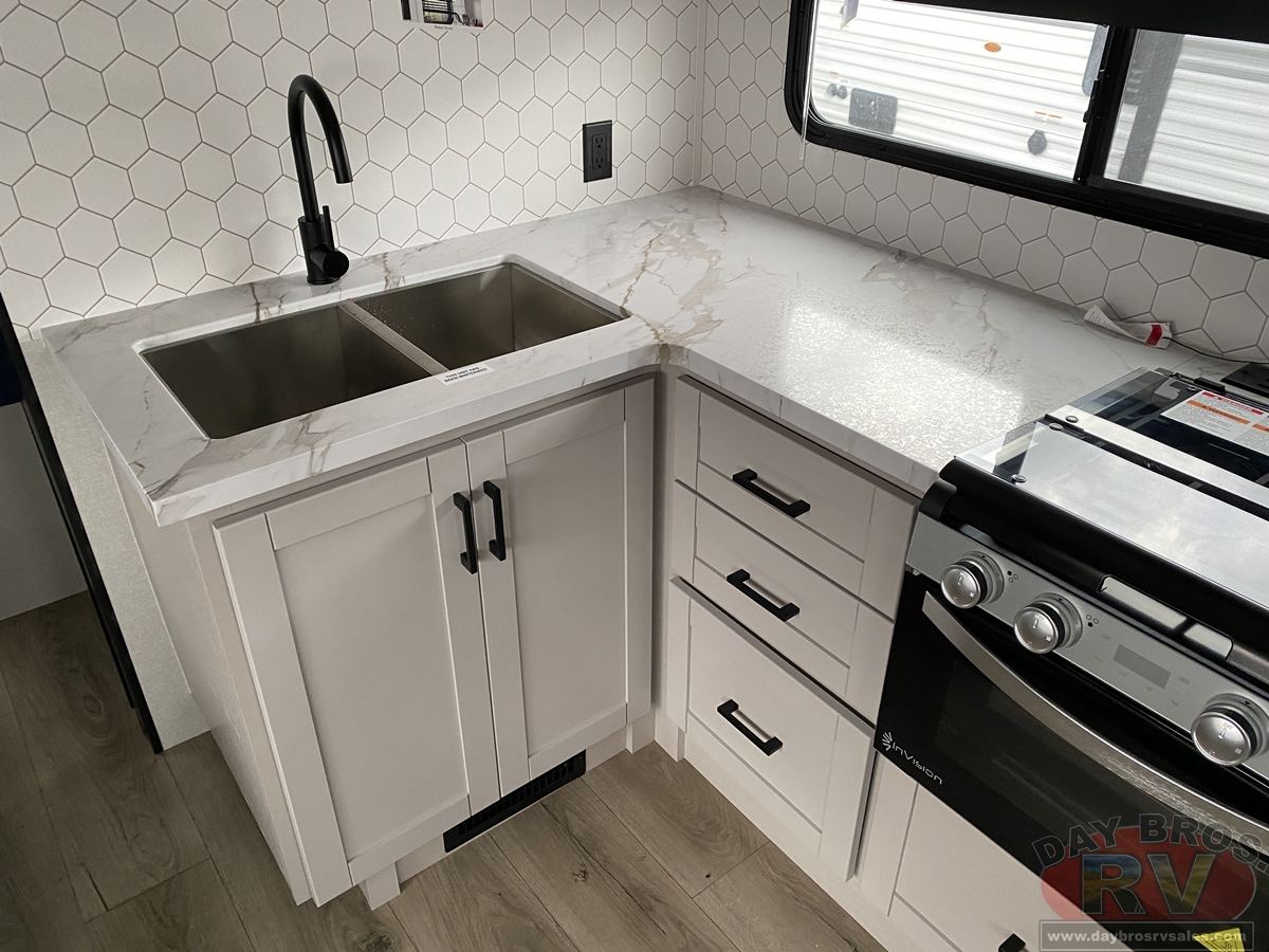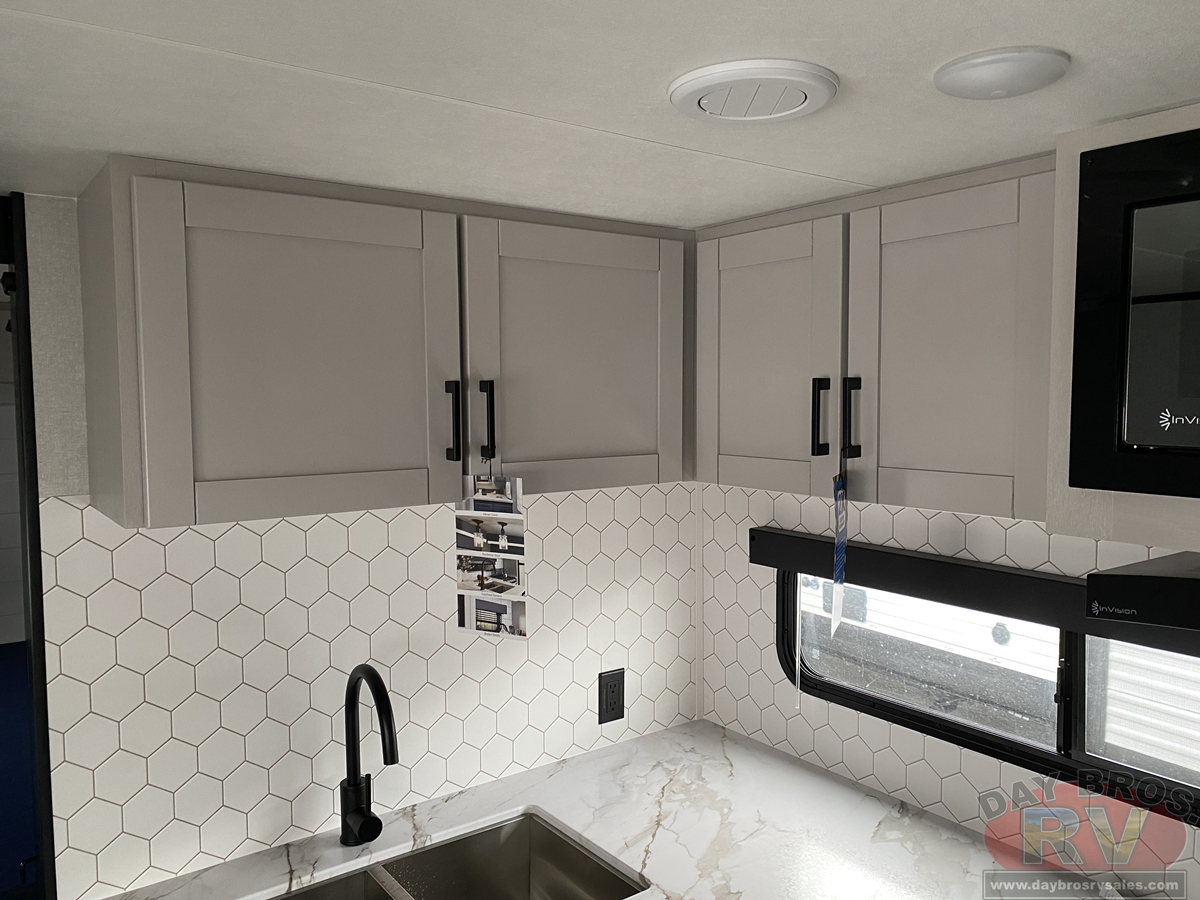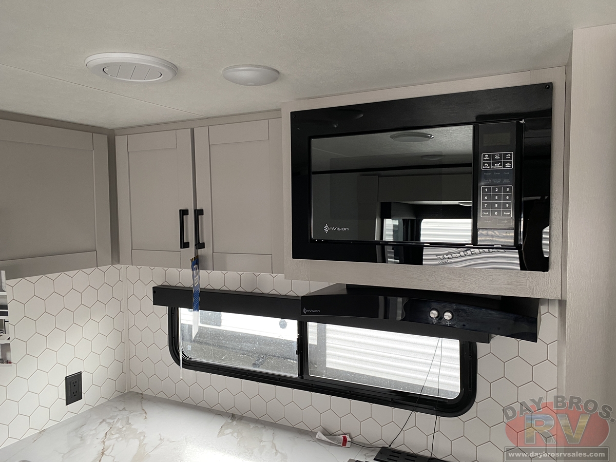 The amenities for 2026 don’t stop there! In the kitchen area, you'll find seamless countertops throughout, a stainless-steel sink with a high-rise faucet and pull-out sprayer. You'll also be blown away by the all-new InVision Suite appliance package with an 11 cubic foot 12V fridge, standard in all Jay Feather models. This fridge has a shiny, black glass front with a two-door fridge over the freezer. Store more on the go with oversized cabinet doors and drawers. The cabinet doors are attached with hidden hinges to give each Jay Feather that sought-after residential look and feel.