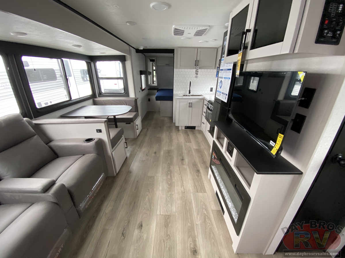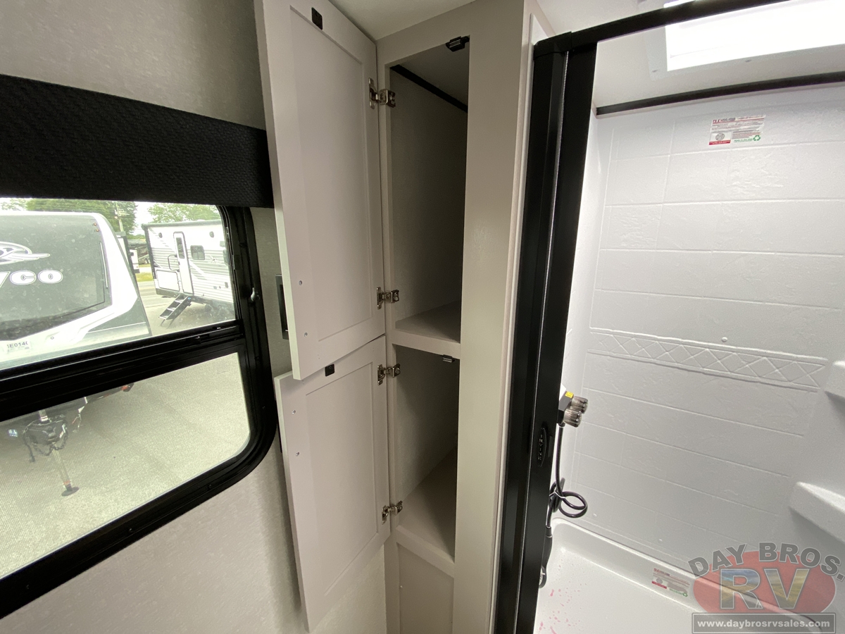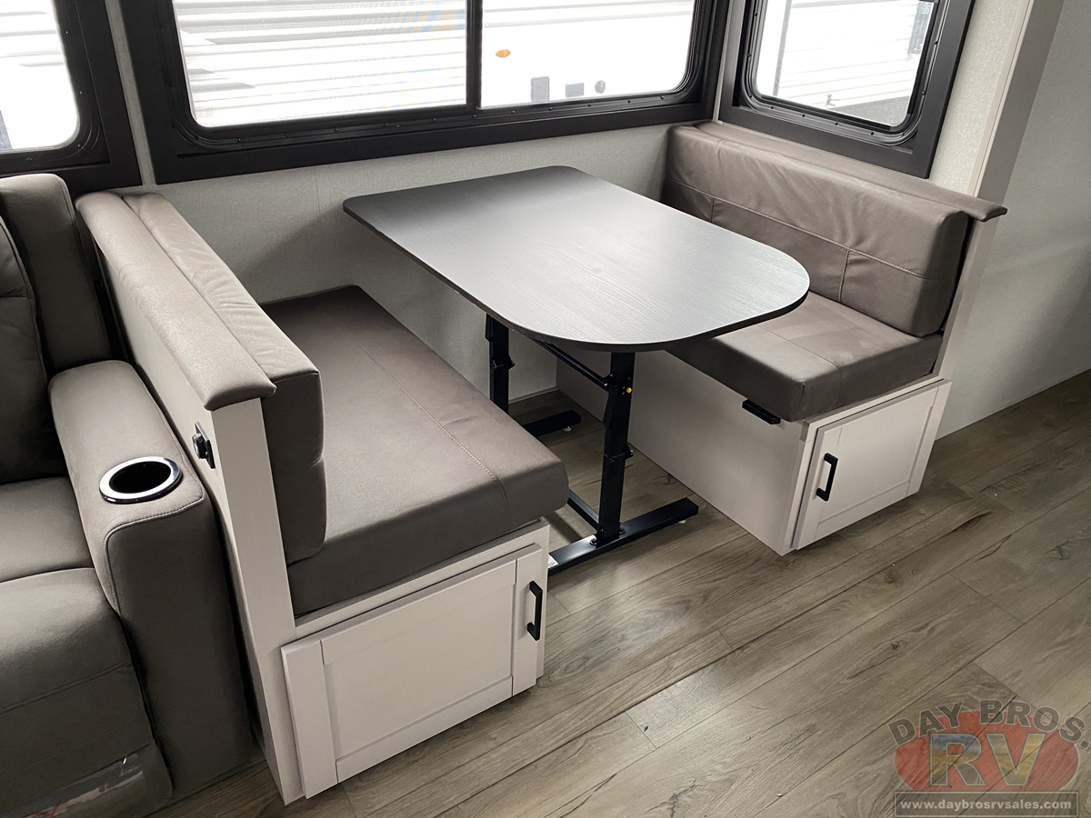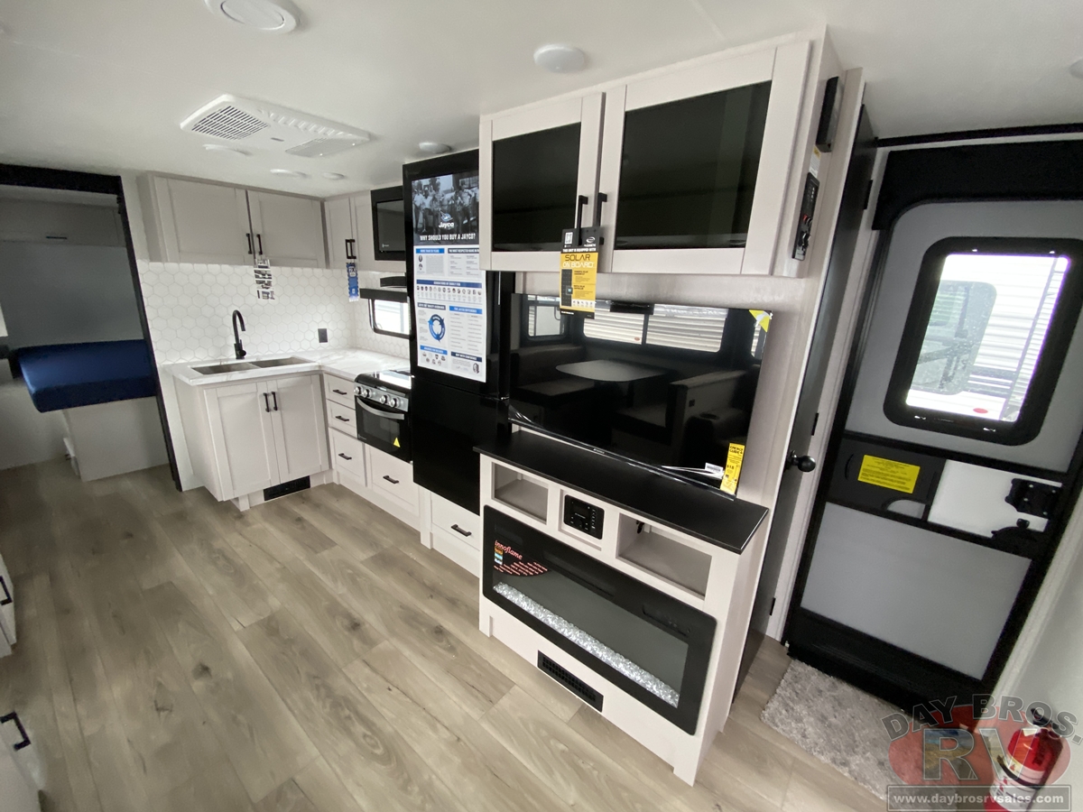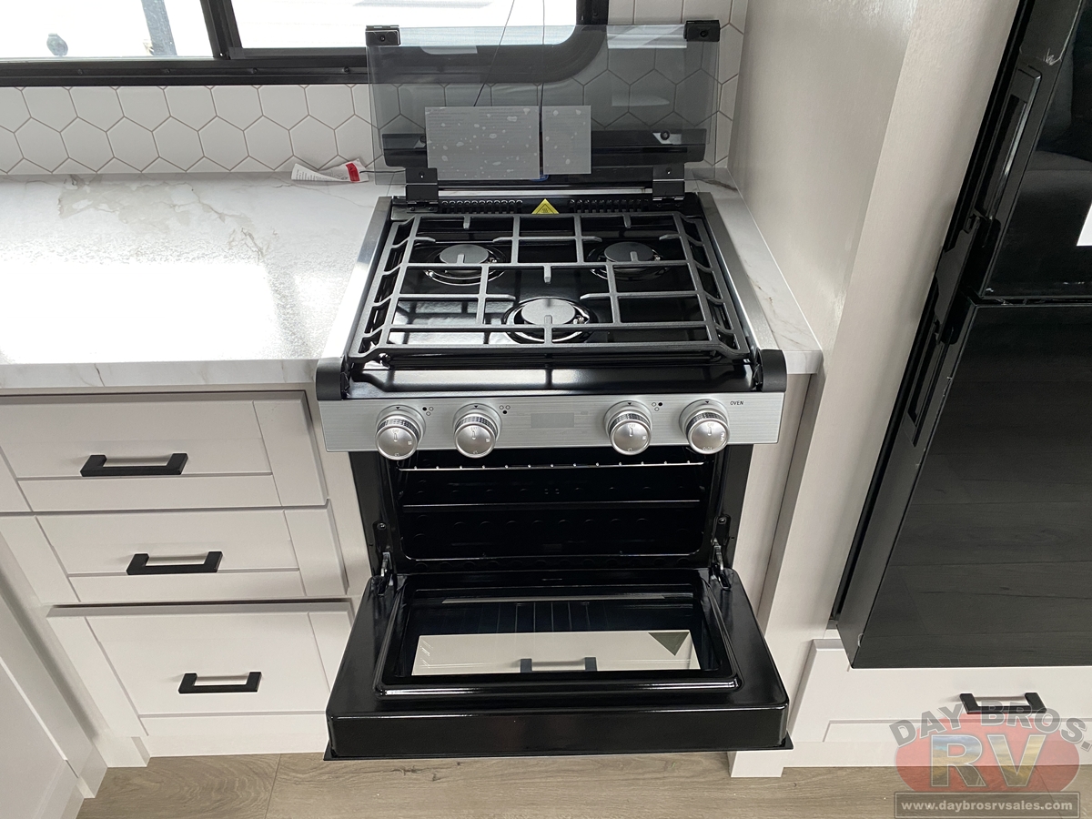 The amenities for 2026 don’t stop there! In the kitchen area, you'll find seamless countertops throughout, a stainless-steel sink with a high-rise faucet and pull-out sprayer. You'll also be blown away by the all-new InVision Suite appliance package with an 11 cubic foot 12V fridge, standard in all Jay Feather models. This fridge has a shiny, black glass front with a two-door fridge over the freezer. Store more on the go with oversized cabinet doors and drawers. The cabinet doors are attached with hidden hinges to give each Jay Feather that sought-after residential look and feel.