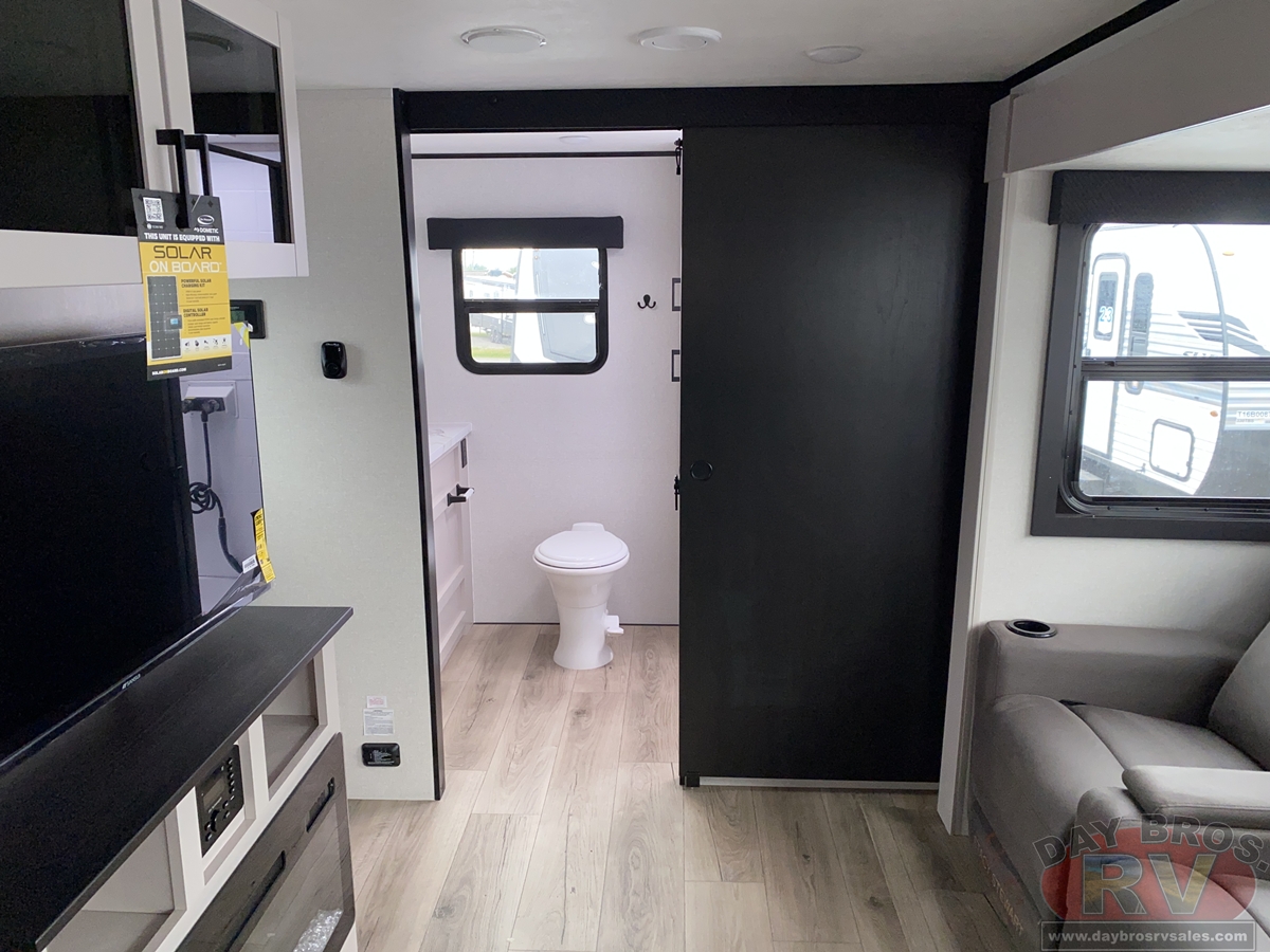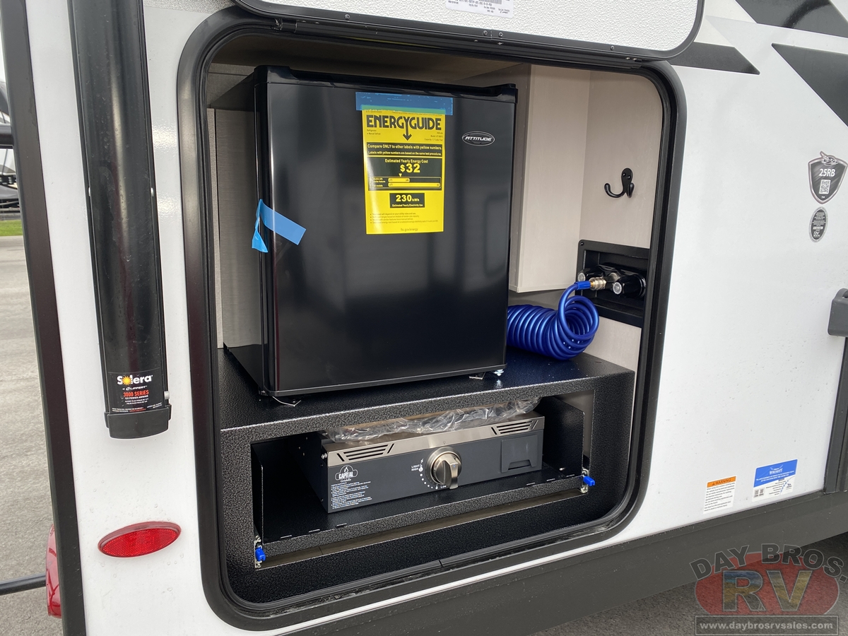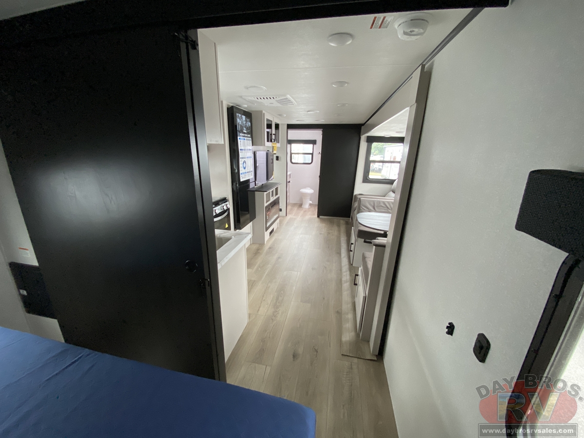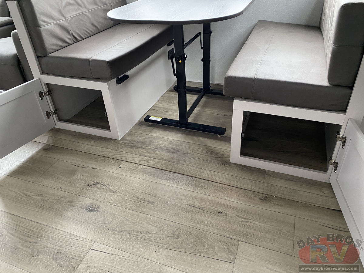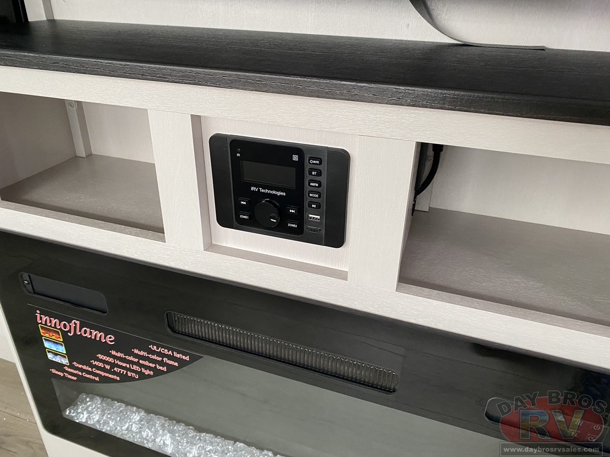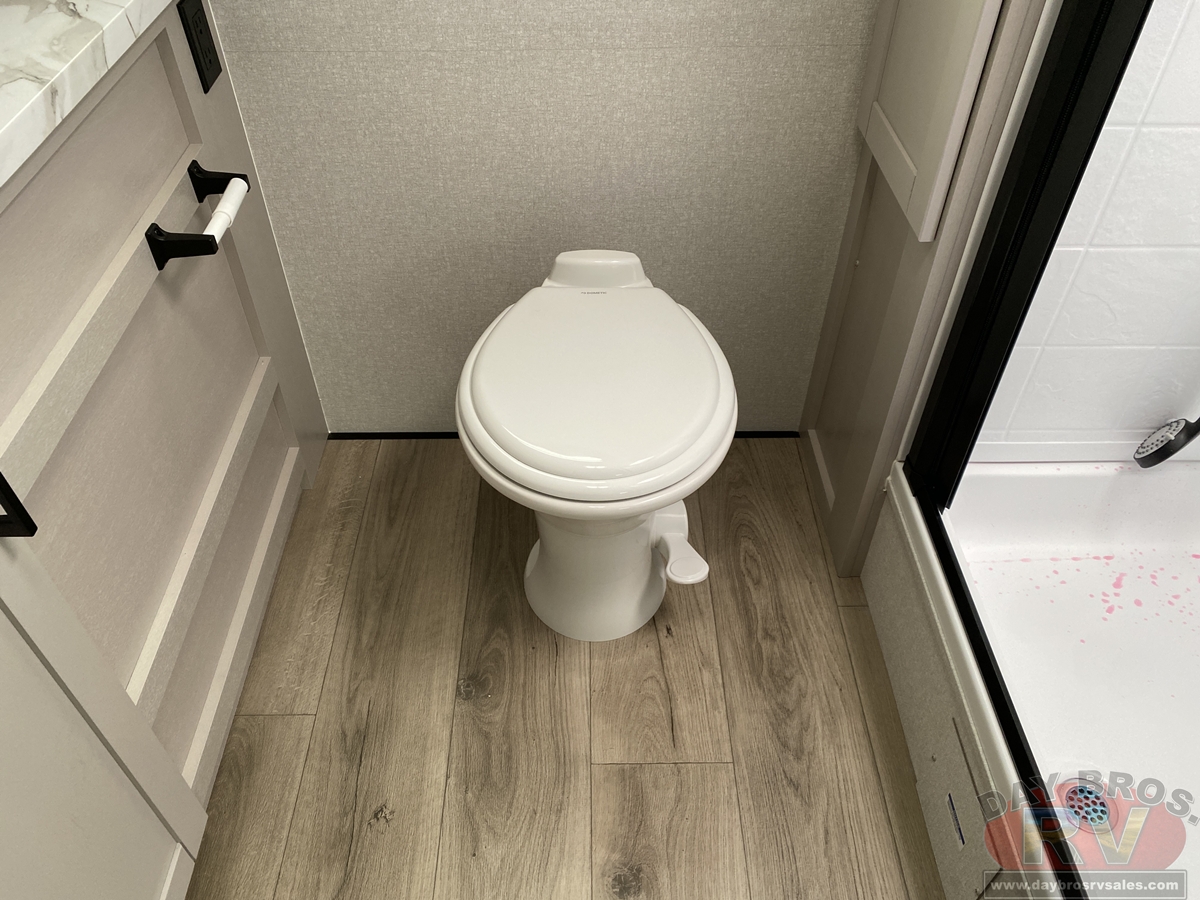 The amenities for 2026 don’t stop there! In the kitchen area, you'll find seamless countertops throughout, a stainless-steel sink with a high-rise faucet and pull-out sprayer. You'll also be blown away by the all-new InVision Suite appliance package with an 11 cubic foot 12V fridge, standard in all Jay Feather models. This fridge has a shiny, black glass front with a two-door fridge over the freezer. Store more on the go with oversized cabinet doors and drawers. The cabinet doors are attached with hidden hinges to give each Jay Feather that sought-after residential look and feel.