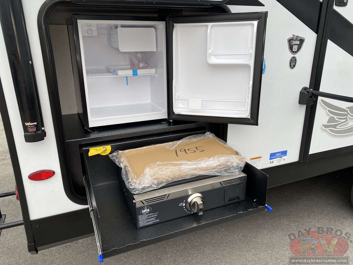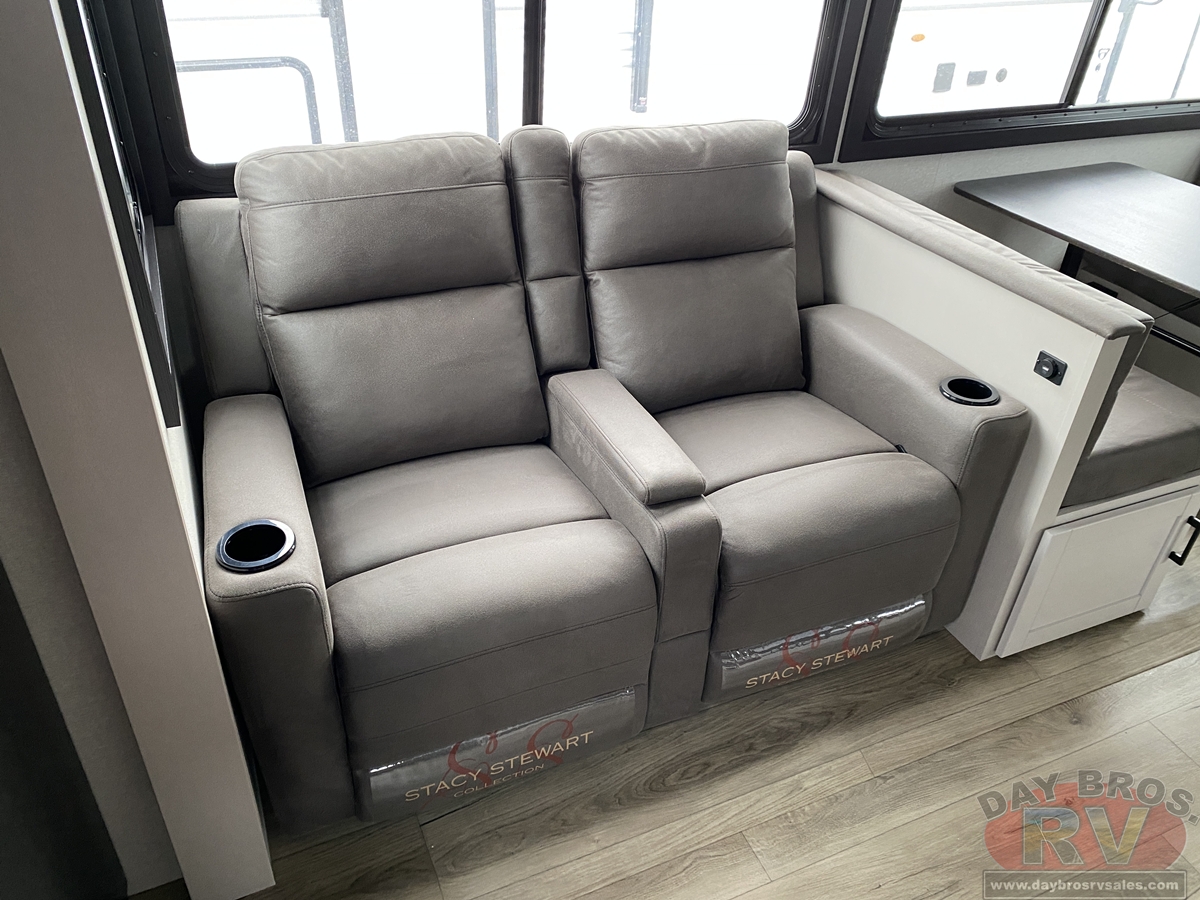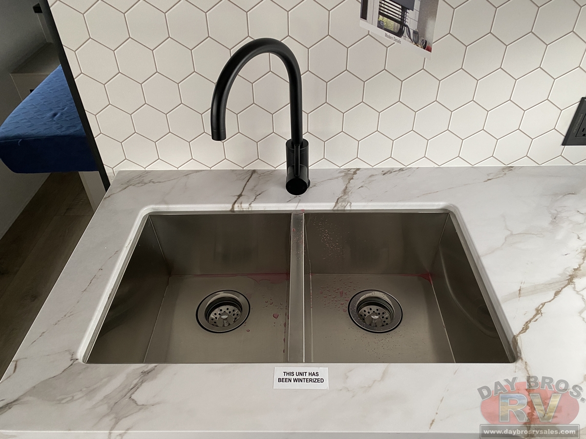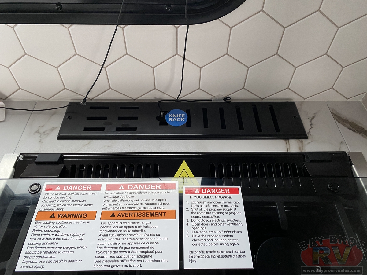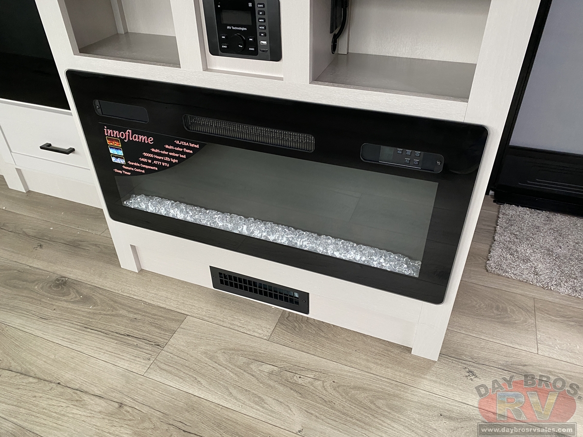 The amenities for 2026 don’t stop there! In the kitchen area, you'll find seamless countertops throughout, a stainless-steel sink with a high-rise faucet and pull-out sprayer. You'll also be blown away by the all-new InVision Suite appliance package with an 11 cubic foot 12V fridge, standard in all Jay Feather models. This fridge has a shiny, black glass front with a two-door fridge over the freezer. Store more on the go with oversized cabinet doors and drawers. The cabinet doors are attached with hidden hinges to give each Jay Feather that sought-after residential look and feel.