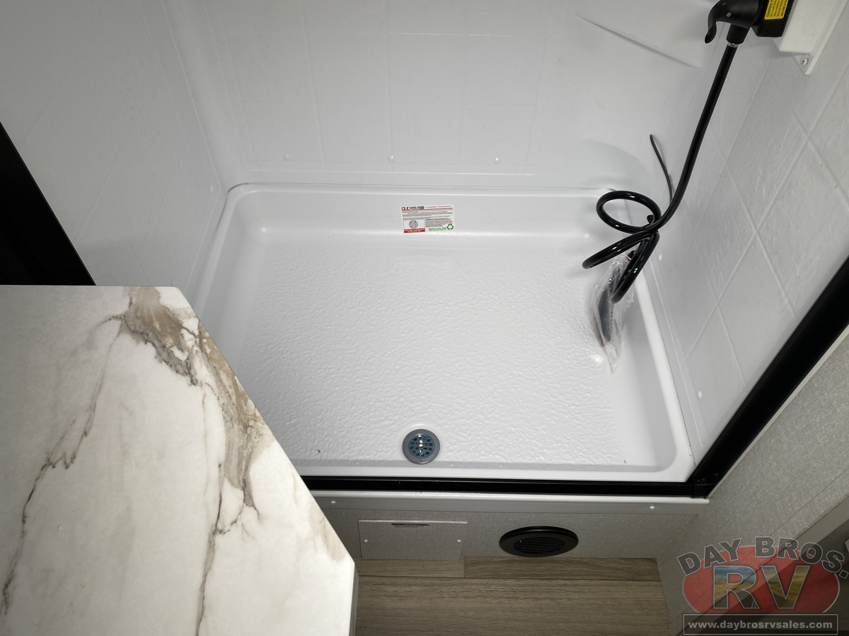 You never have to worry about running out of hot water in the Jay Feather, with the 60,000 BTU on-demand tankless water heater. The 55-gallon freshwater tank and heating element can warm up incoming water from the ground that is on average 55 degrees F.