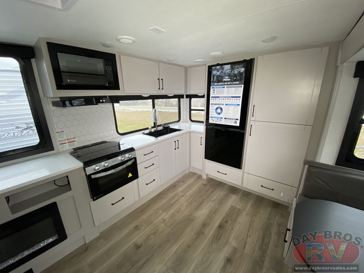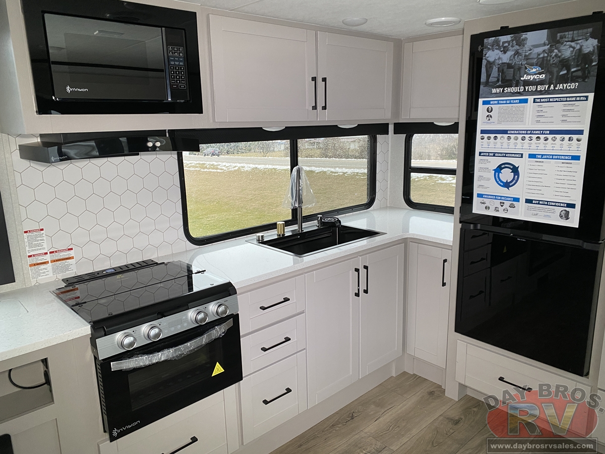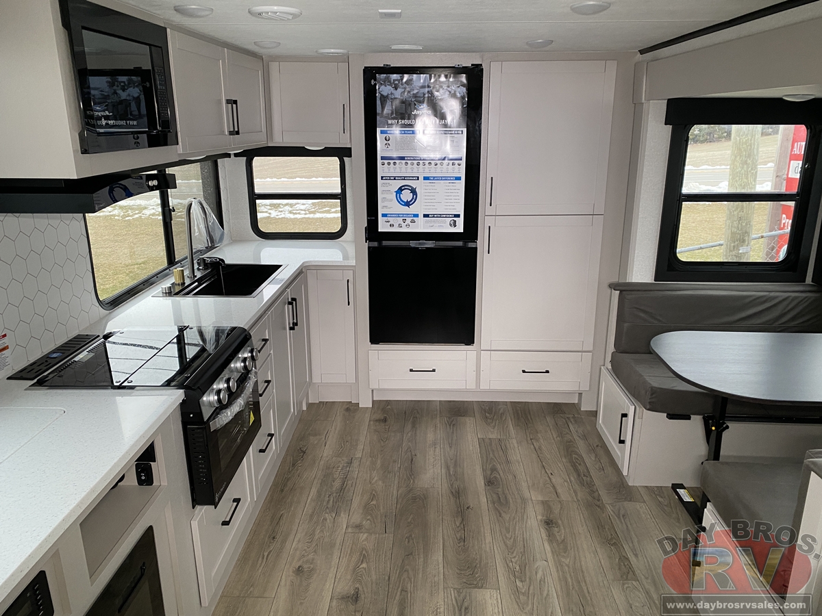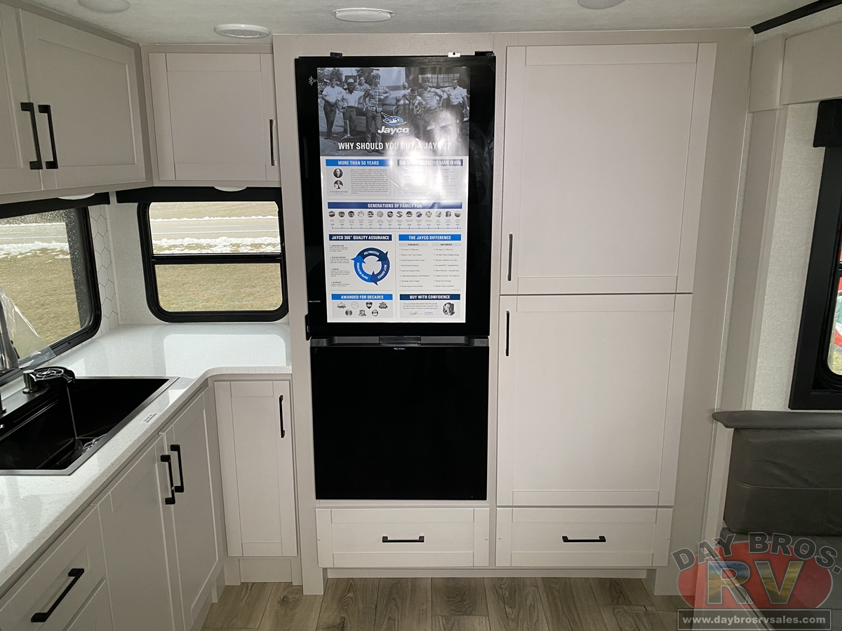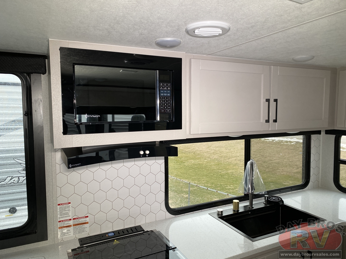 The amenities for 2026 don’t stop there! In the kitchen area, you'll find seamless countertops throughout, a stainless-steel sink with a large window. You'll also be blown away by the all-new InVision Suite appliance package with an 11 cu. ft. 12V fridge, standard in all Jay Feather models. This fridge has a shiny, black glass front with a two-door fridge over the freezer. Store more on the go with oversized cabinet doors and drawers. The cabinet doors are attached with hidden hinges to give each Jay Feather that sought-after residential look and feel.