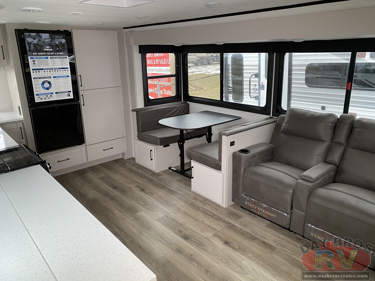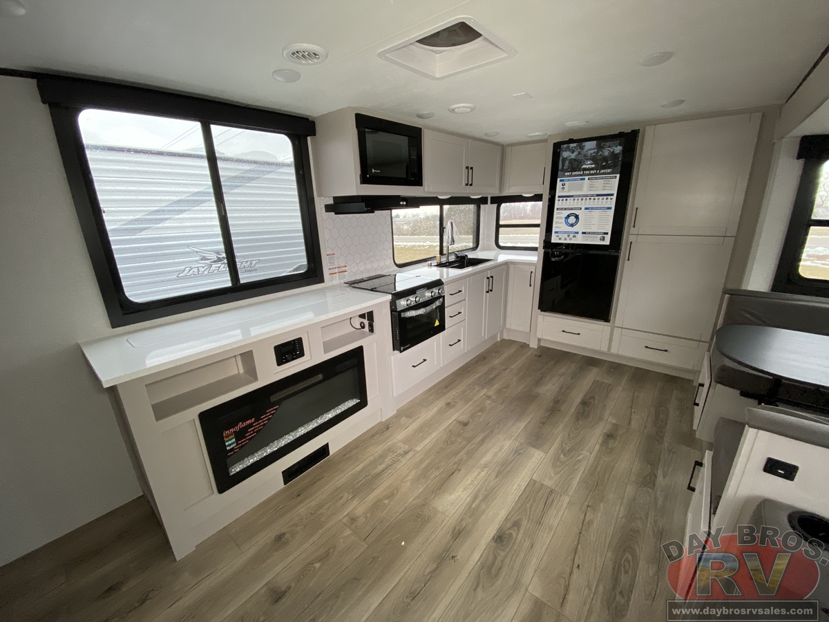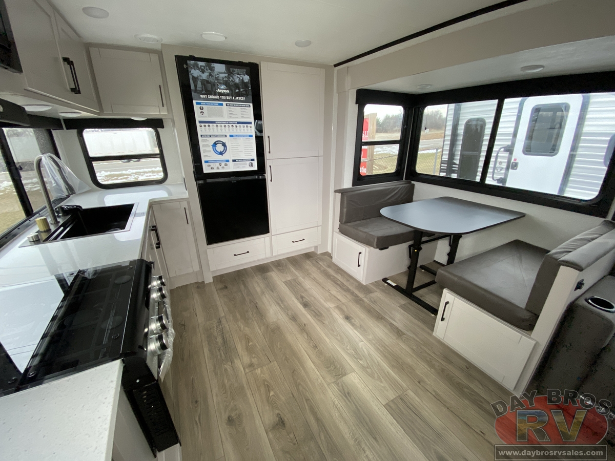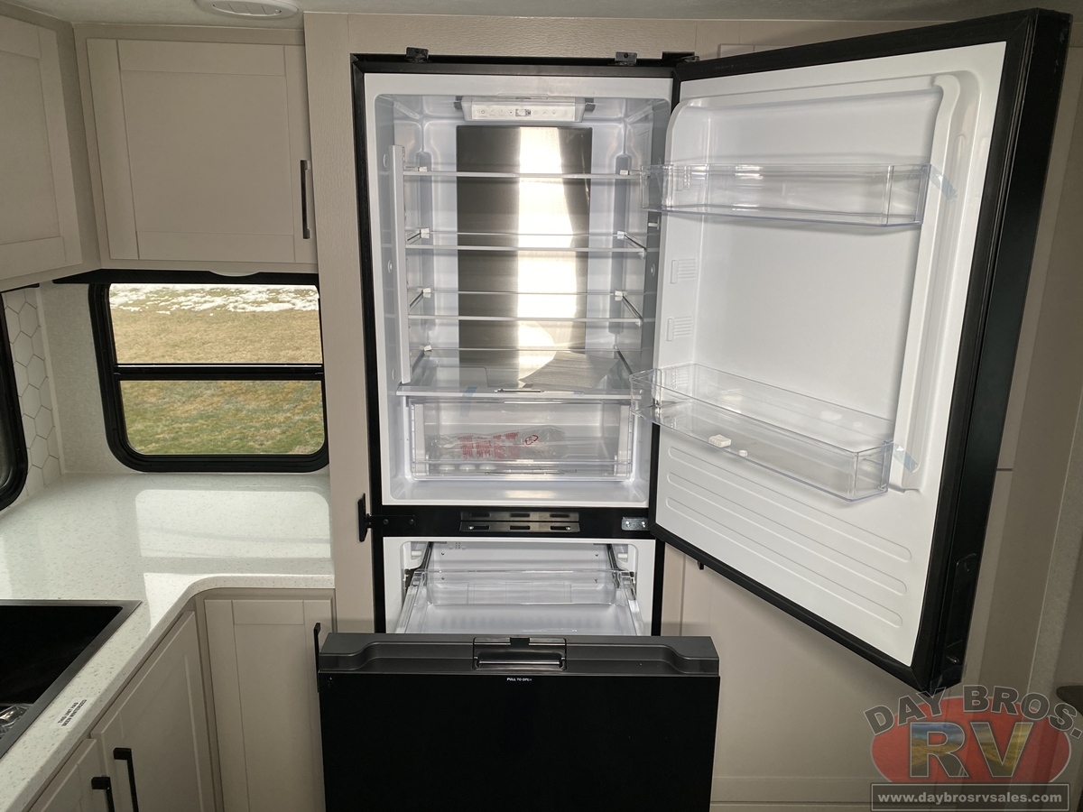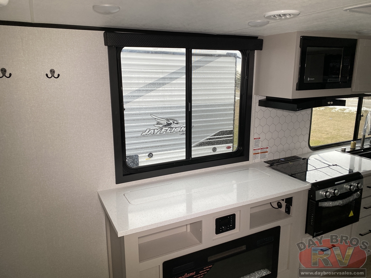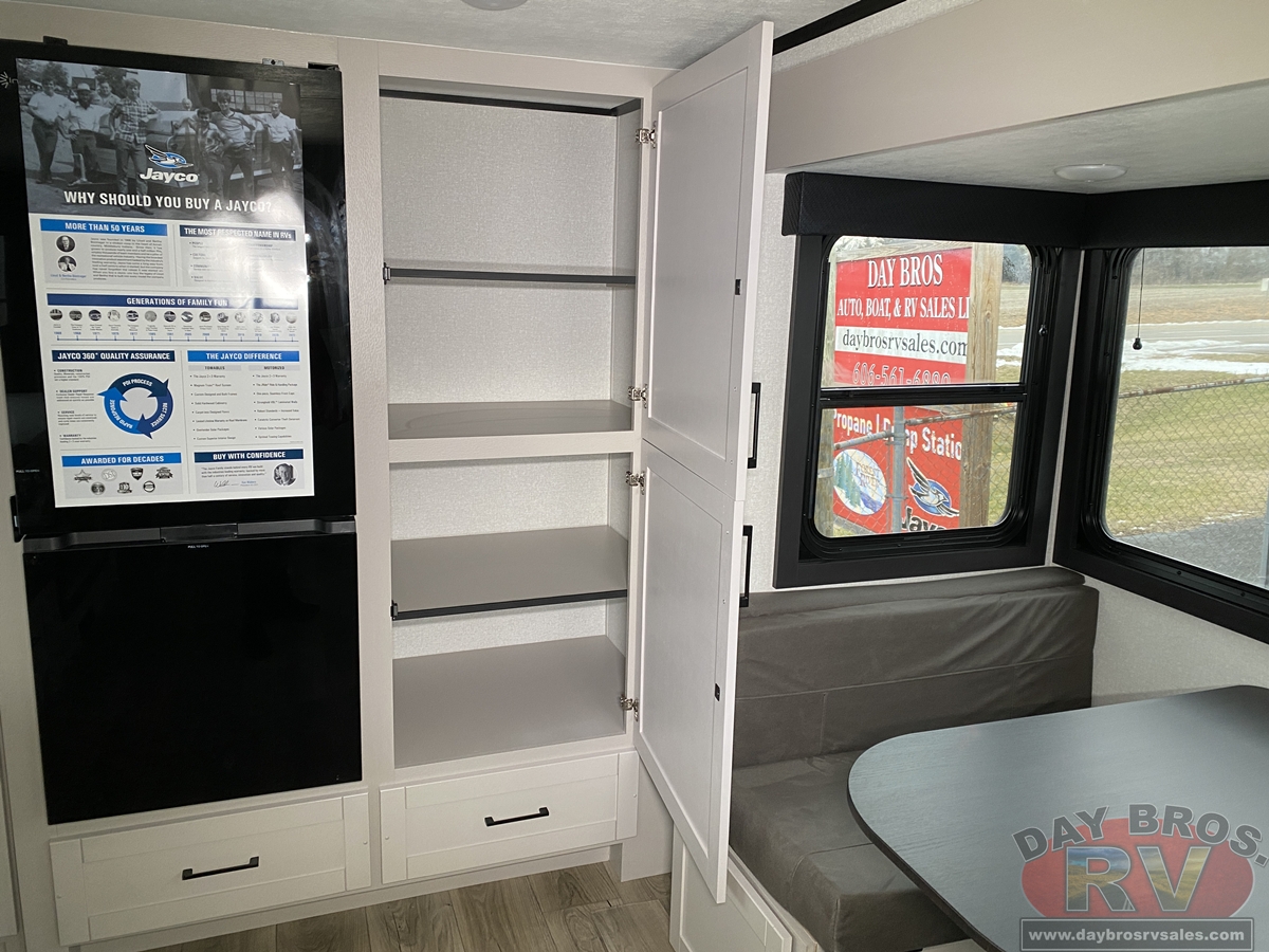 The amenities for 2026 don’t stop there! In the kitchen area, you'll find seamless countertops throughout, a stainless-steel sink with a large window. You'll also be blown away by the all-new InVision Suite appliance package with an 11 cu. ft. 12V fridge, standard in all Jay Feather models. This fridge has a shiny, black glass front with a two-door fridge over the freezer. Store more on the go with oversized cabinet doors and drawers. The cabinet doors are attached with hidden hinges to give each Jay Feather that sought-after residential look and feel.