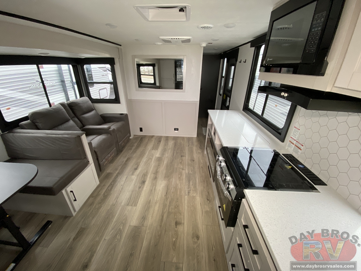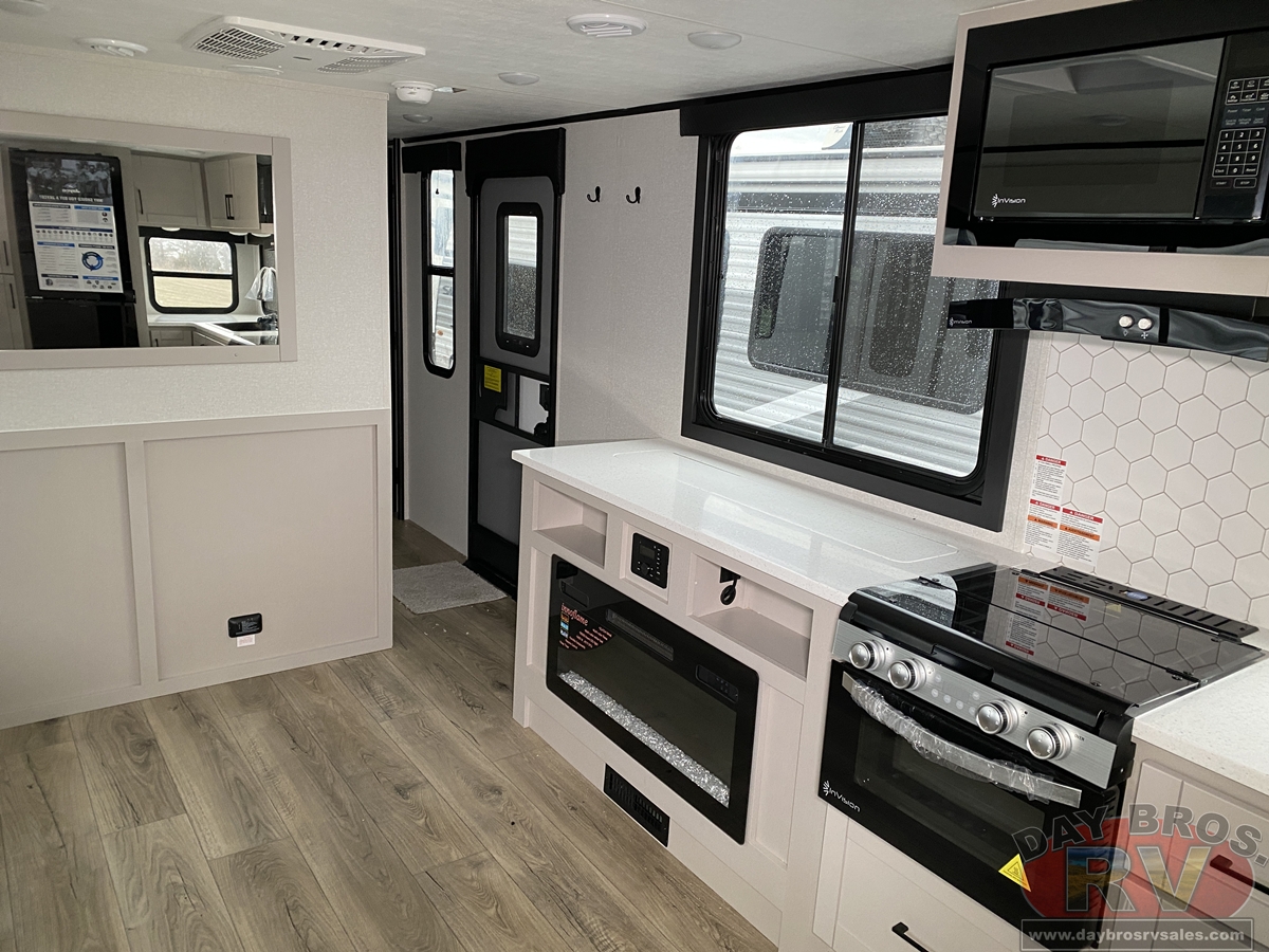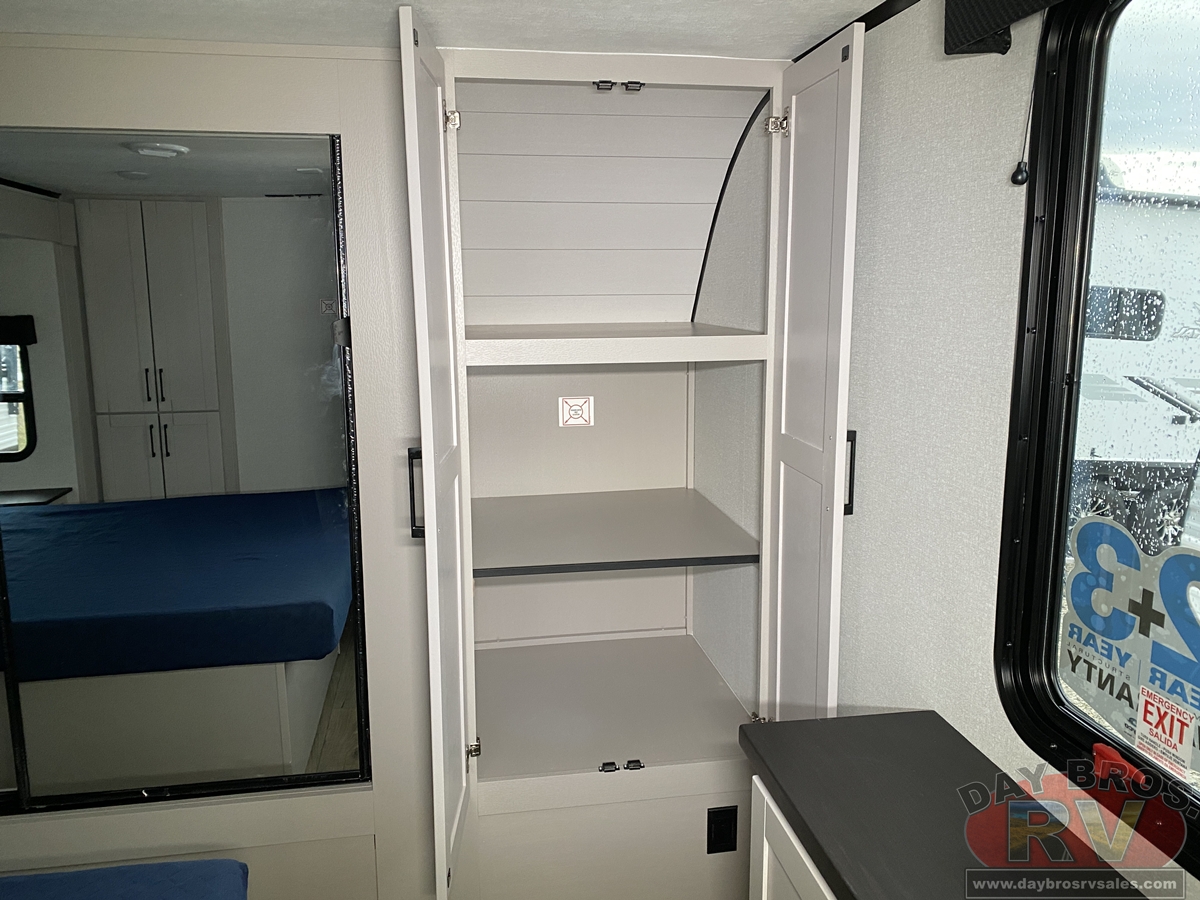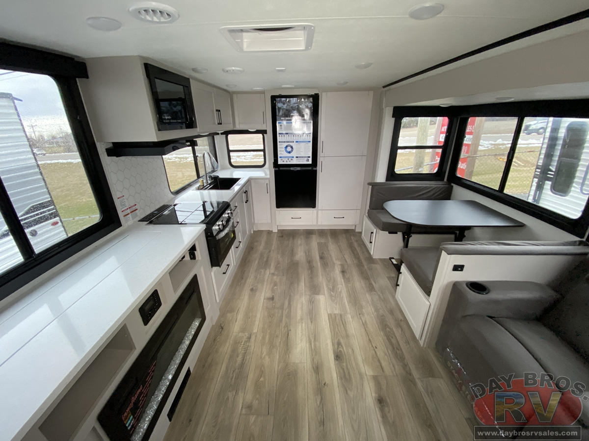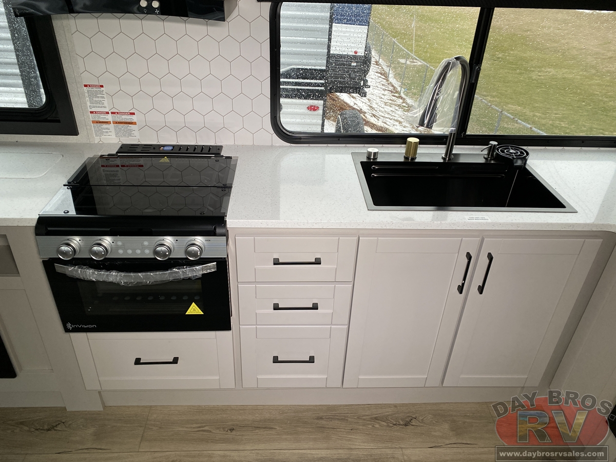 The amenities for 2026 don’t stop there! In the kitchen area, you'll find seamless countertops throughout, a stainless-steel sink with a large window. You'll also be blown away by the all-new InVision Suite appliance package with an 11 cu. ft. 12V fridge, standard in all Jay Feather models. This fridge has a shiny, black glass front with a two-door fridge over the freezer. Store more on the go with oversized cabinet doors and drawers. The cabinet doors are attached with hidden hinges to give each Jay Feather that sought-after residential look and feel.