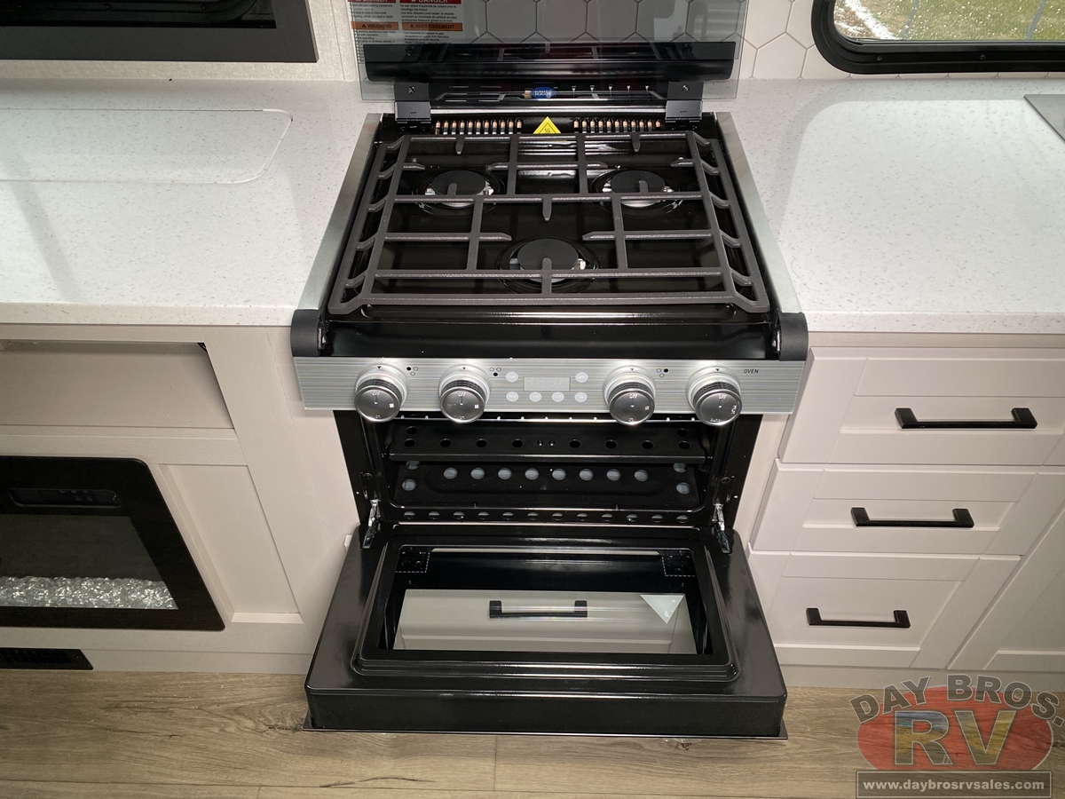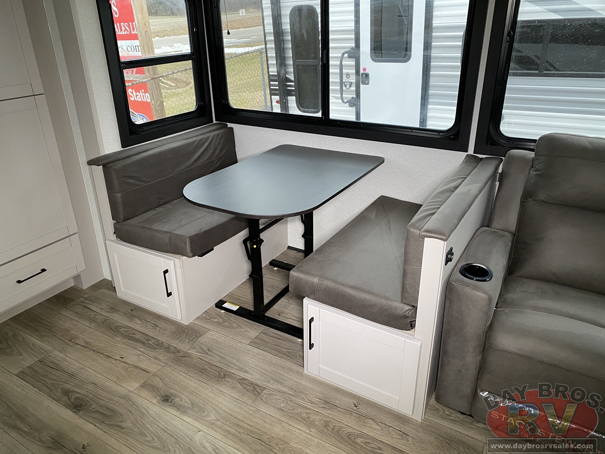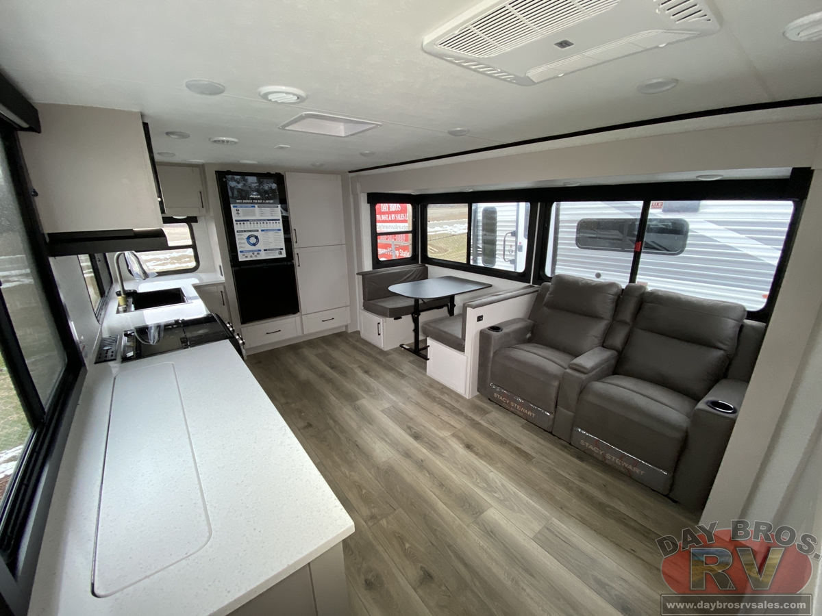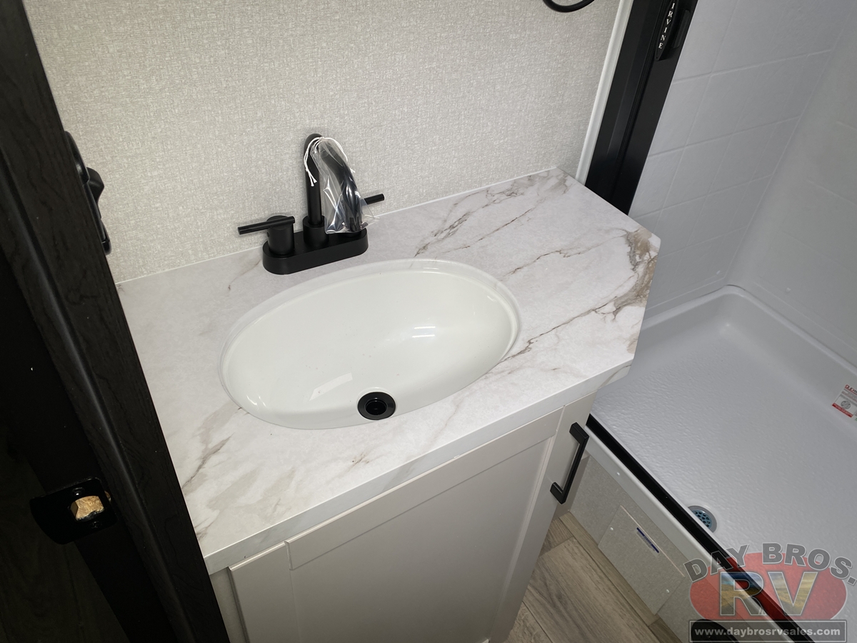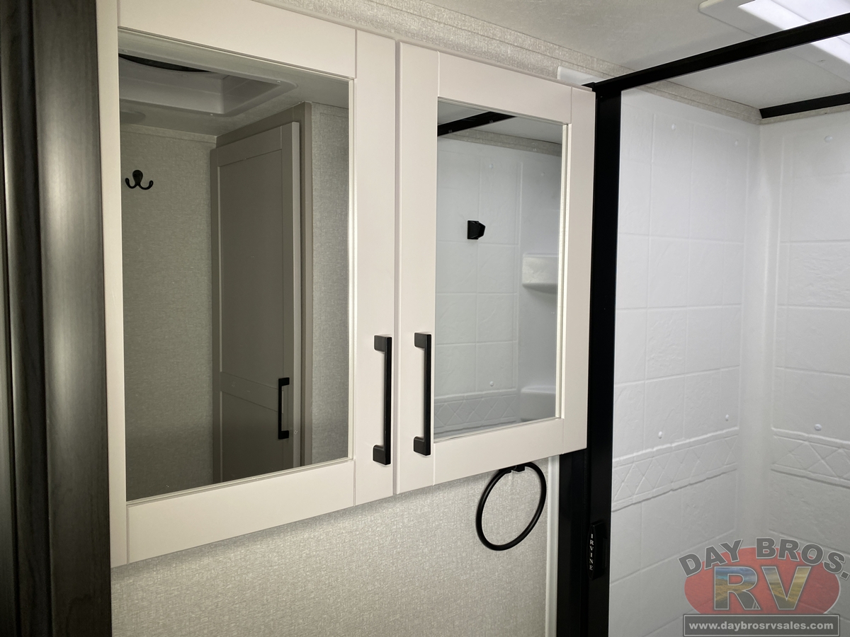 The amenities for 2026 don’t stop there! In the kitchen area, you'll find seamless countertops throughout, a stainless-steel sink with a large window. You'll also be blown away by the all-new InVision Suite appliance package with an 11 cu. ft. 12V fridge, standard in all Jay Feather models. This fridge has a shiny, black glass front with a two-door fridge over the freezer. Store more on the go with oversized cabinet doors and drawers. The cabinet doors are attached with hidden hinges to give each Jay Feather that sought-after residential look and feel.