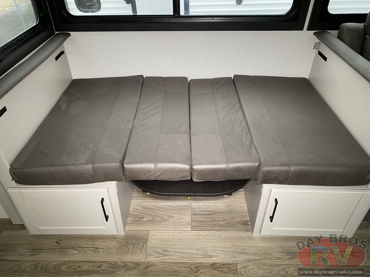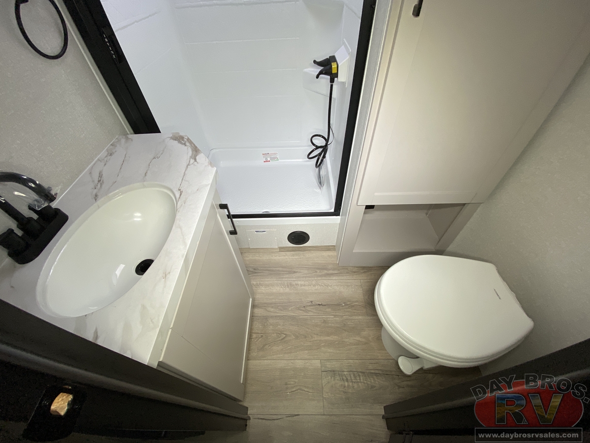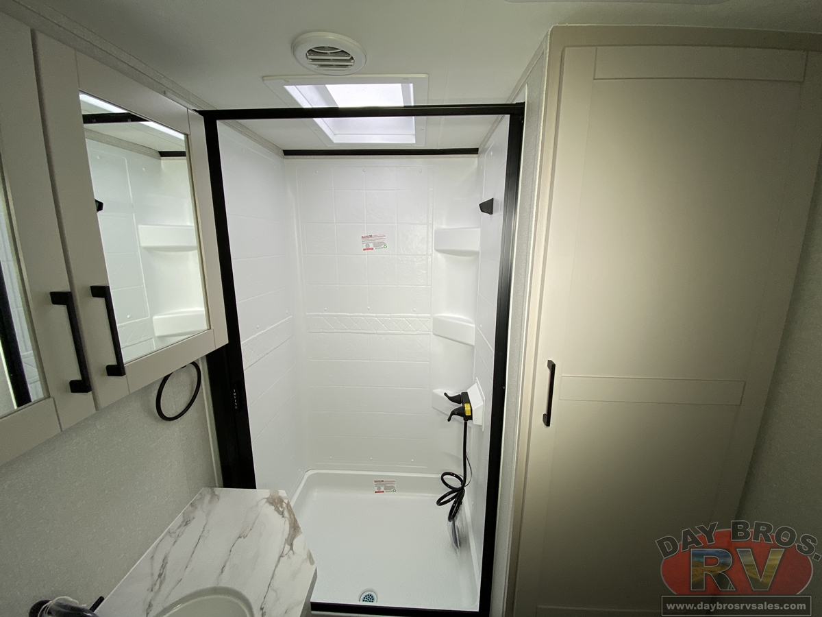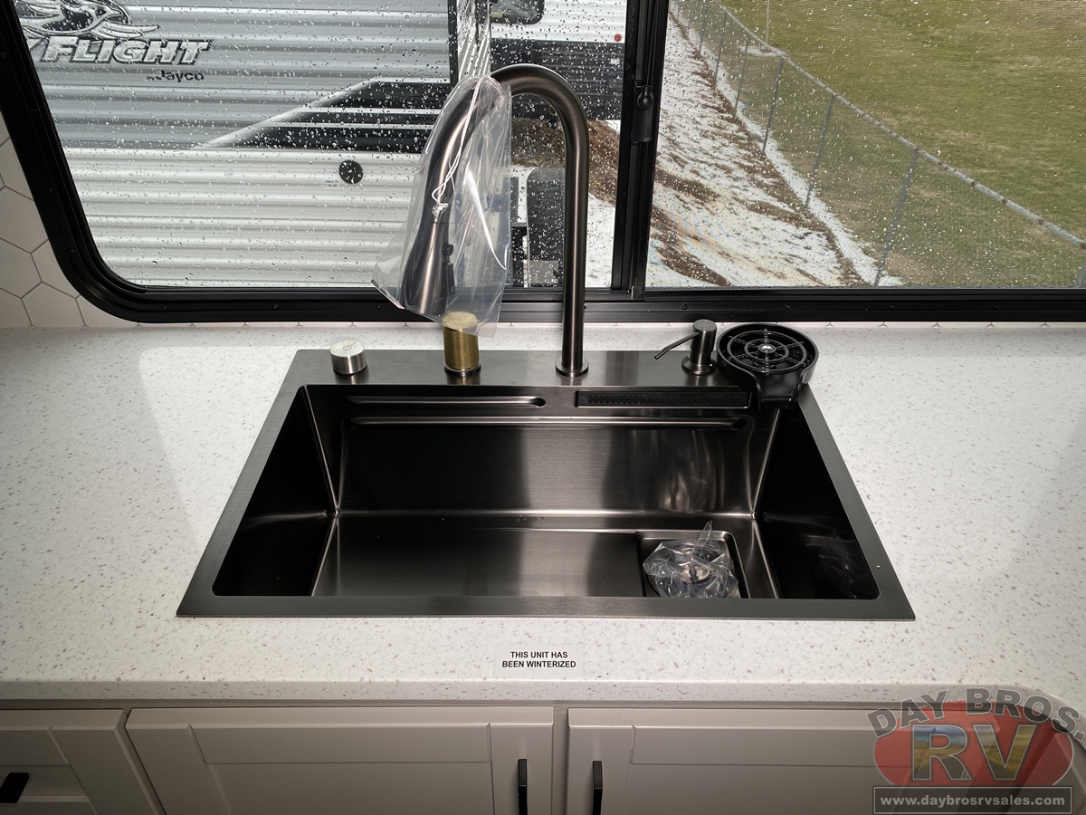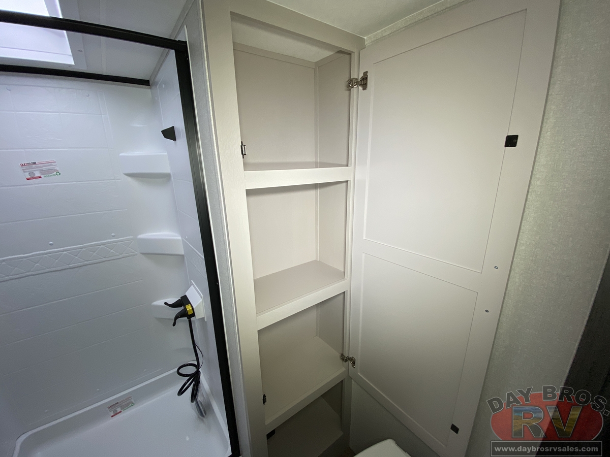 The amenities for 2026 don’t stop there! In the kitchen area, you'll find seamless countertops throughout, a stainless-steel sink with a large window. You'll also be blown away by the all-new InVision Suite appliance package with an 11 cu. ft. 12V fridge, standard in all Jay Feather models. This fridge has a shiny, black glass front with a two-door fridge over the freezer. Store more on the go with oversized cabinet doors and drawers. The cabinet doors are attached with hidden hinges to give each Jay Feather that sought-after residential look and feel.