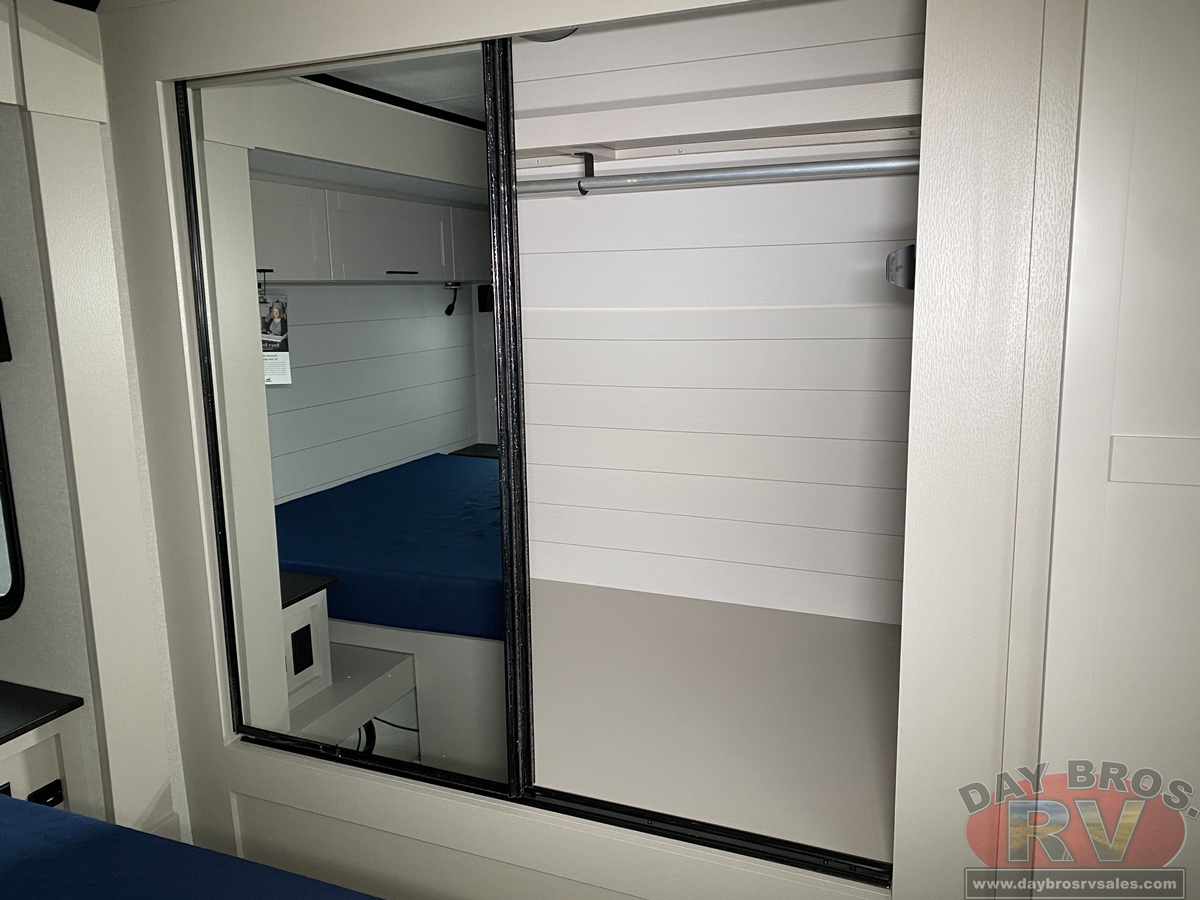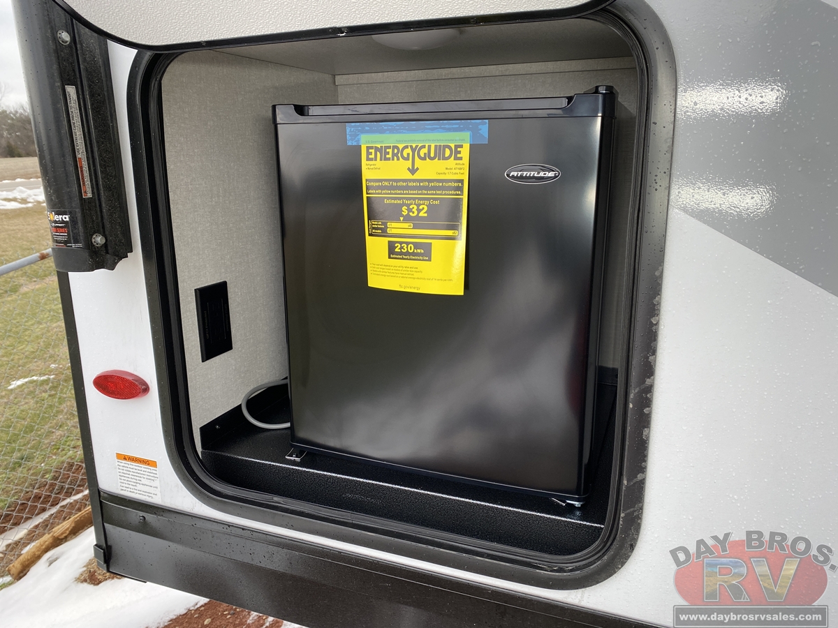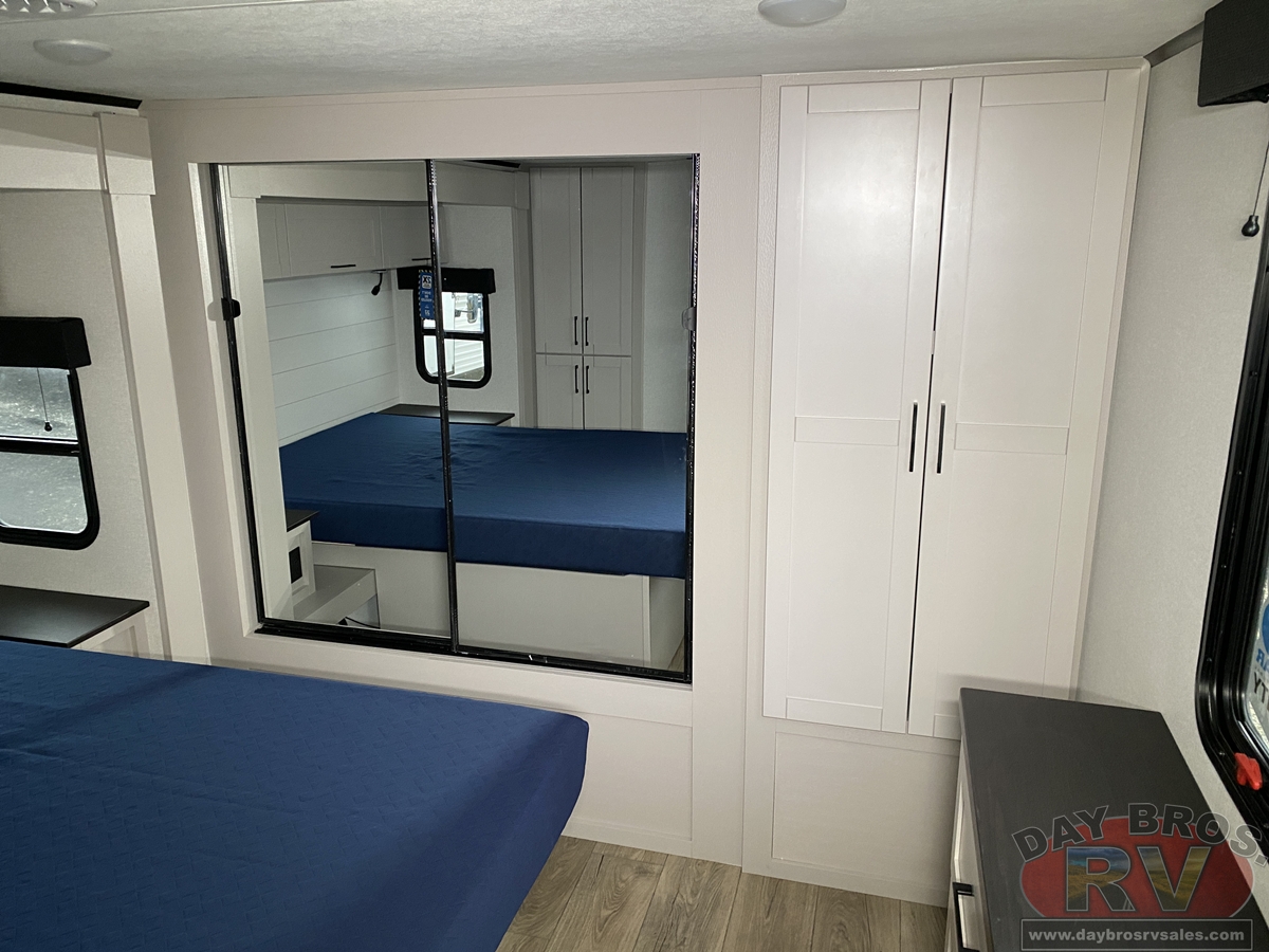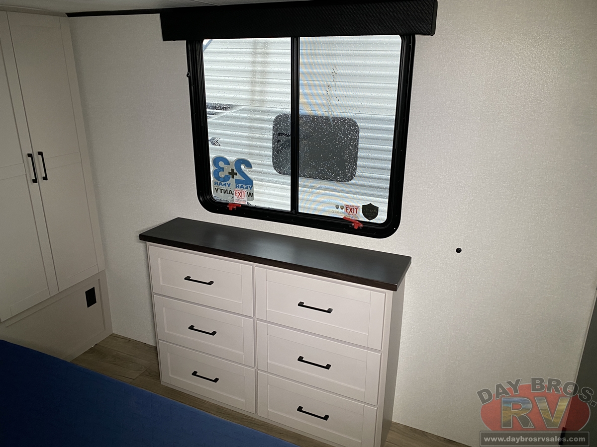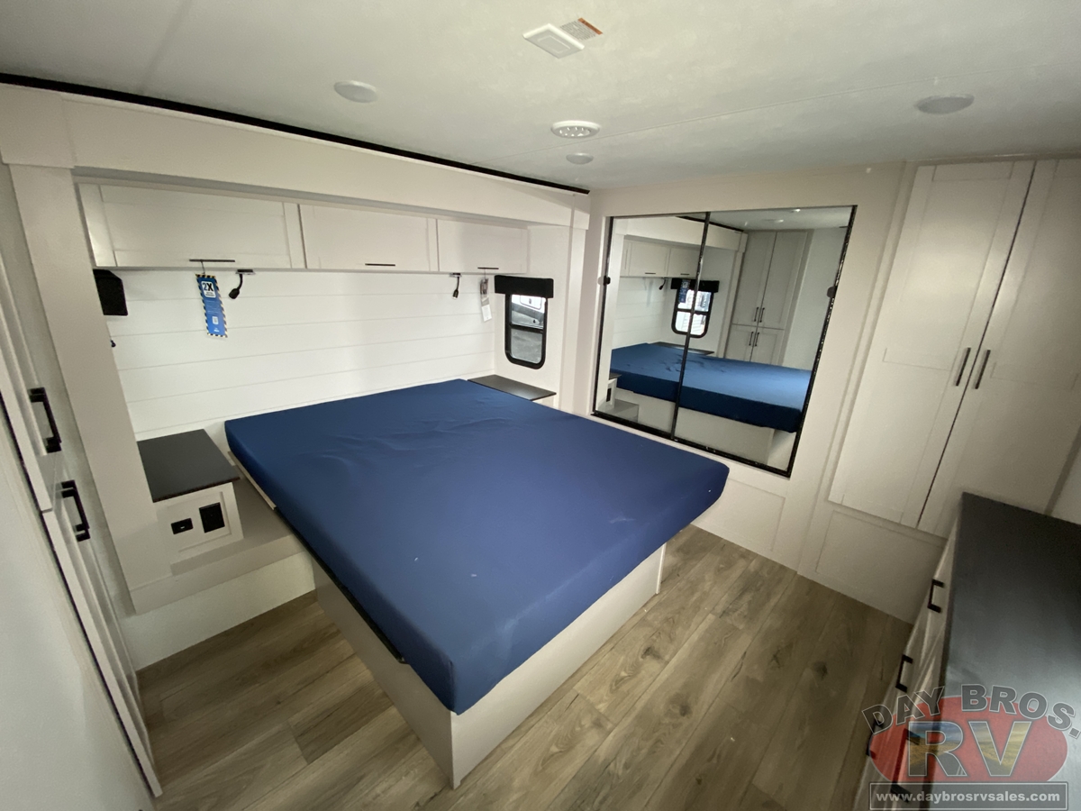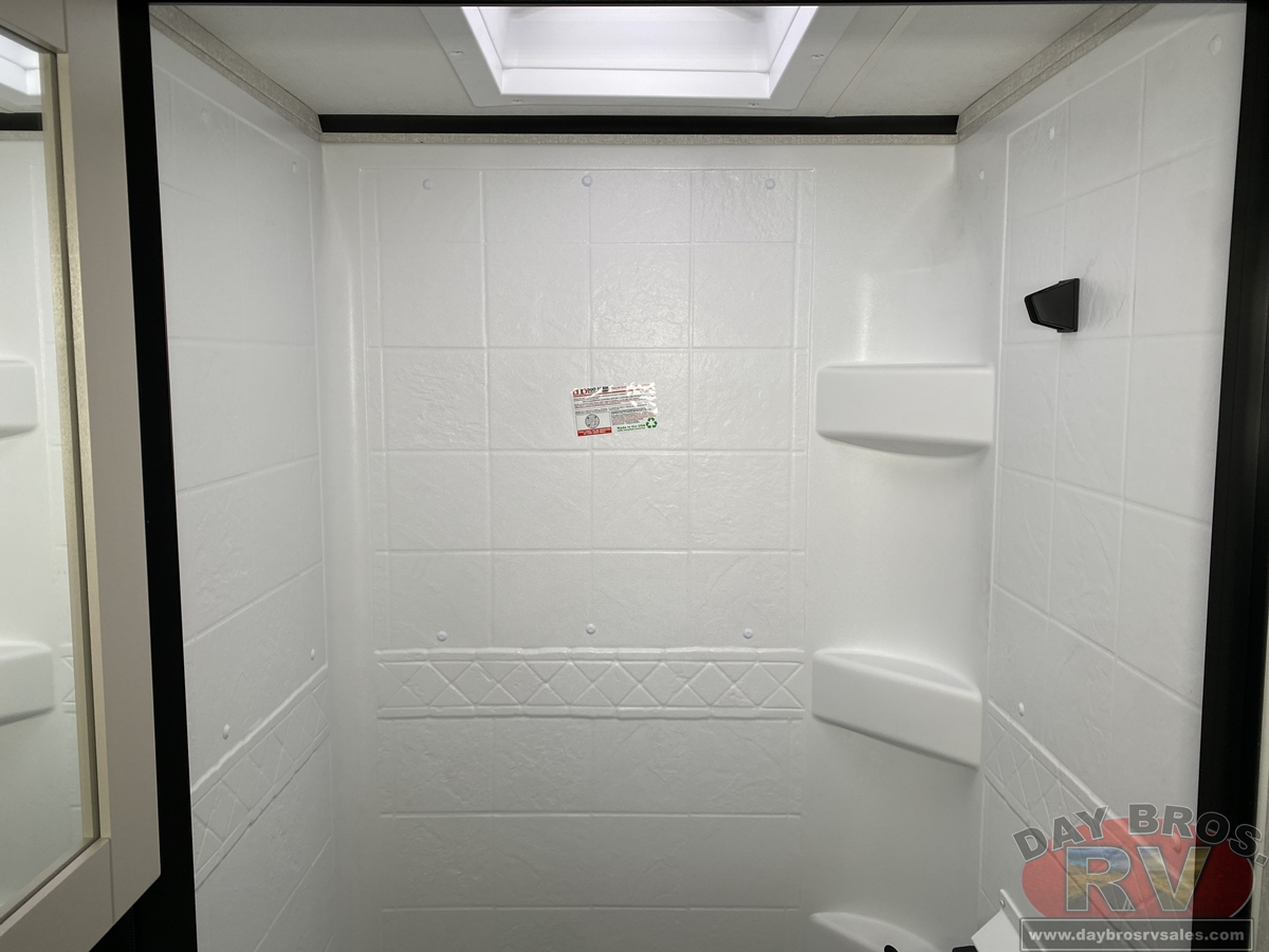 The amenities for 2026 don’t stop there! In the kitchen area, you'll find seamless countertops throughout, a stainless-steel sink with a large window. You'll also be blown away by the all-new InVision Suite appliance package with an 11 cu. ft. 12V fridge, standard in all Jay Feather models. This fridge has a shiny, black glass front with a two-door fridge over the freezer. Store more on the go with oversized cabinet doors and drawers. The cabinet doors are attached with hidden hinges to give each Jay Feather that sought-after residential look and feel.