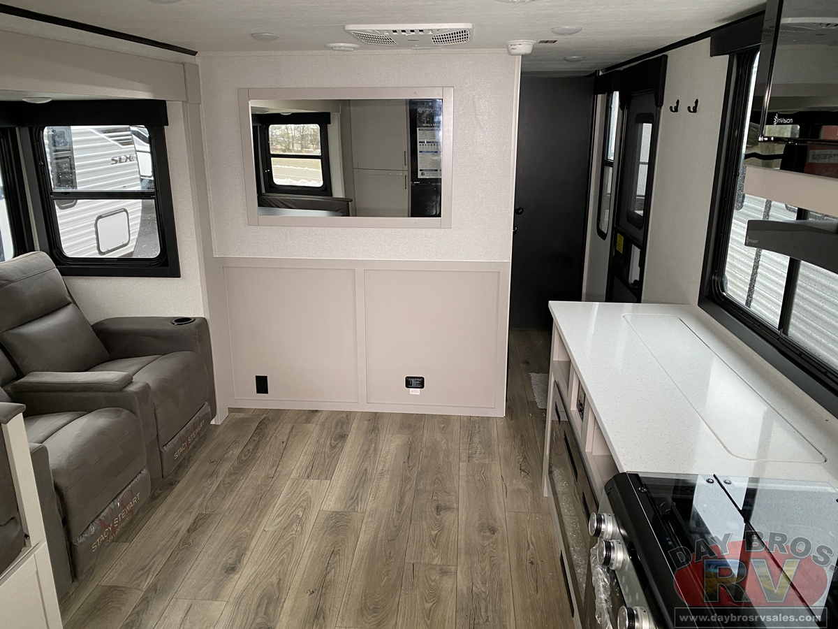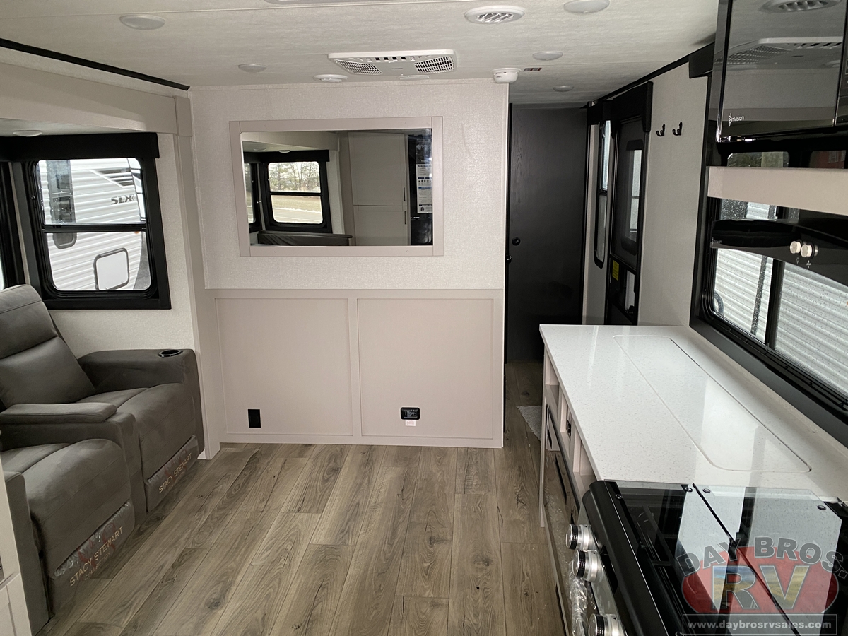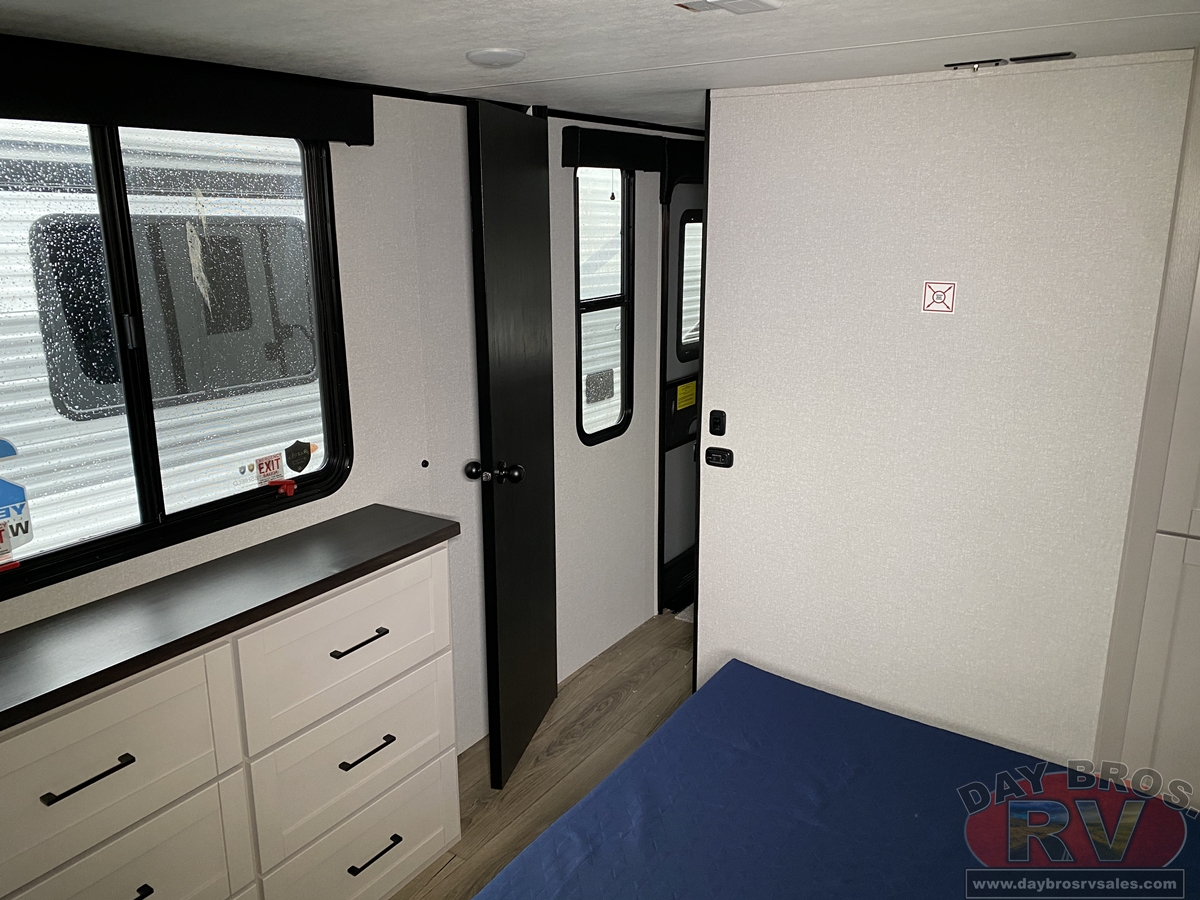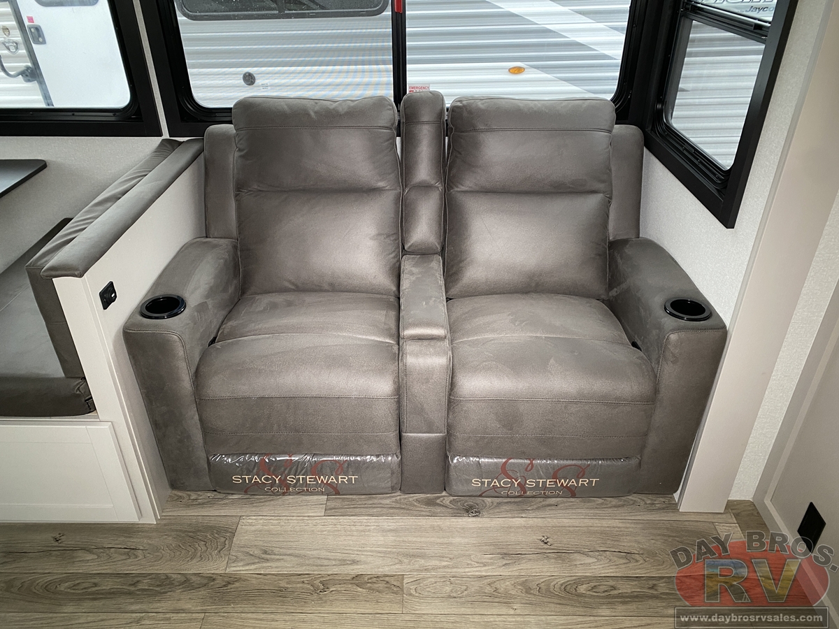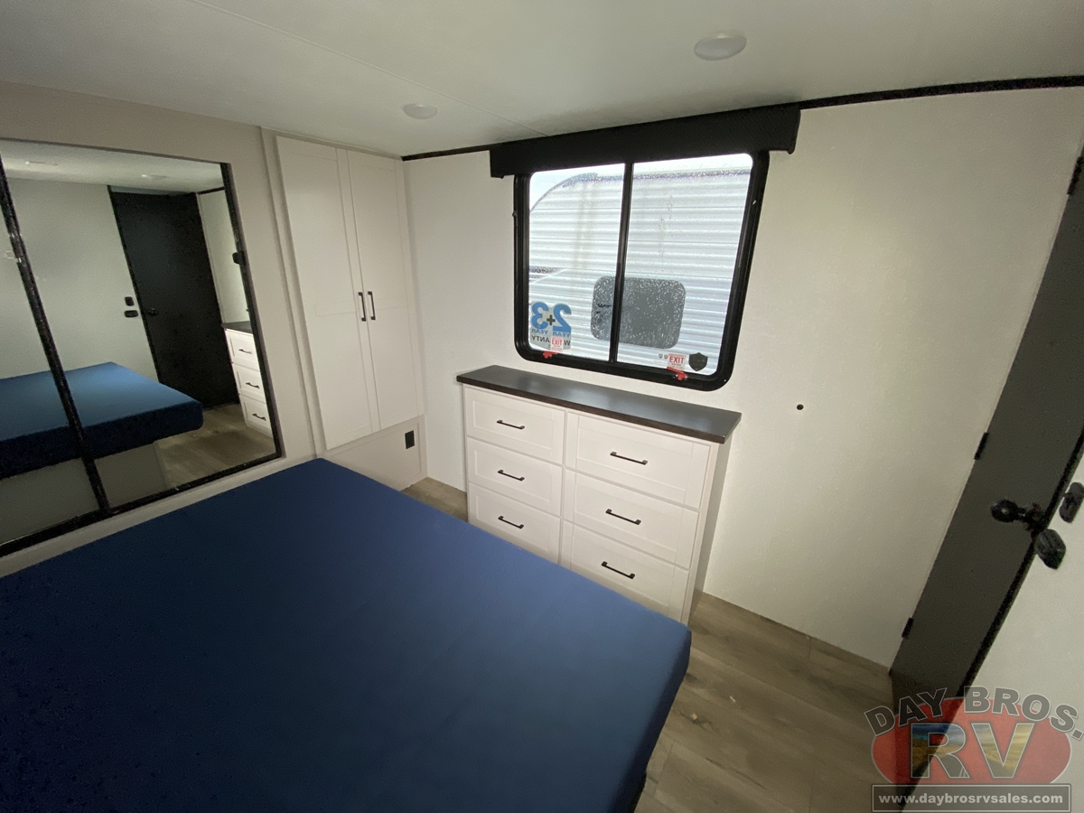 The amenities for 2026 don’t stop there! In the kitchen area, you'll find seamless countertops throughout, a stainless-steel sink with a large window. You'll also be blown away by the all-new InVision Suite appliance package with an 11 cu. ft. 12V fridge, standard in all Jay Feather models. This fridge has a shiny, black glass front with a two-door fridge over the freezer. Store more on the go with oversized cabinet doors and drawers. The cabinet doors are attached with hidden hinges to give each Jay Feather that sought-after residential look and feel.