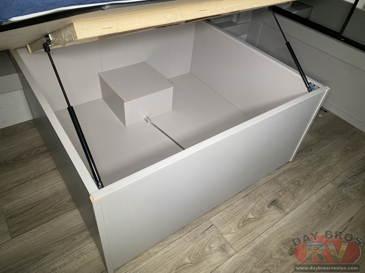 - Gas-strutted under-bed storage (most models)