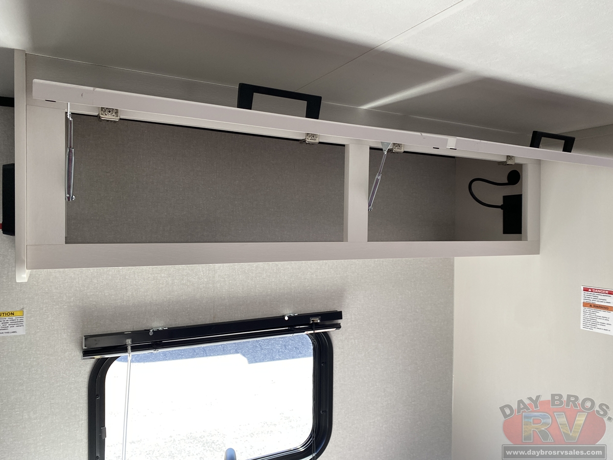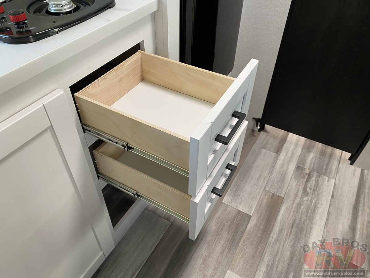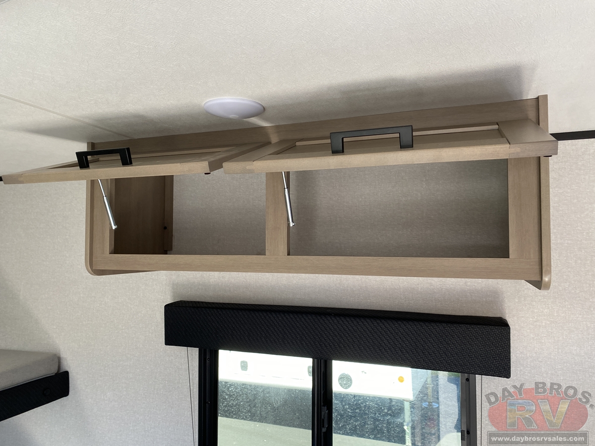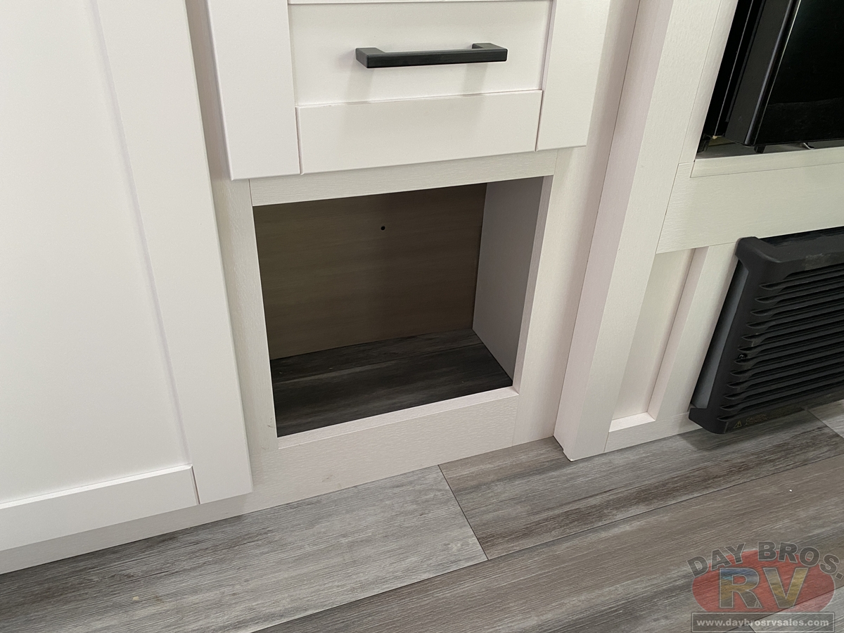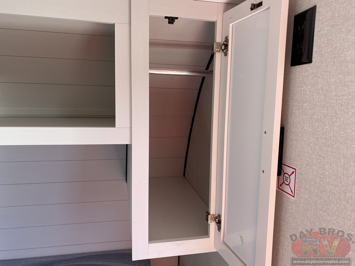 Inside, you’ll find solid hardwood cabinet doors with hidden hinges, giving the space a modern, residential feel. Oversized cabinets and under-bed storage ensure there’s room for everything you need, while the lit exterior passthrough storage makes packing and unpacking a breeze.