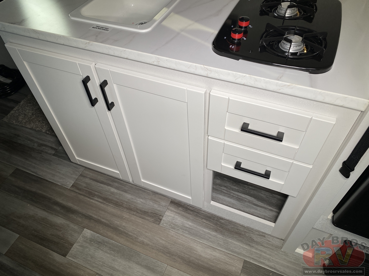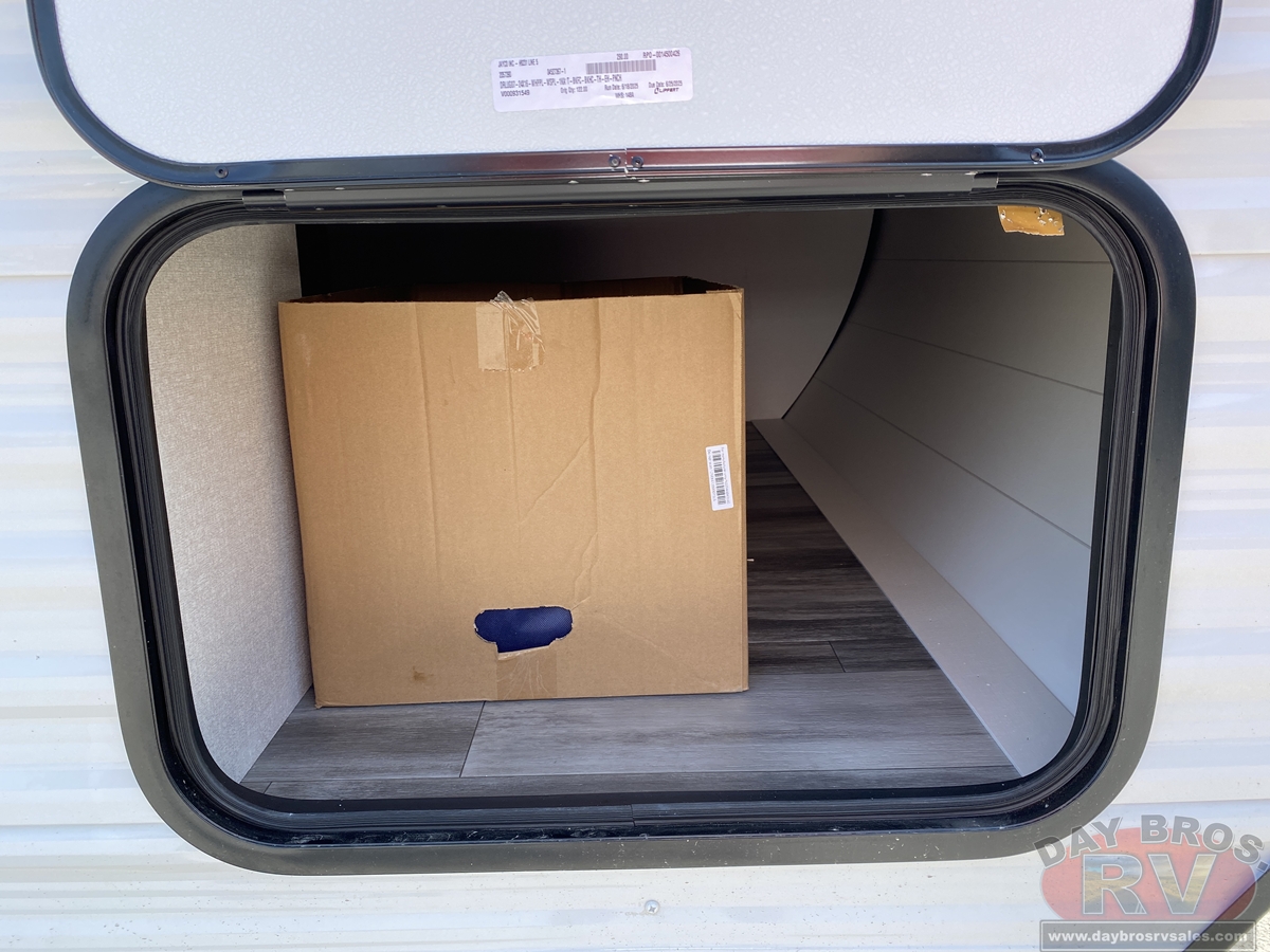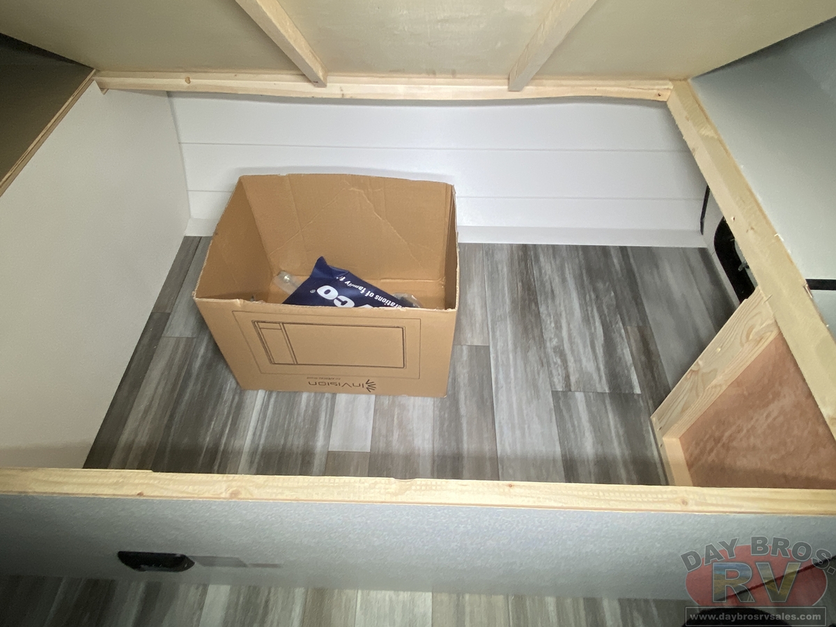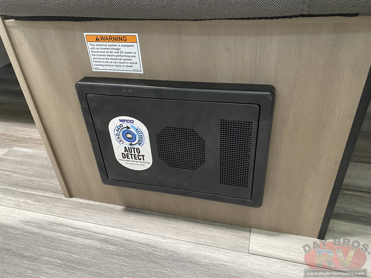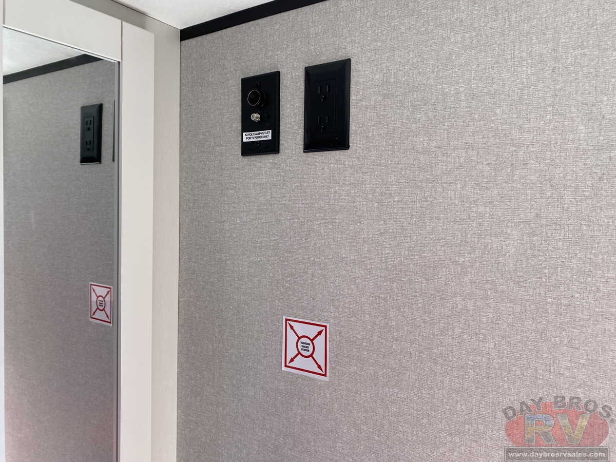 Inside, you’ll find solid hardwood cabinet doors with hidden hinges, giving the space a modern, residential feel. Oversized cabinets and under-bed storage ensure there’s room for everything you need, while the lit exterior passthrough storage makes packing and unpacking a breeze.