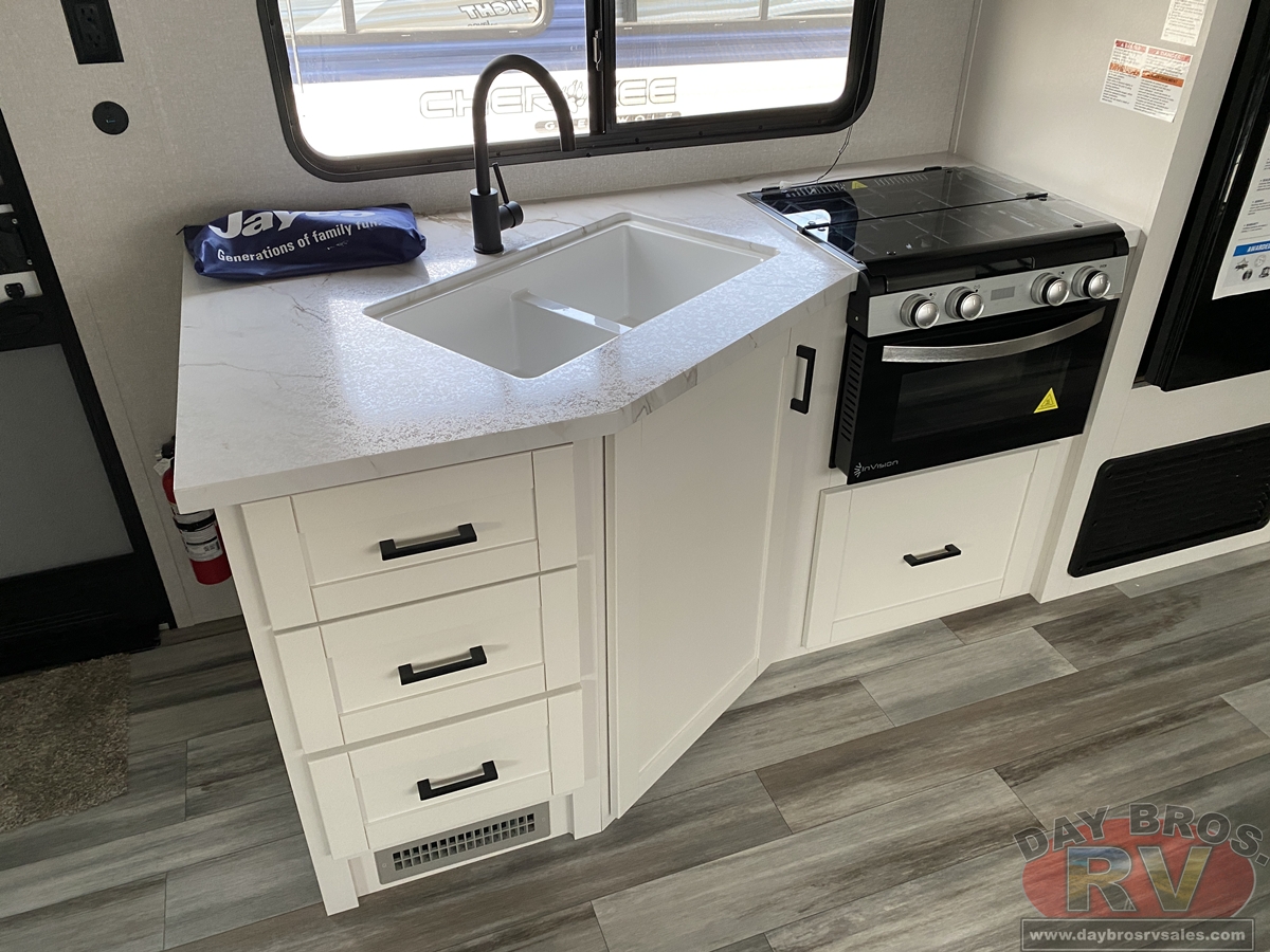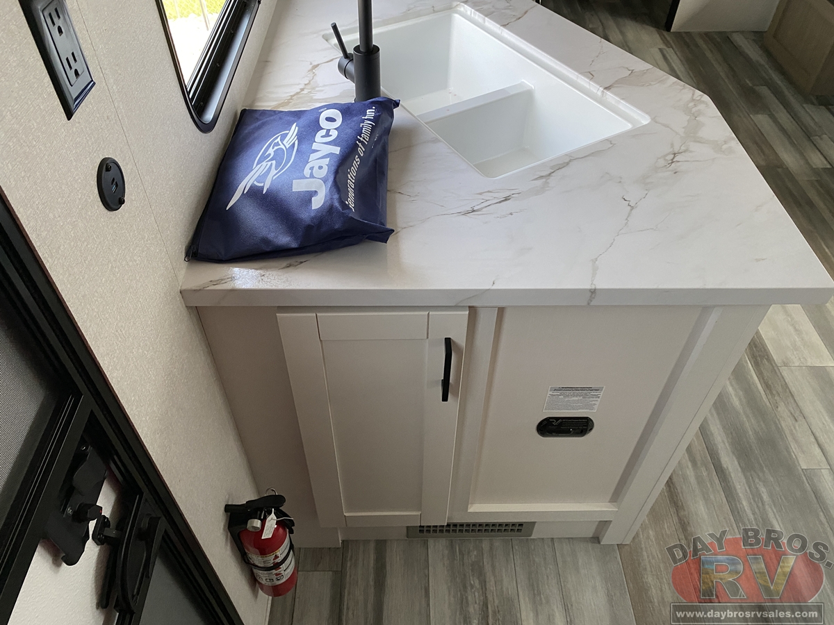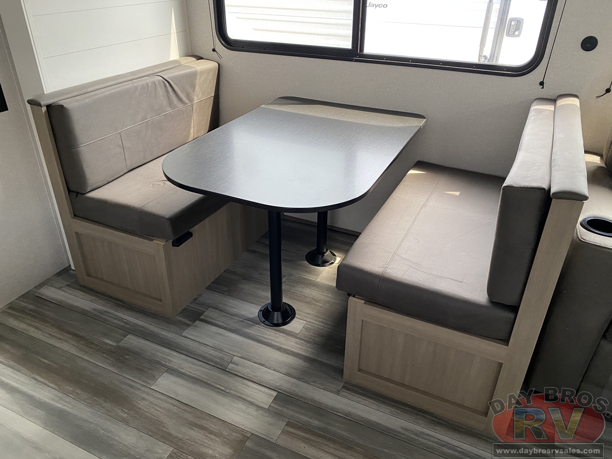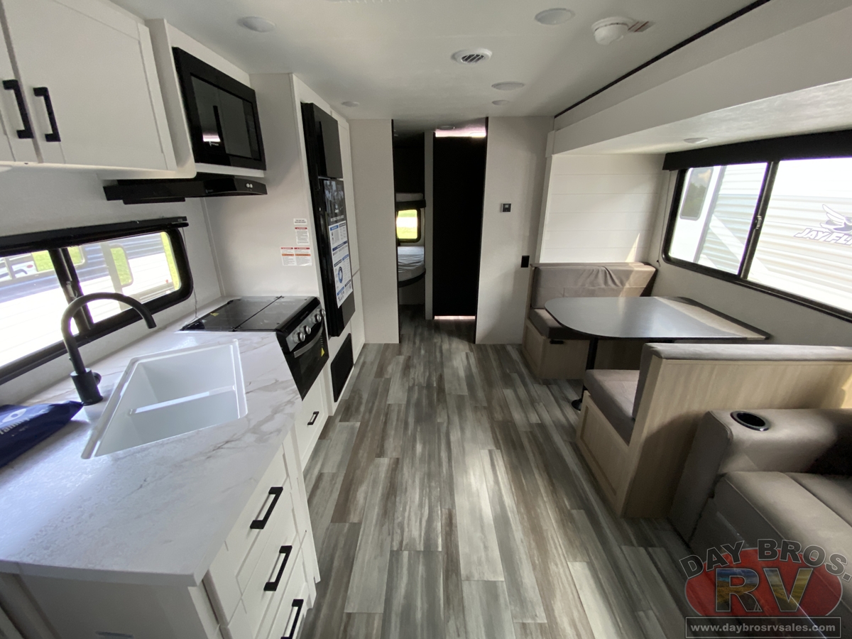 Inside, the Jay Flight SLX boasts some luxe residential features. Solid hardwood cabinet doors and drawers, with hidden cabinet hinges, offer a modern and sleek look. We continue to keep our owner's needs at the top of our mind, by offering oversized cabinets for increased storage space. In addition, you'll find maximized storage underneath the bed or bunk beds, under the dinettes, under the jack-knife sofas and even a neatly finished and lit exterior passthrough storage space. And just like our larger units, the Jay Flight SLX comes standard with a 60,000 BTU on-demand tankless water heater, for comfortable water temperatures as needed.