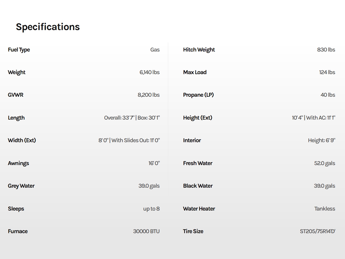 - Lightweight design around 33’ long & 6,100 lbs dry for easier towing