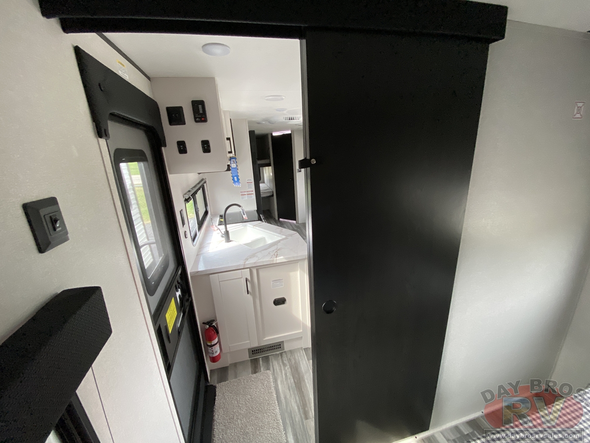 Inside, you’ll find solid hardwood cabinet doors with hidden hinges, giving the space a modern, residential feel. Oversized cabinets and under-bed storage ensure there’s room for everything you need, while the lit exterior passthrough storage makes packing and unpacking a breeze.