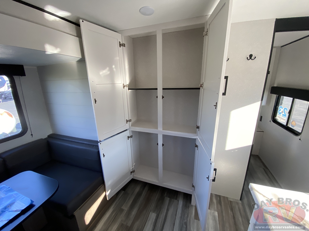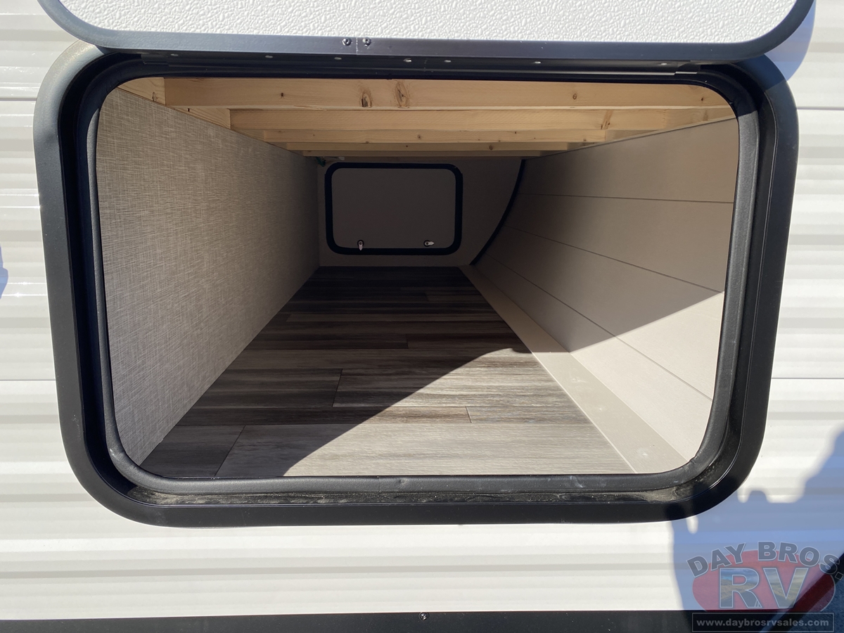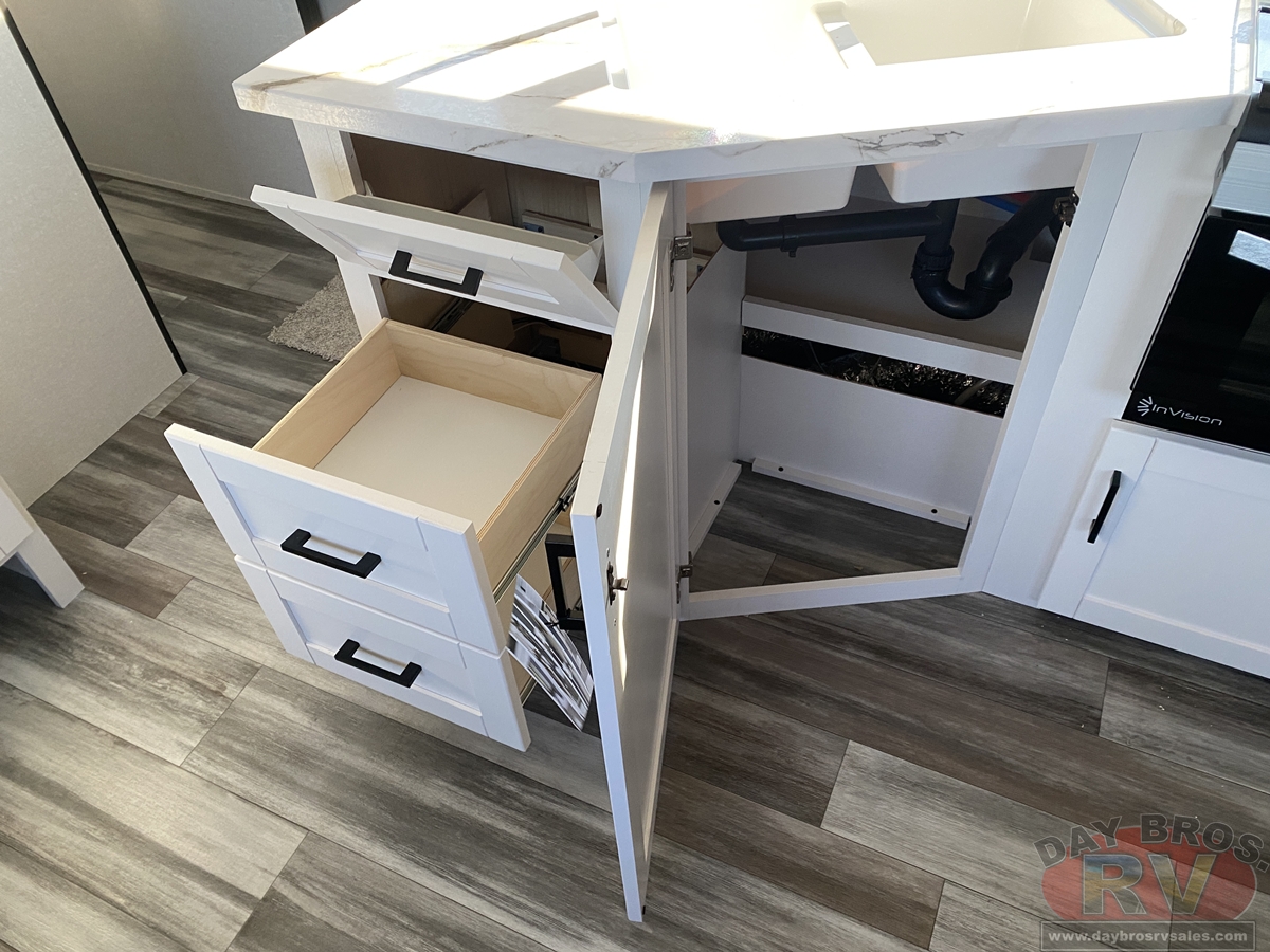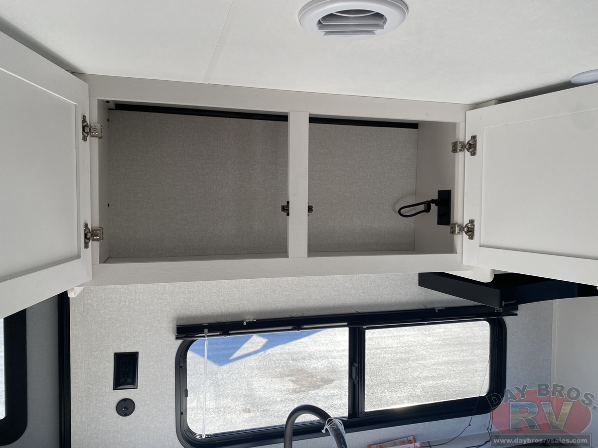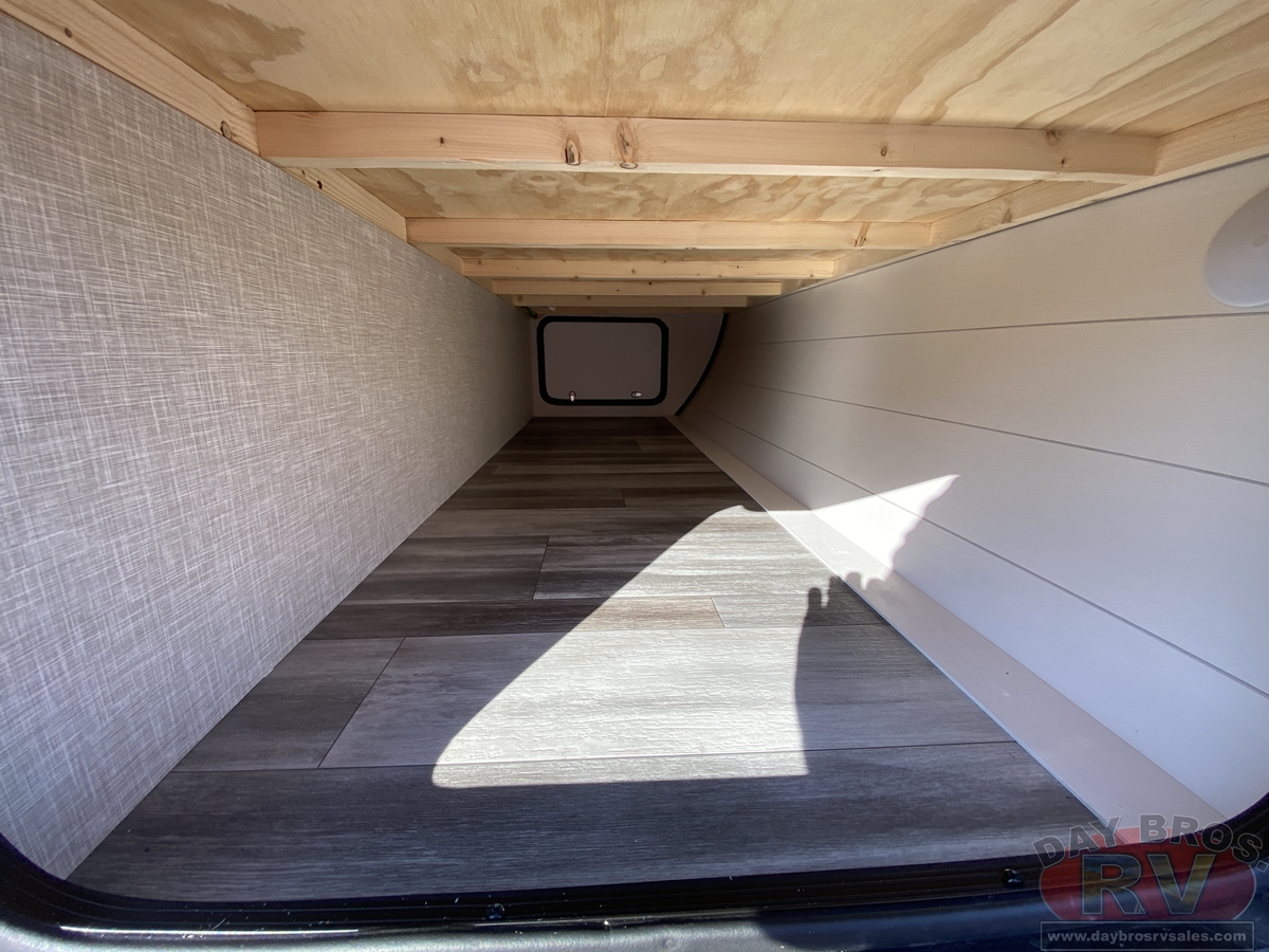 Inside, you’ll find solid hardwood cabinet doors with hidden hinges, giving the space a modern, residential feel. Oversized cabinets and under-bed storage ensure there’s room for everything you need, while the lit exterior passthrough storage makes packing and unpacking a breeze.