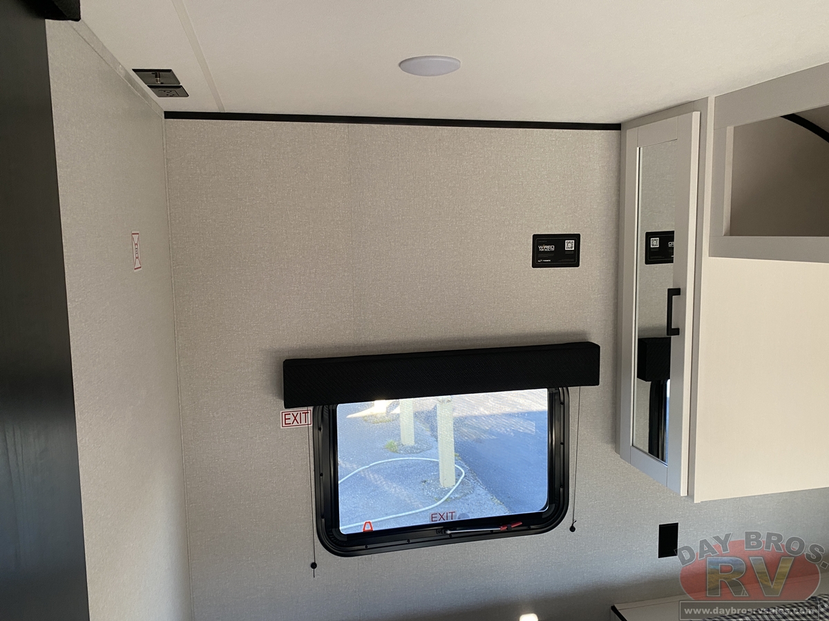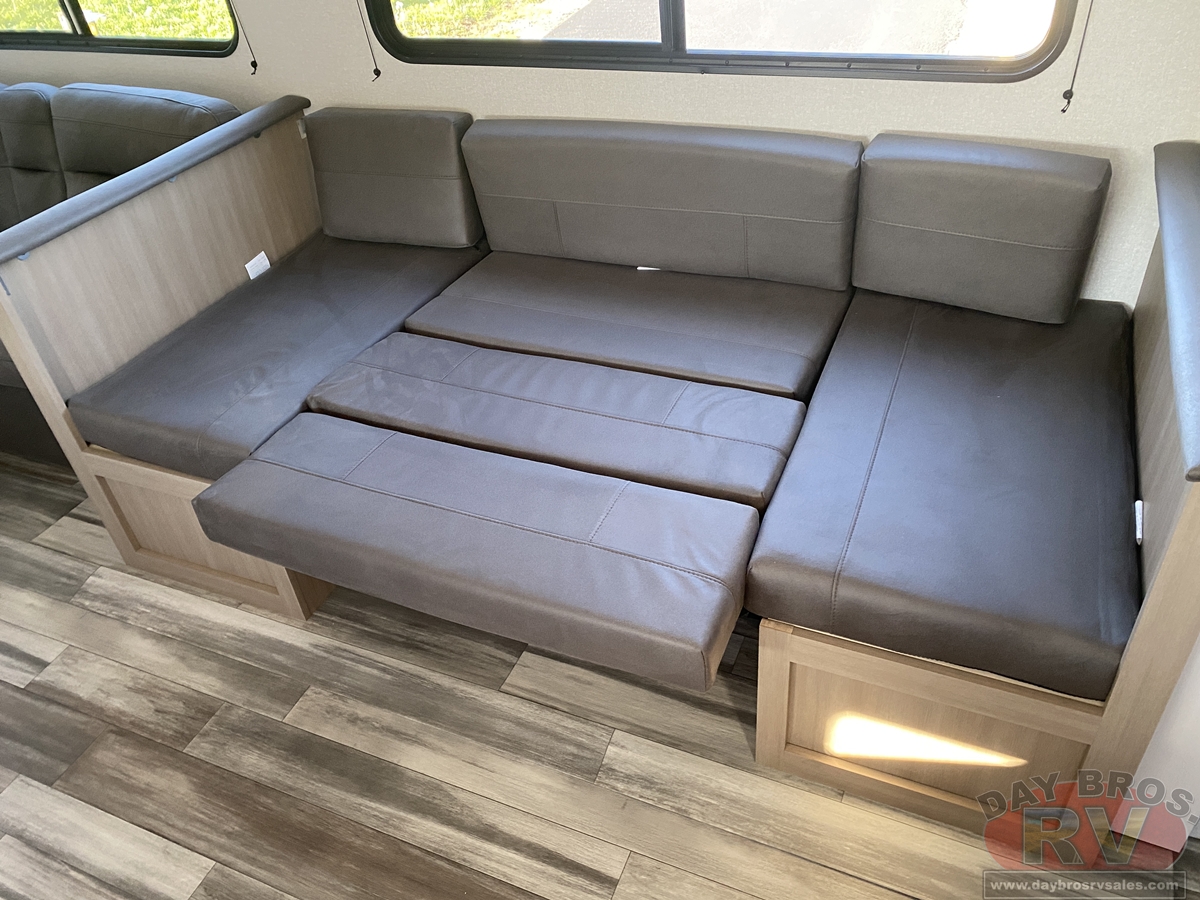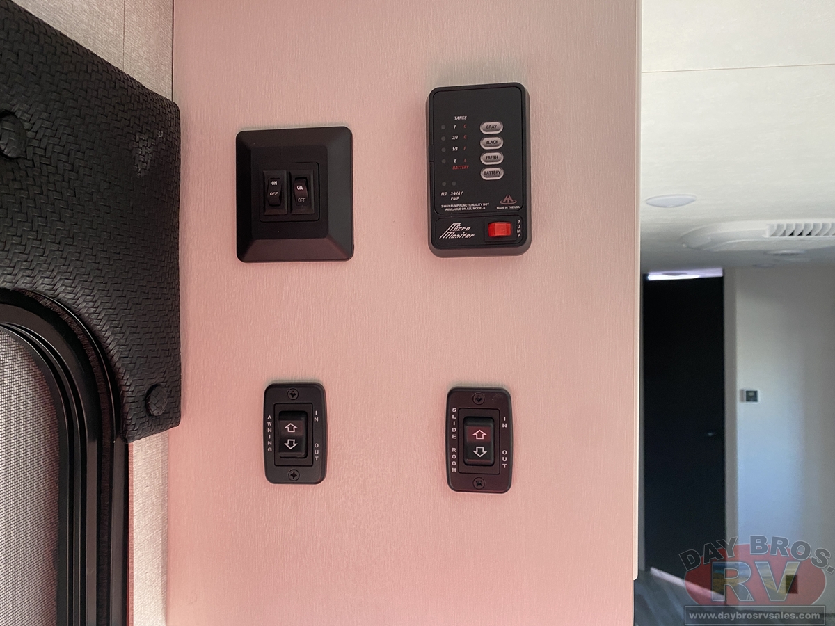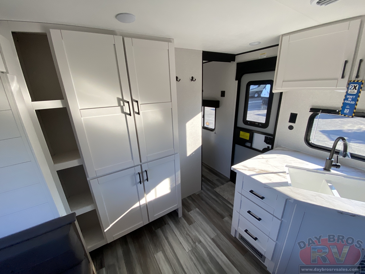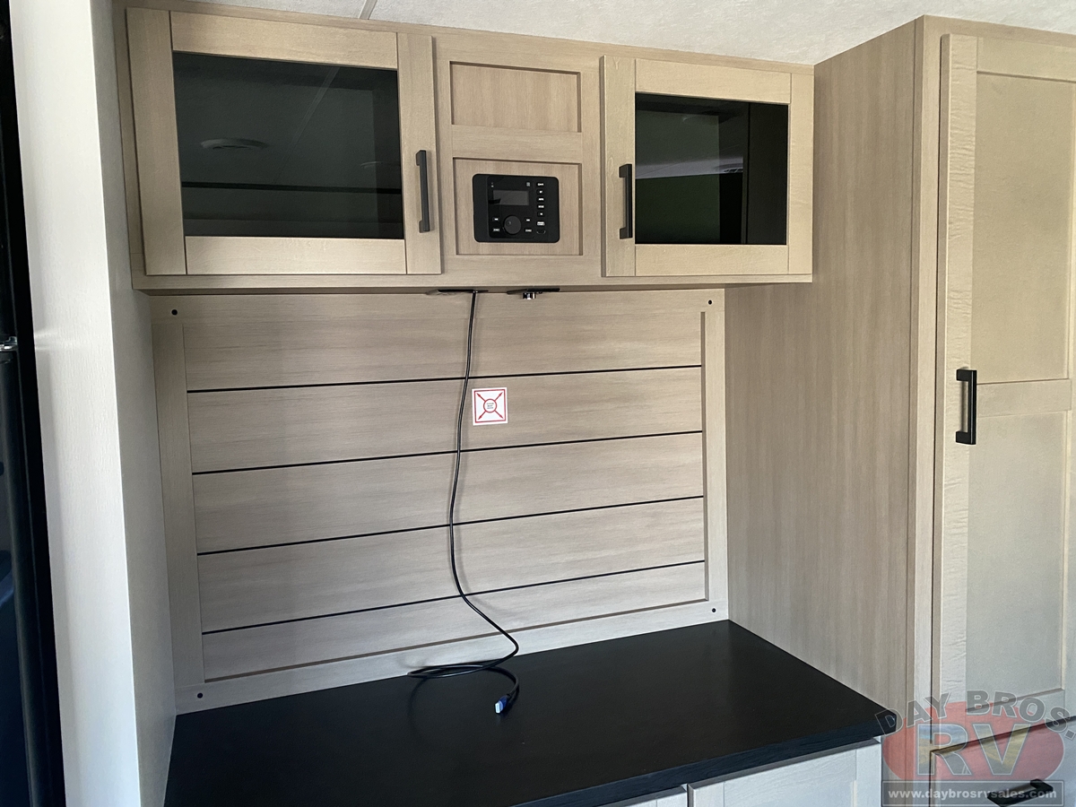 Inside, you’ll find solid hardwood cabinet doors with hidden hinges, giving the space a modern, residential feel. Oversized cabinets and under-bed storage ensure there’s room for everything you need, while the lit exterior passthrough storage makes packing and unpacking a breeze.