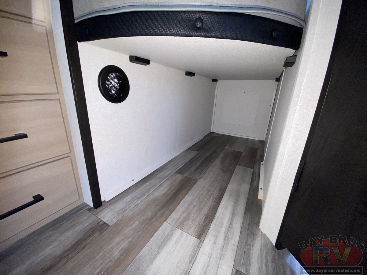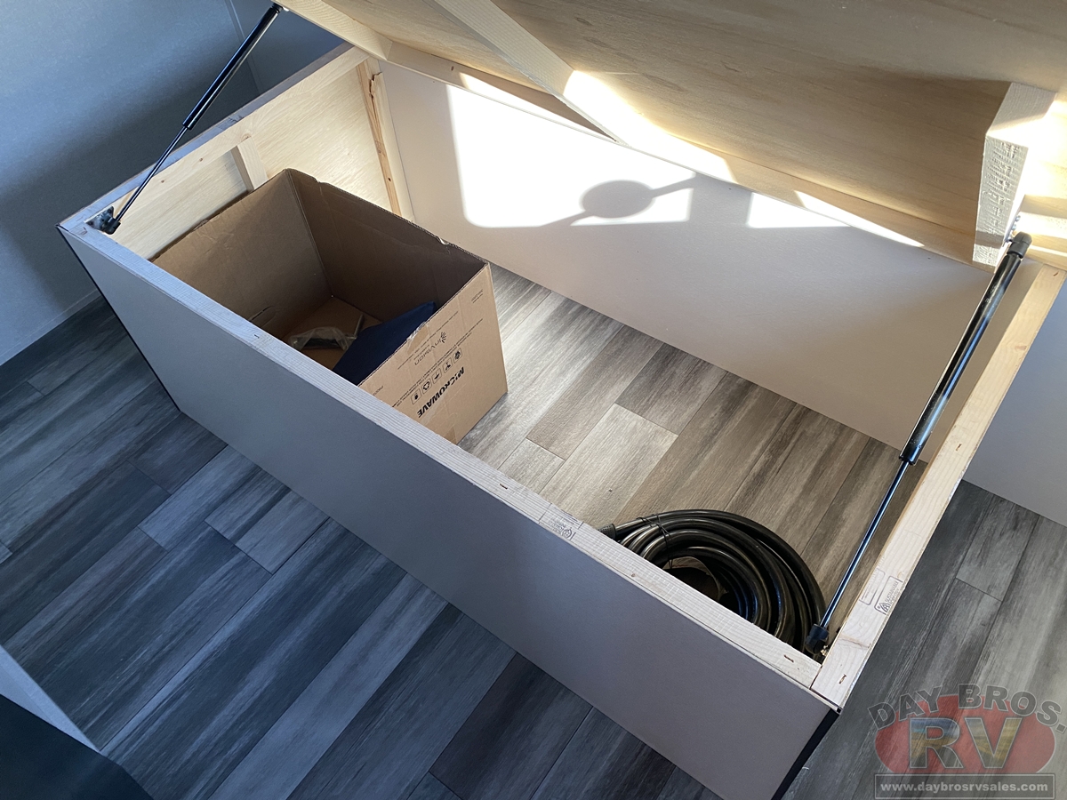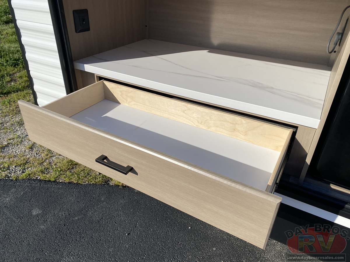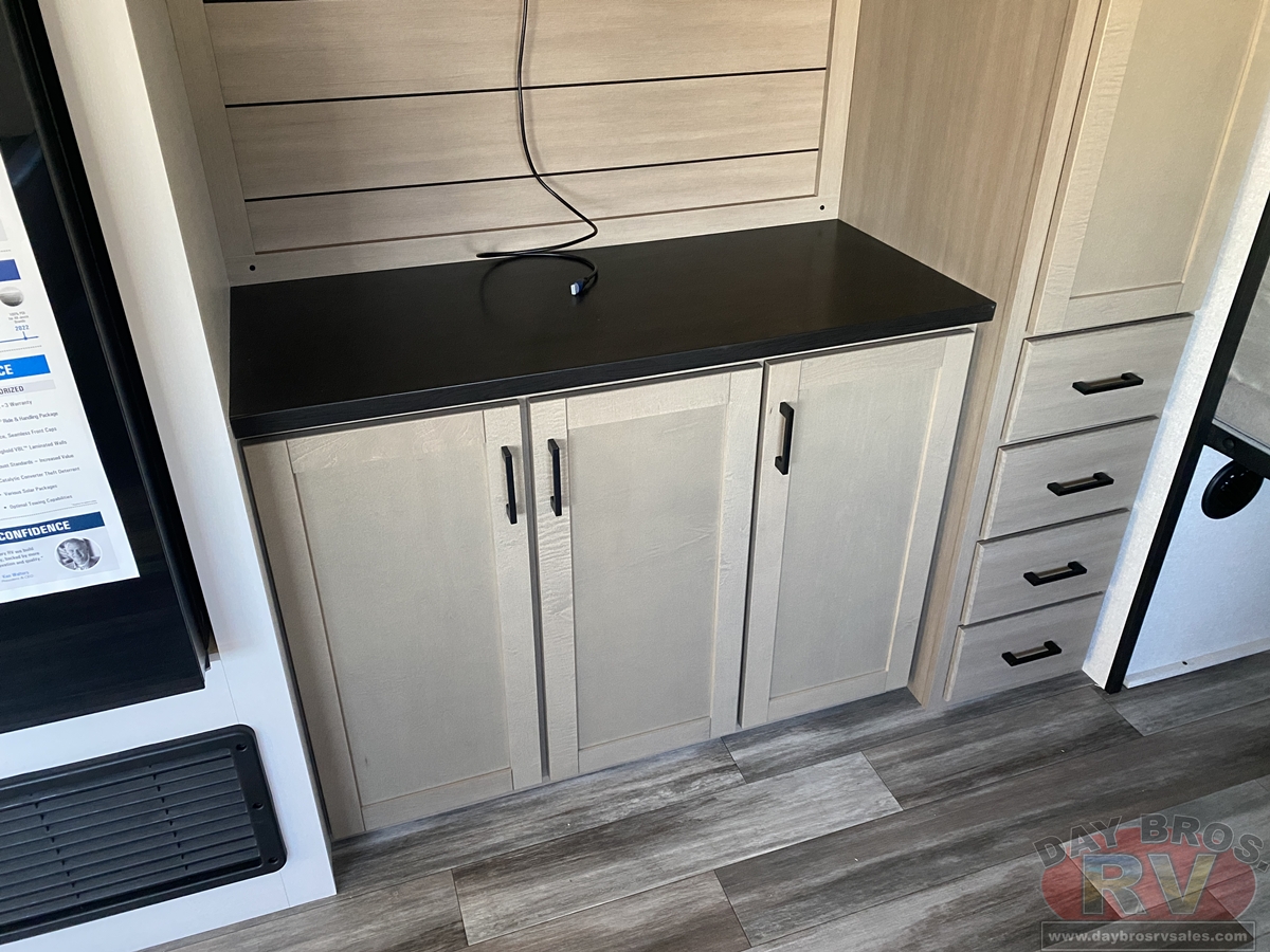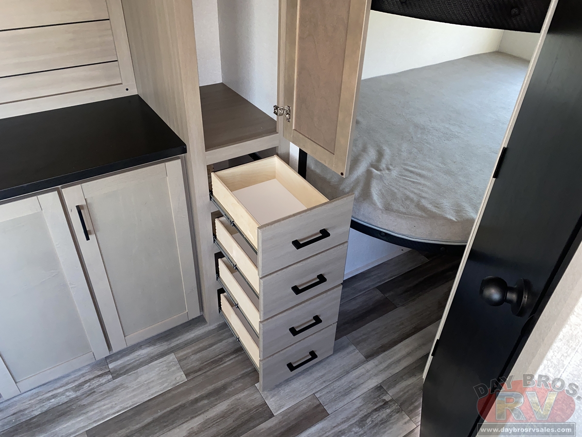 Inside, you’ll find solid hardwood cabinet doors with hidden hinges, giving the space a modern, residential feel. Oversized cabinets and under-bed storage ensure there’s room for everything you need, while the lit exterior passthrough storage makes packing and unpacking a breeze.