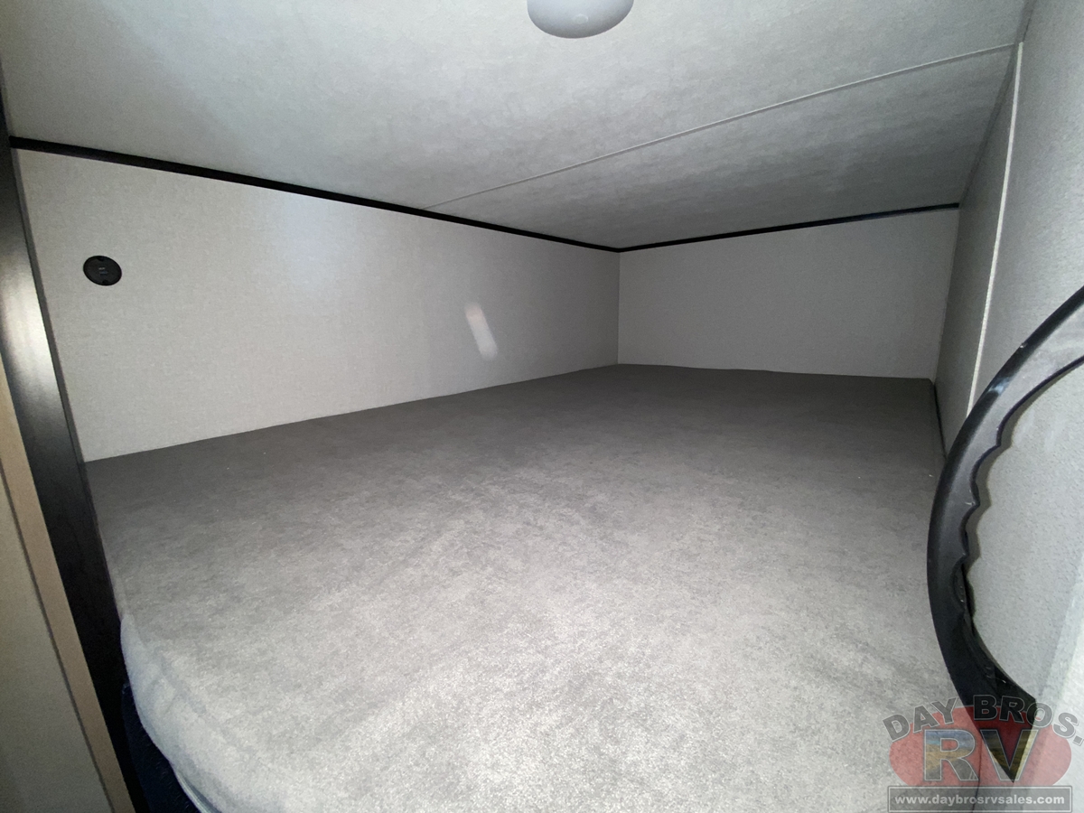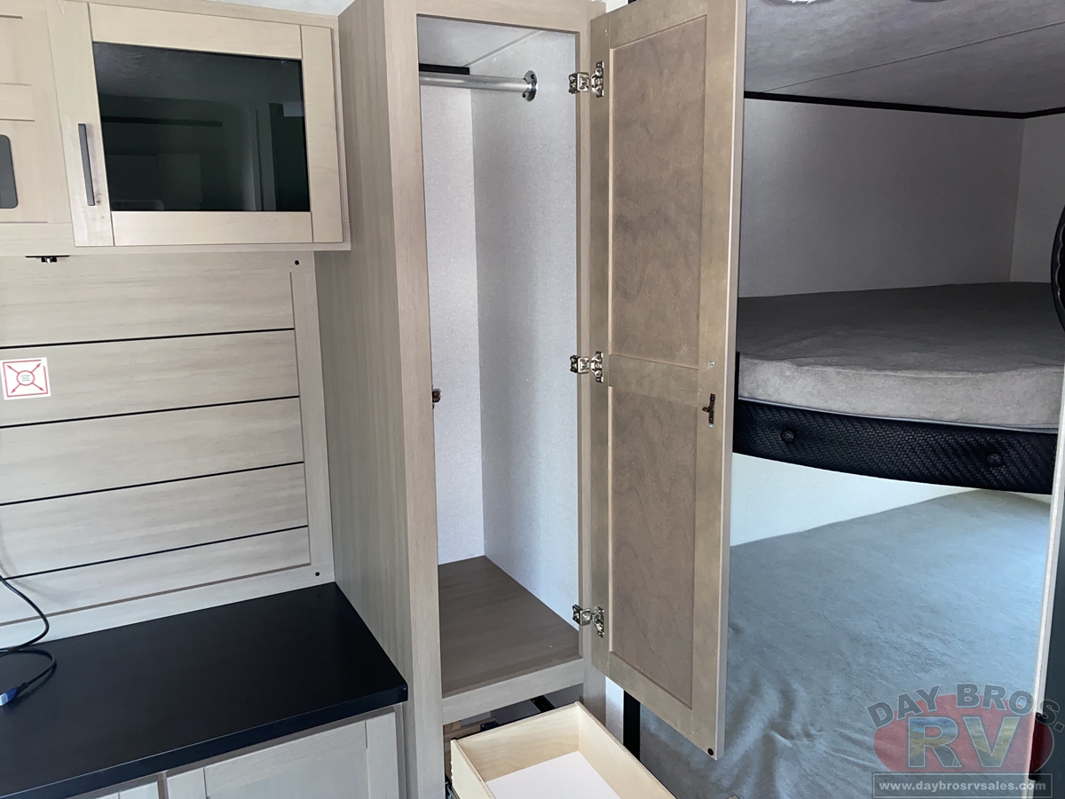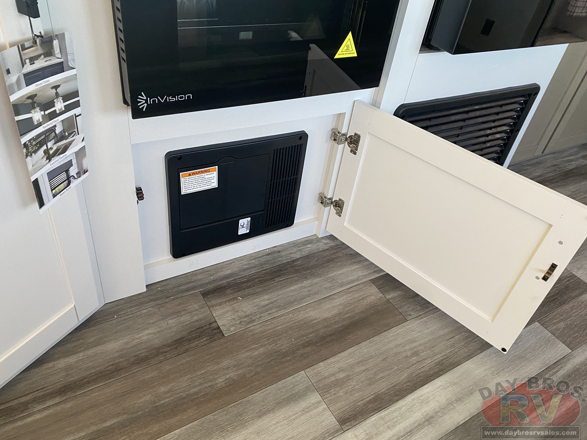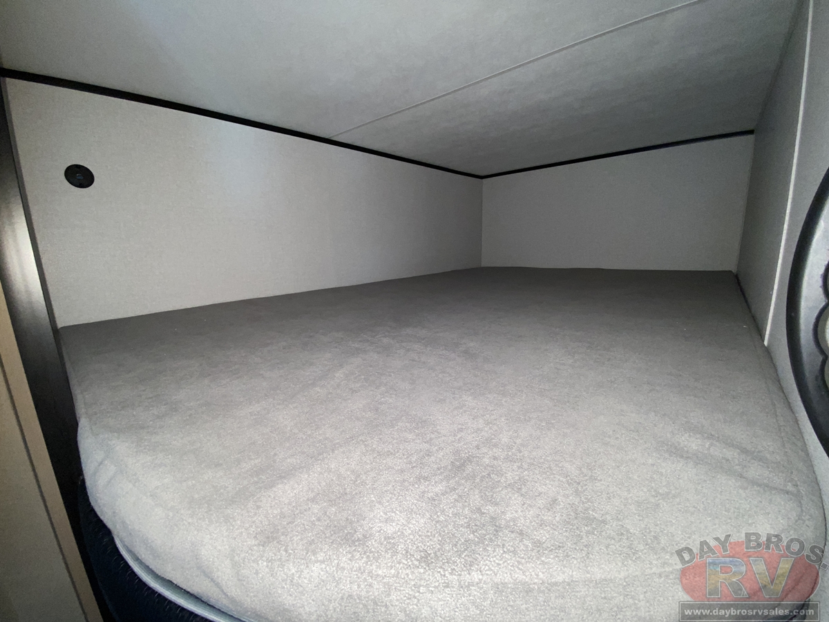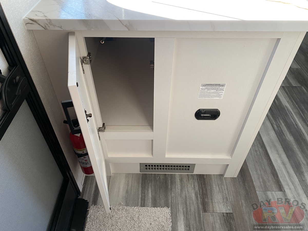 Inside, you’ll find solid hardwood cabinet doors with hidden hinges, giving the space a modern, residential feel. Oversized cabinets and under-bed storage ensure there’s room for everything you need, while the lit exterior passthrough storage makes packing and unpacking a breeze.