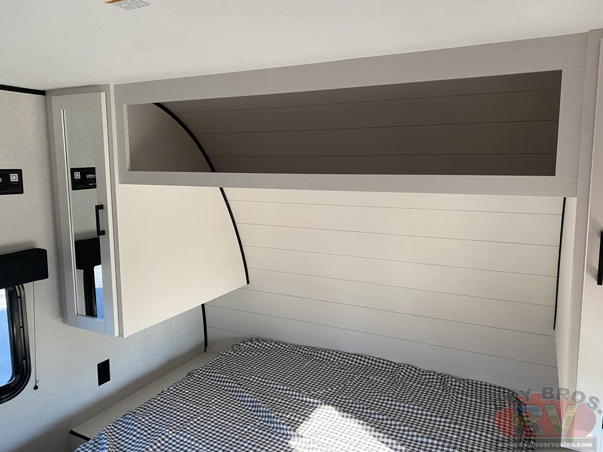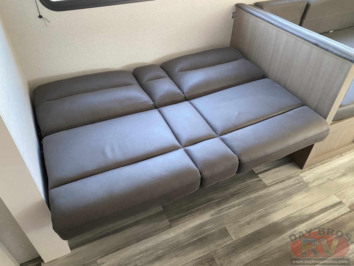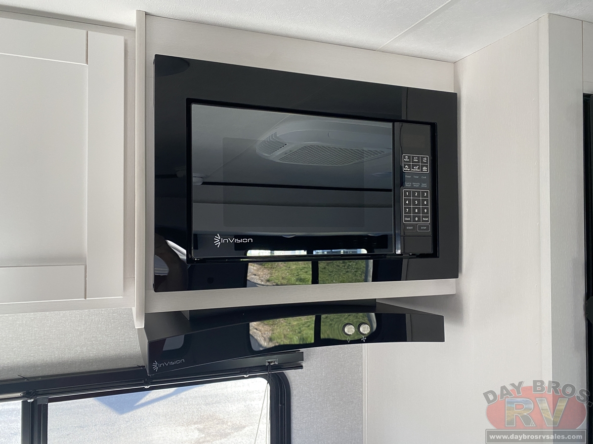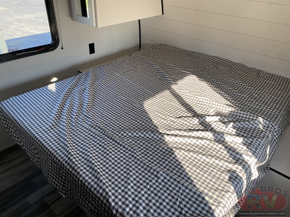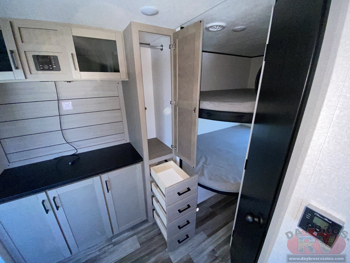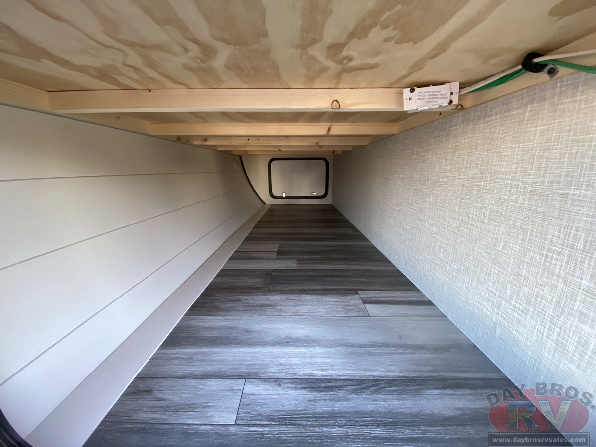 Inside, you’ll find solid hardwood cabinet doors with hidden hinges, giving the space a modern, residential feel. Oversized cabinets and under-bed storage ensure there’s room for everything you need, while the lit exterior passthrough storage makes packing and unpacking a breeze.