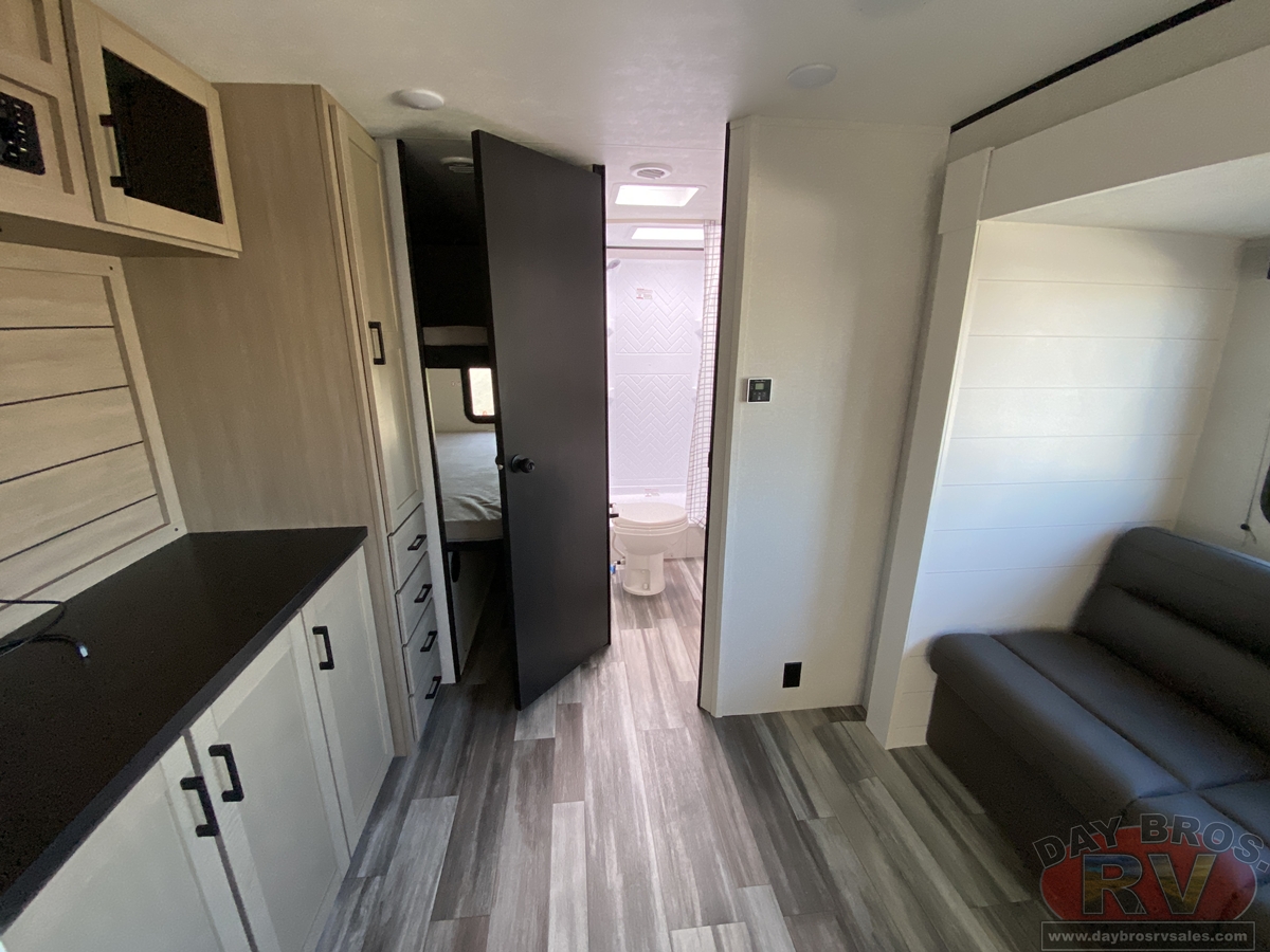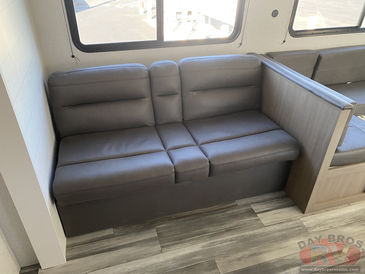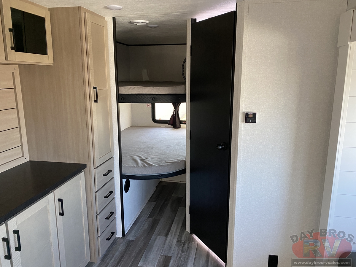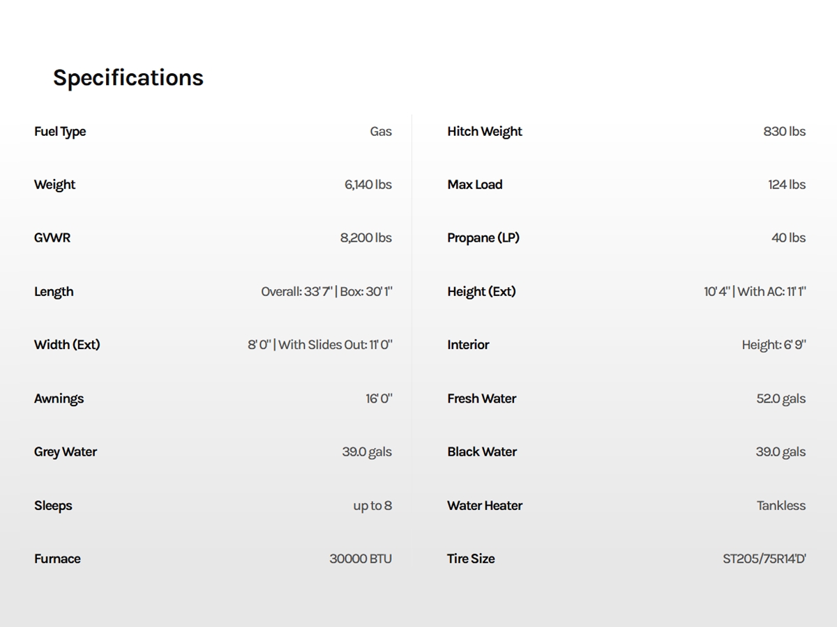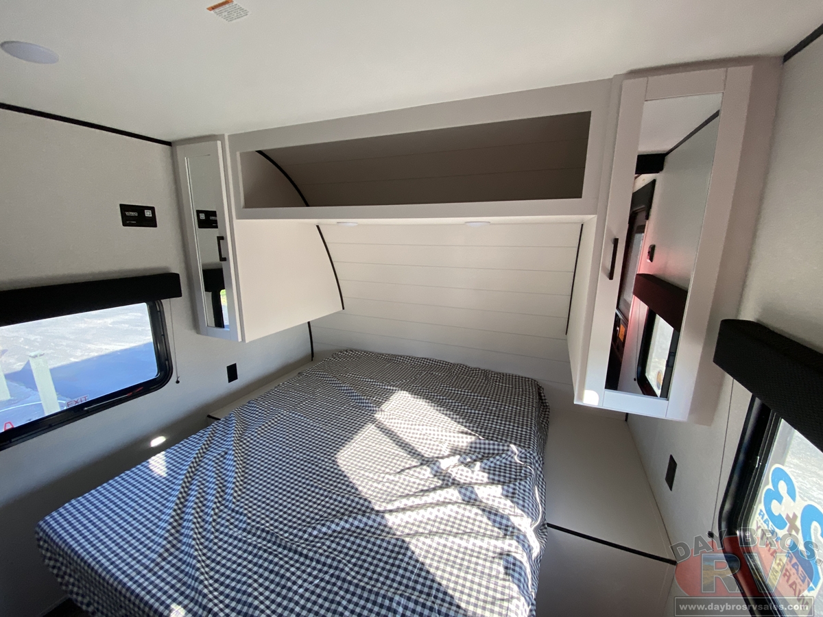 Inside, you’ll find solid hardwood cabinet doors with hidden hinges, giving the space a modern, residential feel. Oversized cabinets and under-bed storage ensure there’s room for everything you need, while the lit exterior passthrough storage makes packing and unpacking a breeze.