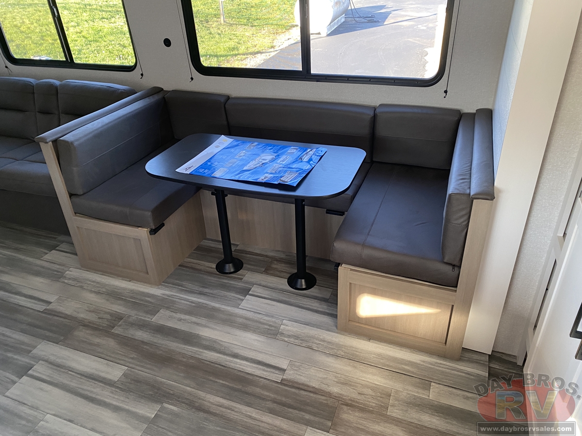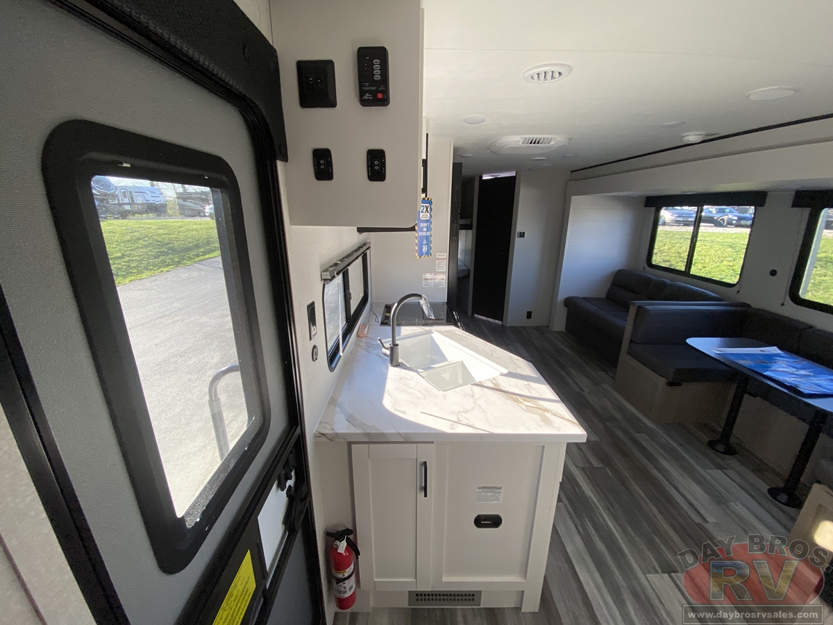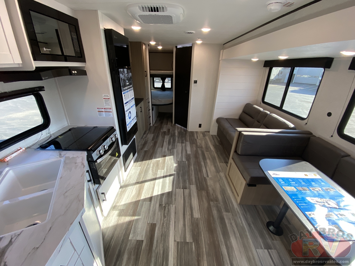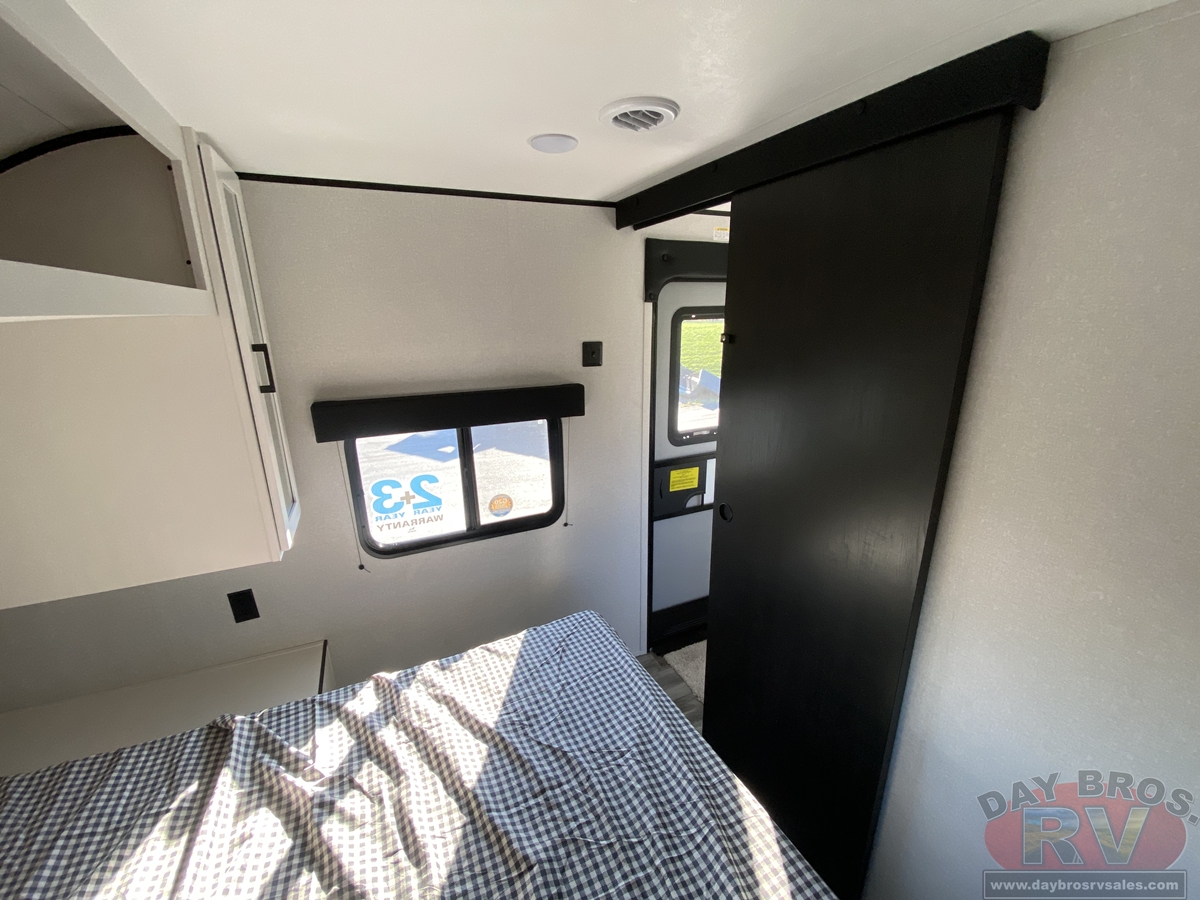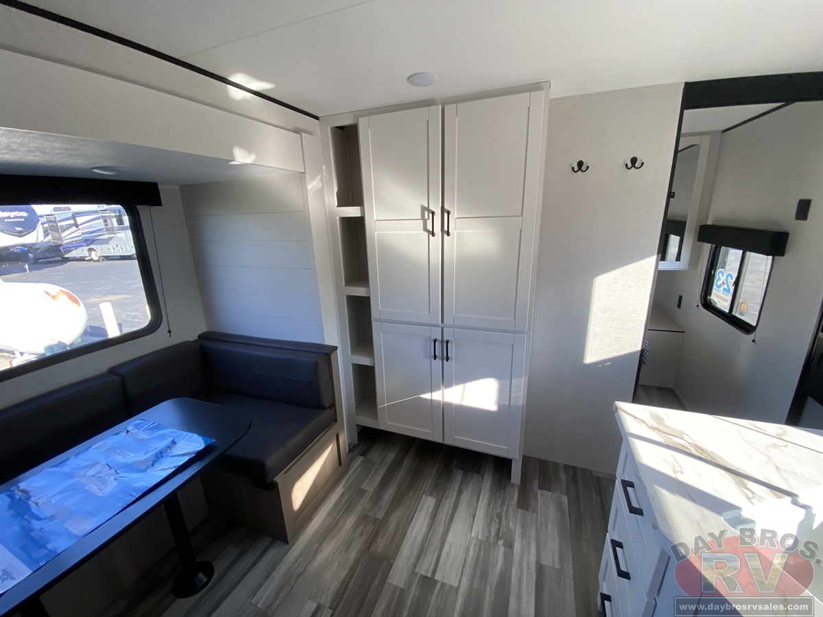 Inside, you’ll find solid hardwood cabinet doors with hidden hinges, giving the space a modern, residential feel. Oversized cabinets and under-bed storage ensure there’s room for everything you need, while the lit exterior passthrough storage makes packing and unpacking a breeze.