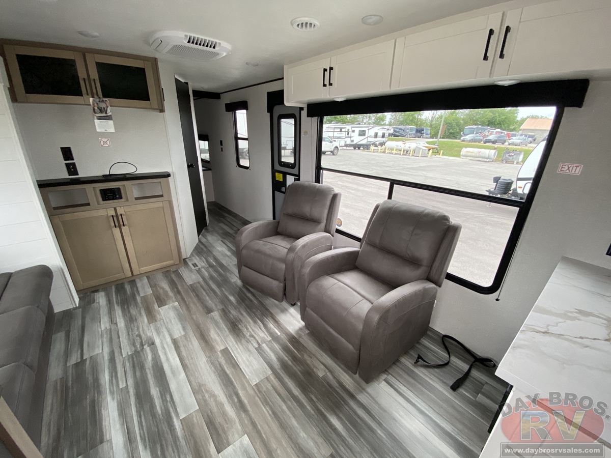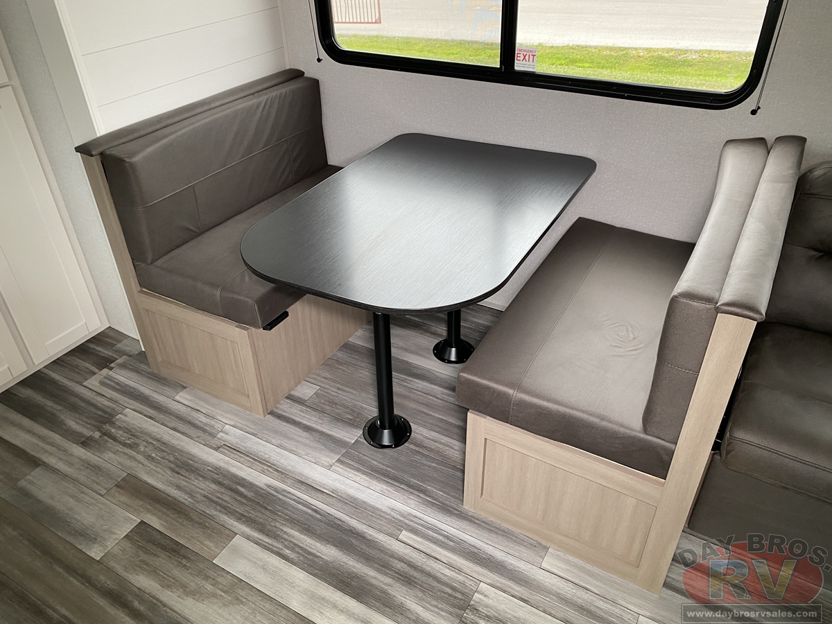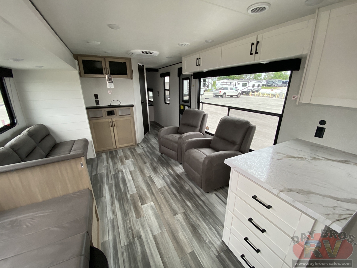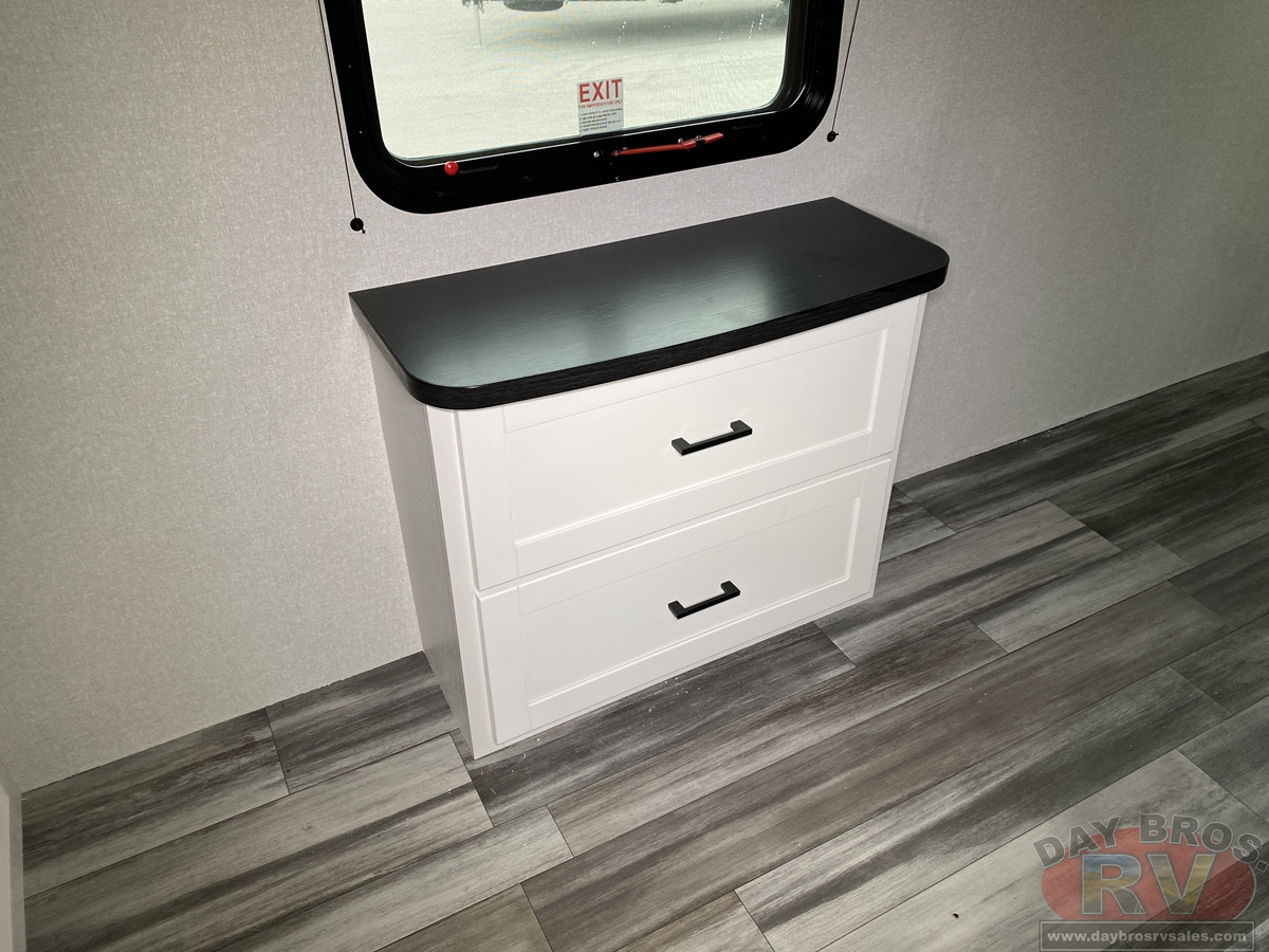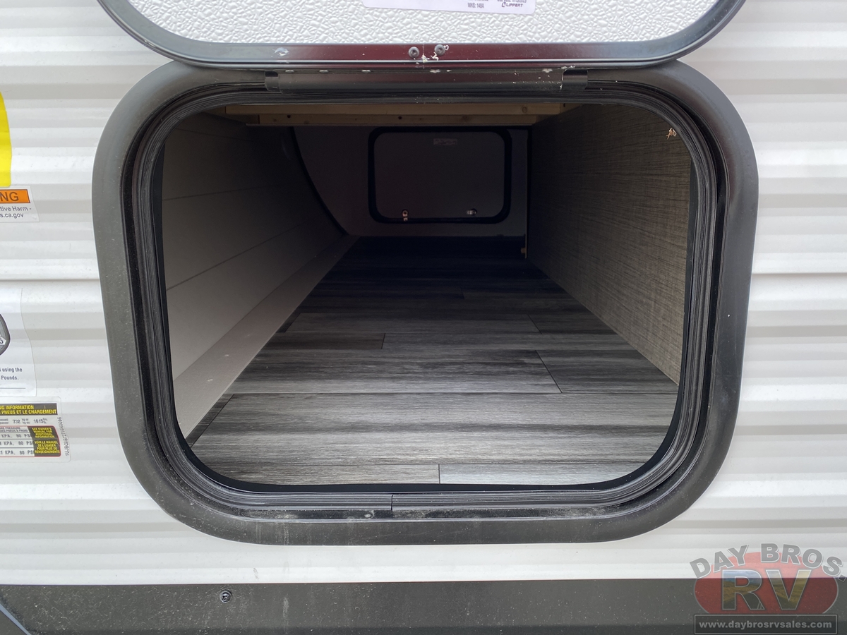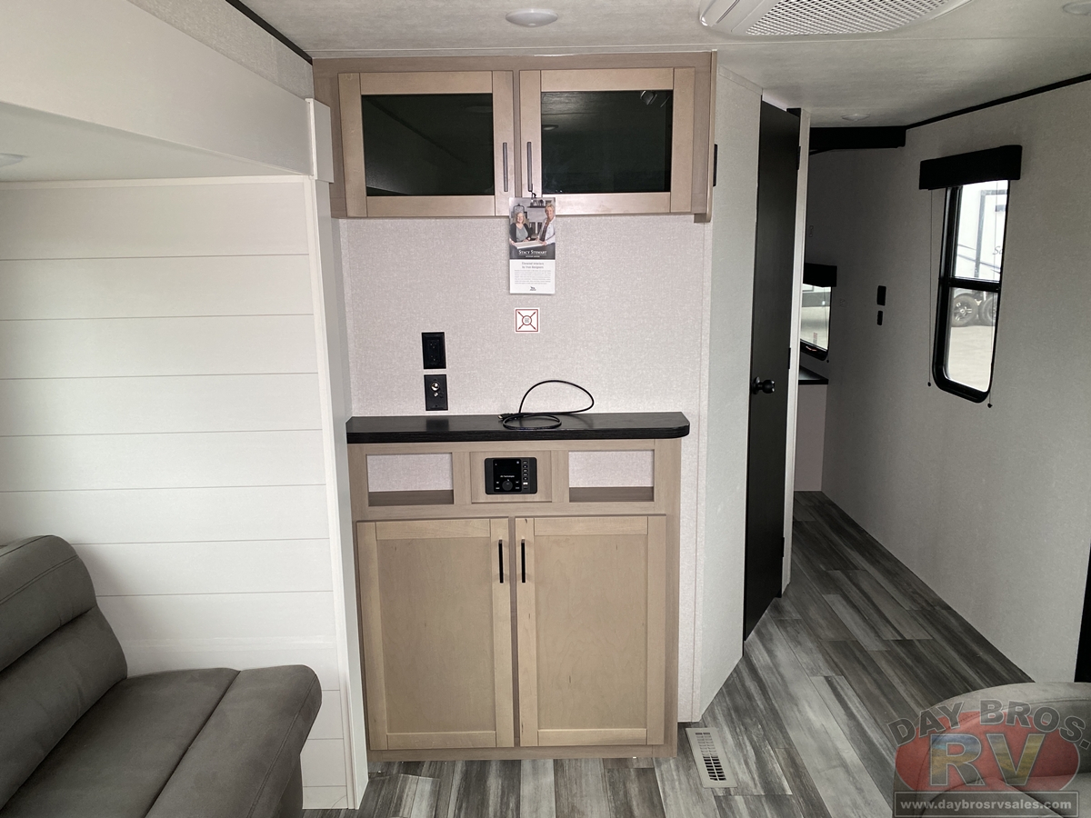 Time spent in this double slide out trailer will be time well spent! Your crew can relax on the sofa or lounge chairs, and dine at the booth dinette. A dual entry bath will create a front master bedroom you are sure to love. There is a queen bed slide out here, along with a front wardrobe, a dresser, plus washer and dryer prep. The rear kitchen includes ample counter space, all the appliances to create meals, and a pantry for snacks.