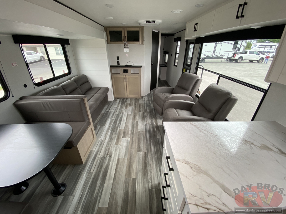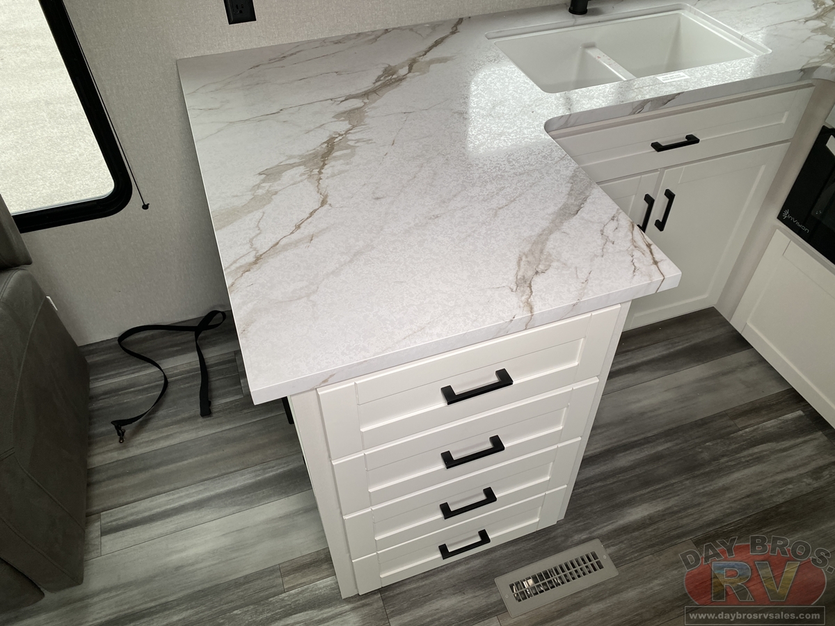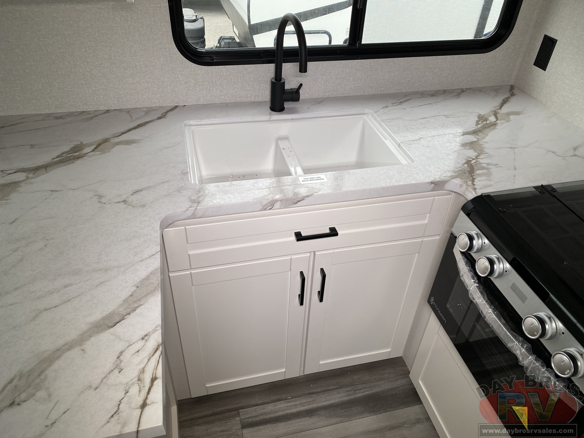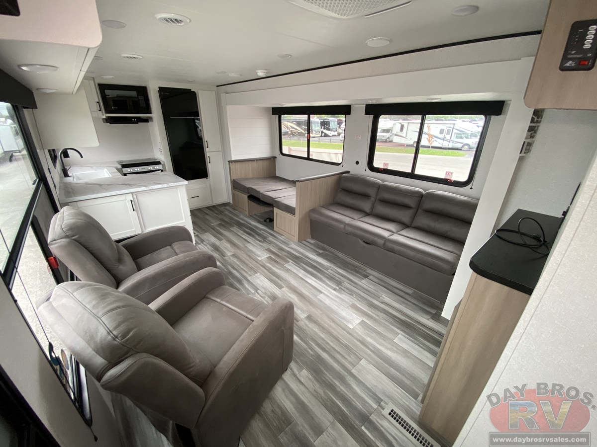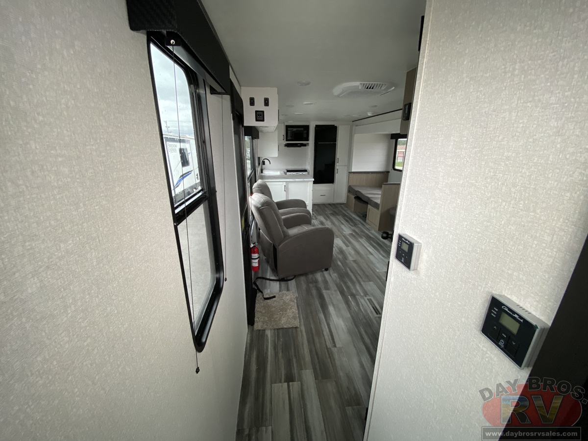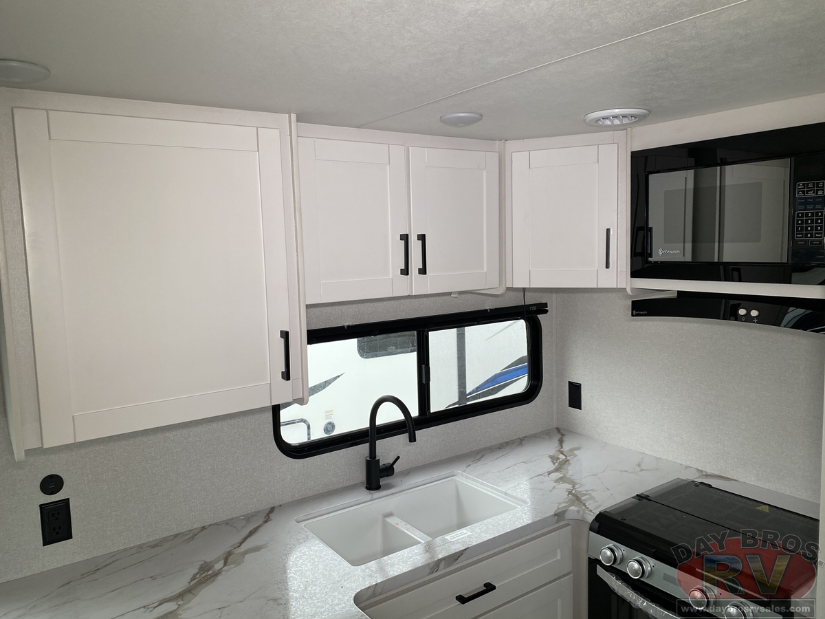 Time spent in this double slide out trailer will be time well spent! Your crew can relax on the sofa or lounge chairs, and dine at the booth dinette. A dual entry bath will create a front master bedroom you are sure to love. There is a queen bed slide out here, along with a front wardrobe, a dresser, plus washer and dryer prep. The rear kitchen includes ample counter space, all the appliances to create meals, and a pantry for snacks.