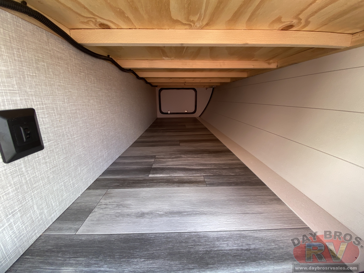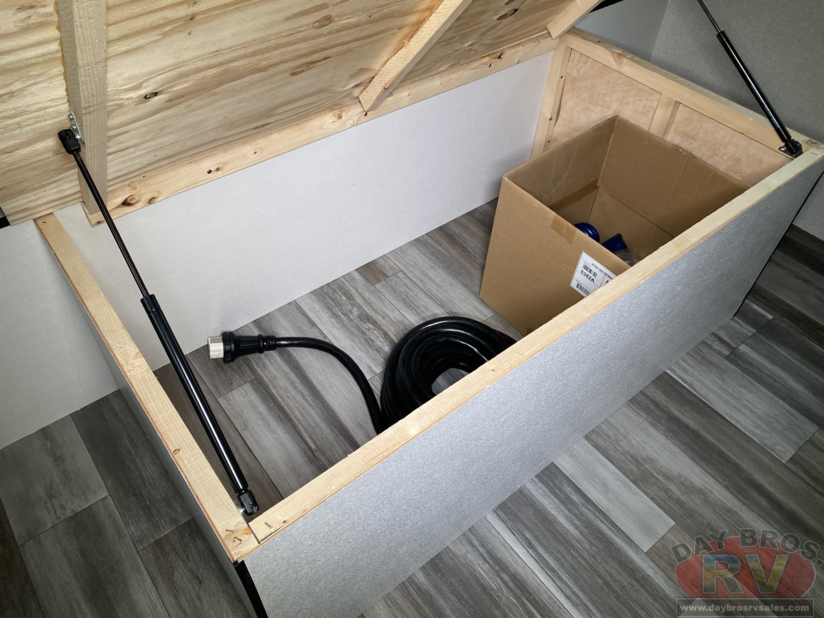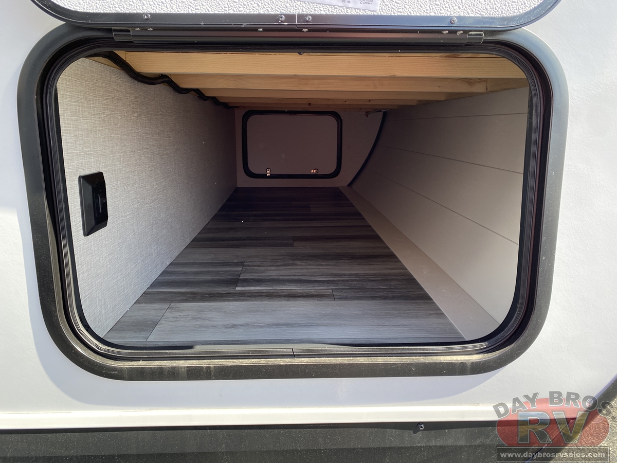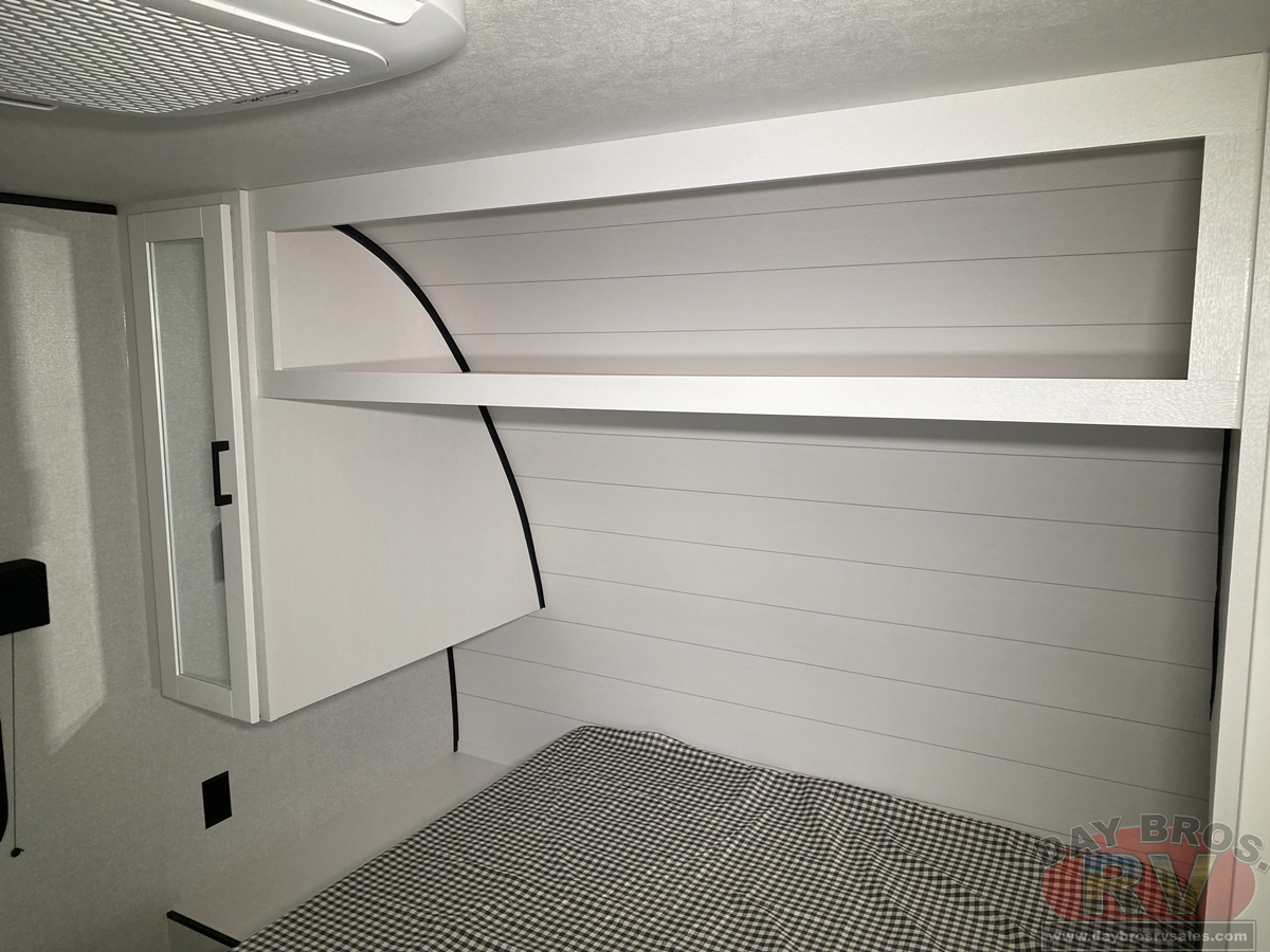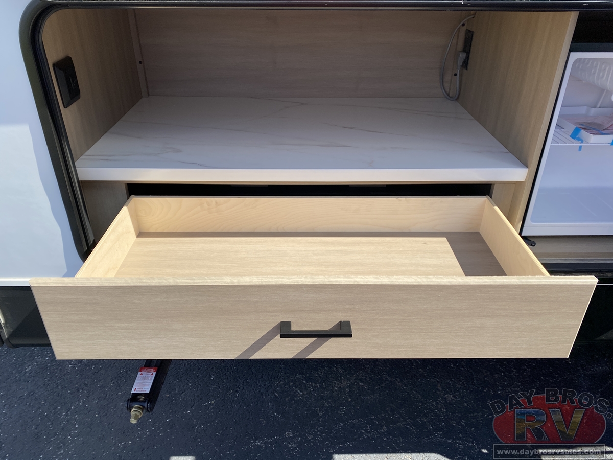 Inside, you’ll find solid hardwood cabinet doors with hidden hinges, giving the space a modern, residential feel. Oversized cabinets and under-bed storage ensure there’s room for everything you need, while the lit exterior passthrough storage makes packing and unpacking a breeze.