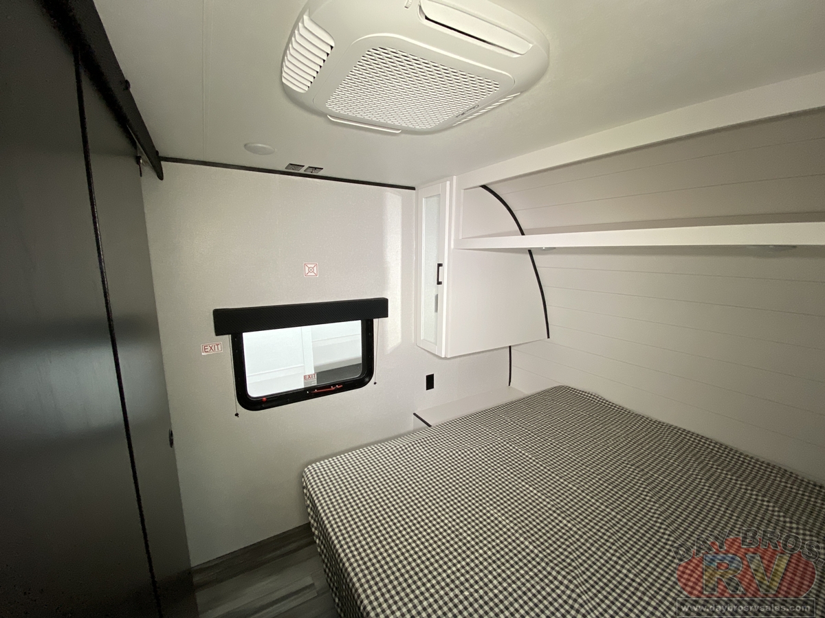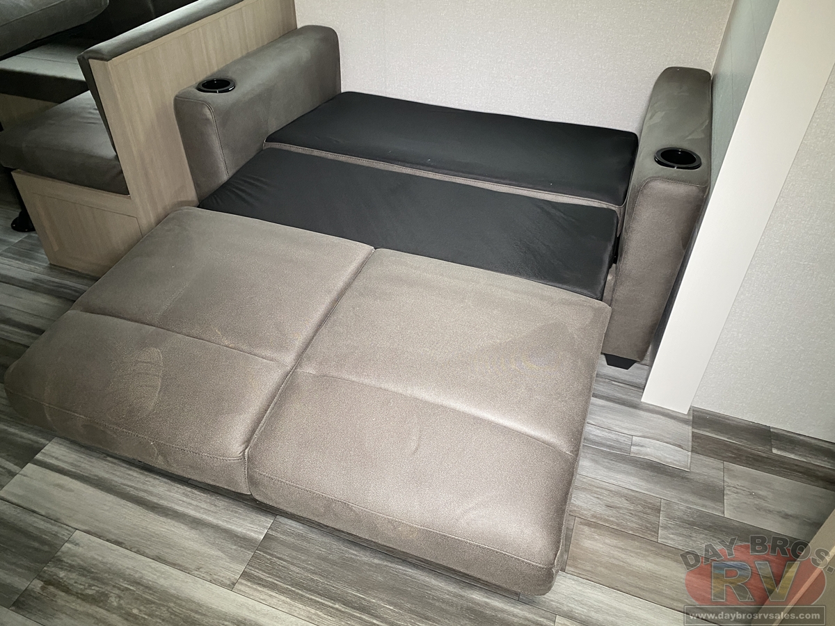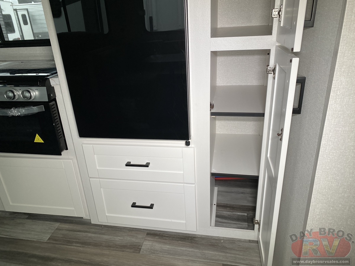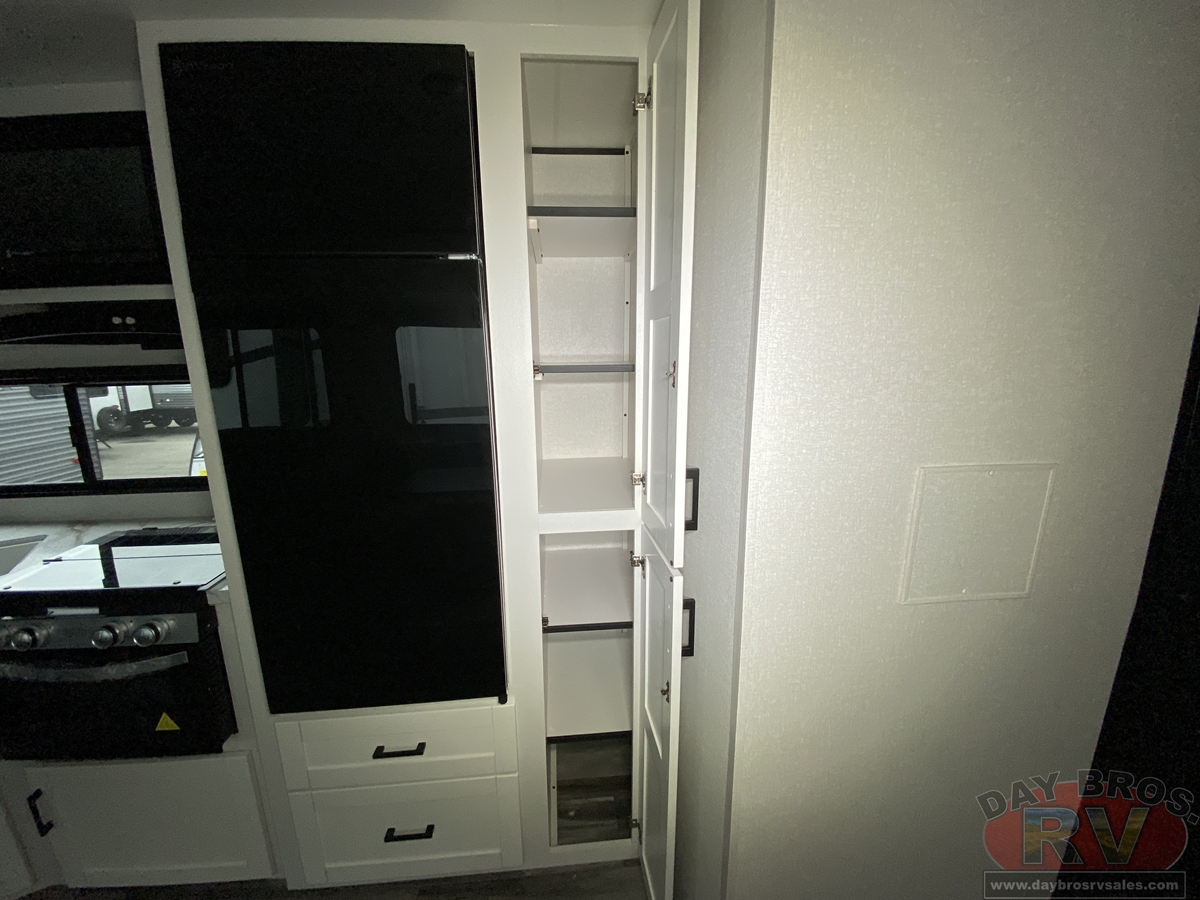Inside, you’ll find solid hardwood cabinet doors with hidden hinges, giving the space a modern, residential feel. Oversized cabinets and under-bed storage ensure there’s room for everything you need, while the lit exterior passthrough storage makes packing and unpacking a breeze.