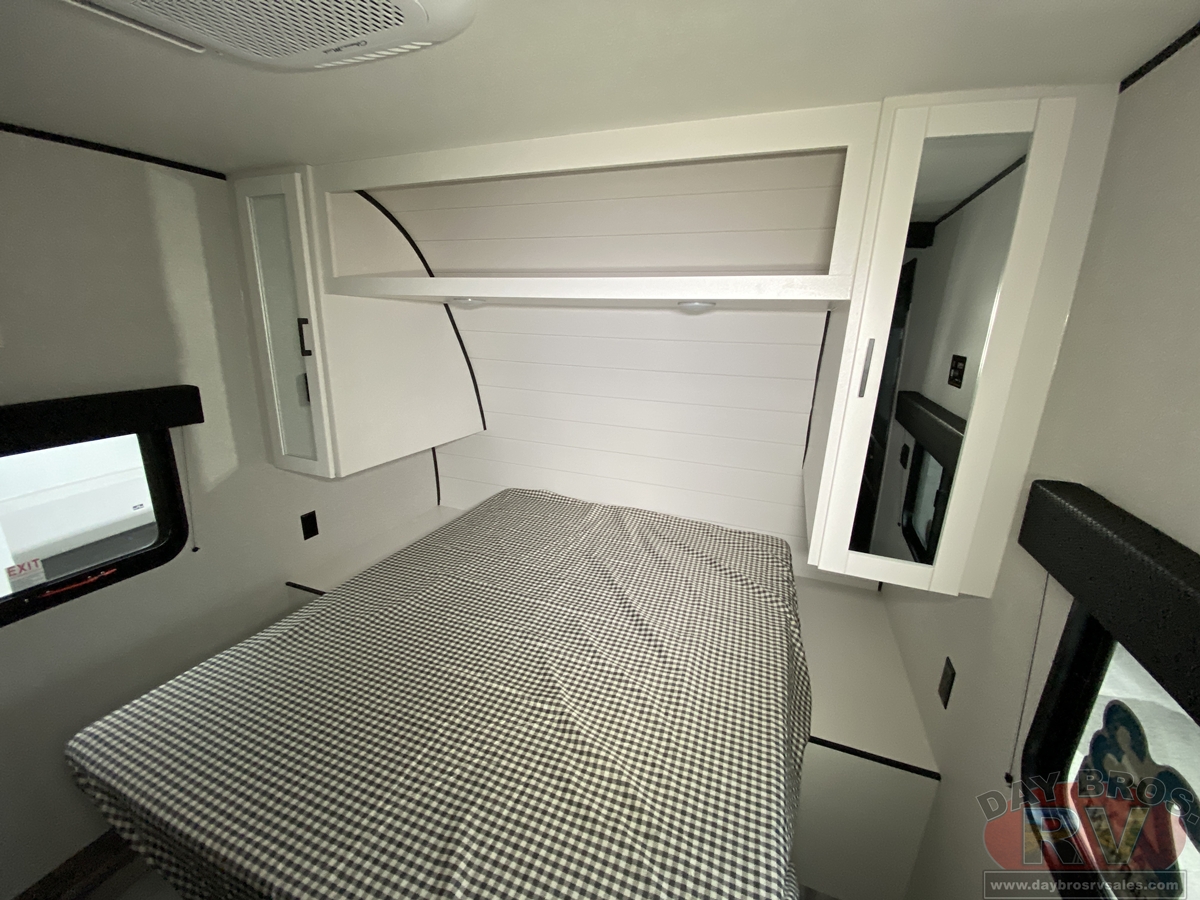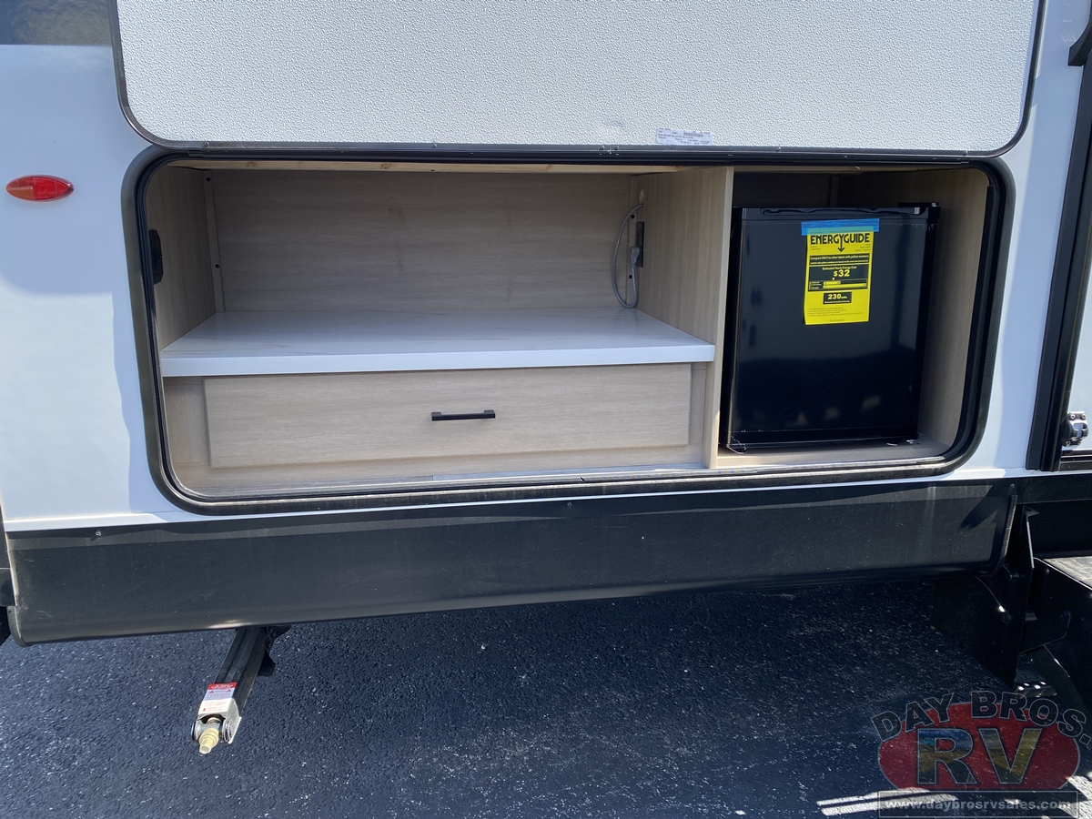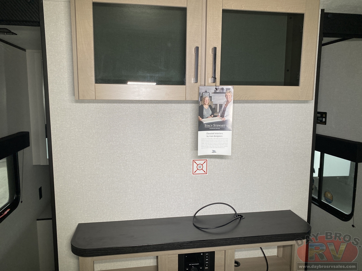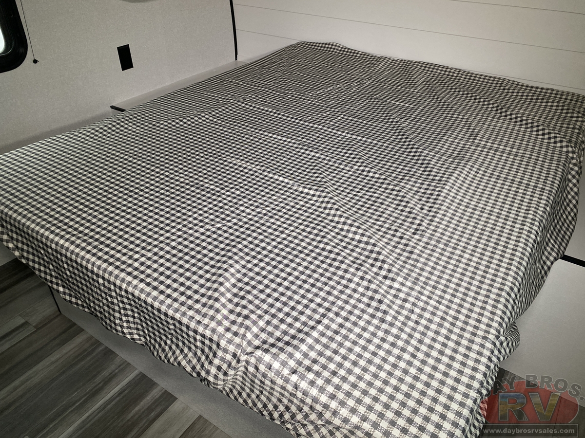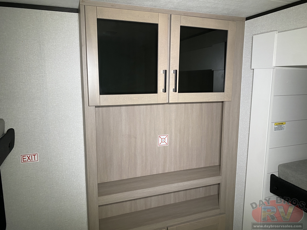 Inside, you’ll find solid hardwood cabinet doors with hidden hinges, giving the space a modern, residential feel. Oversized cabinets and under-bed storage ensure there’s room for everything you need, while the lit exterior passthrough storage makes packing and unpacking a breeze.