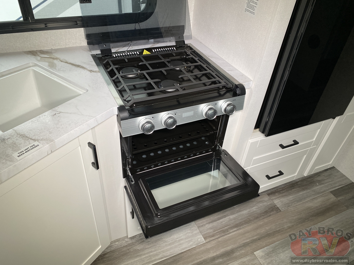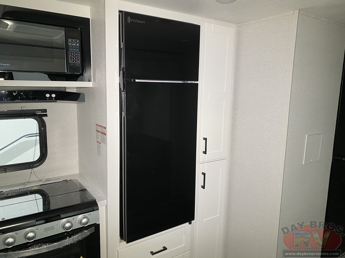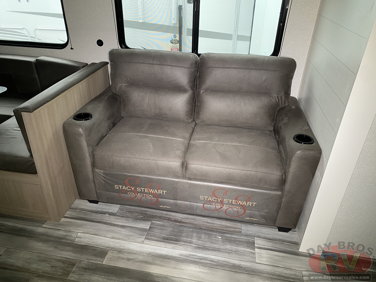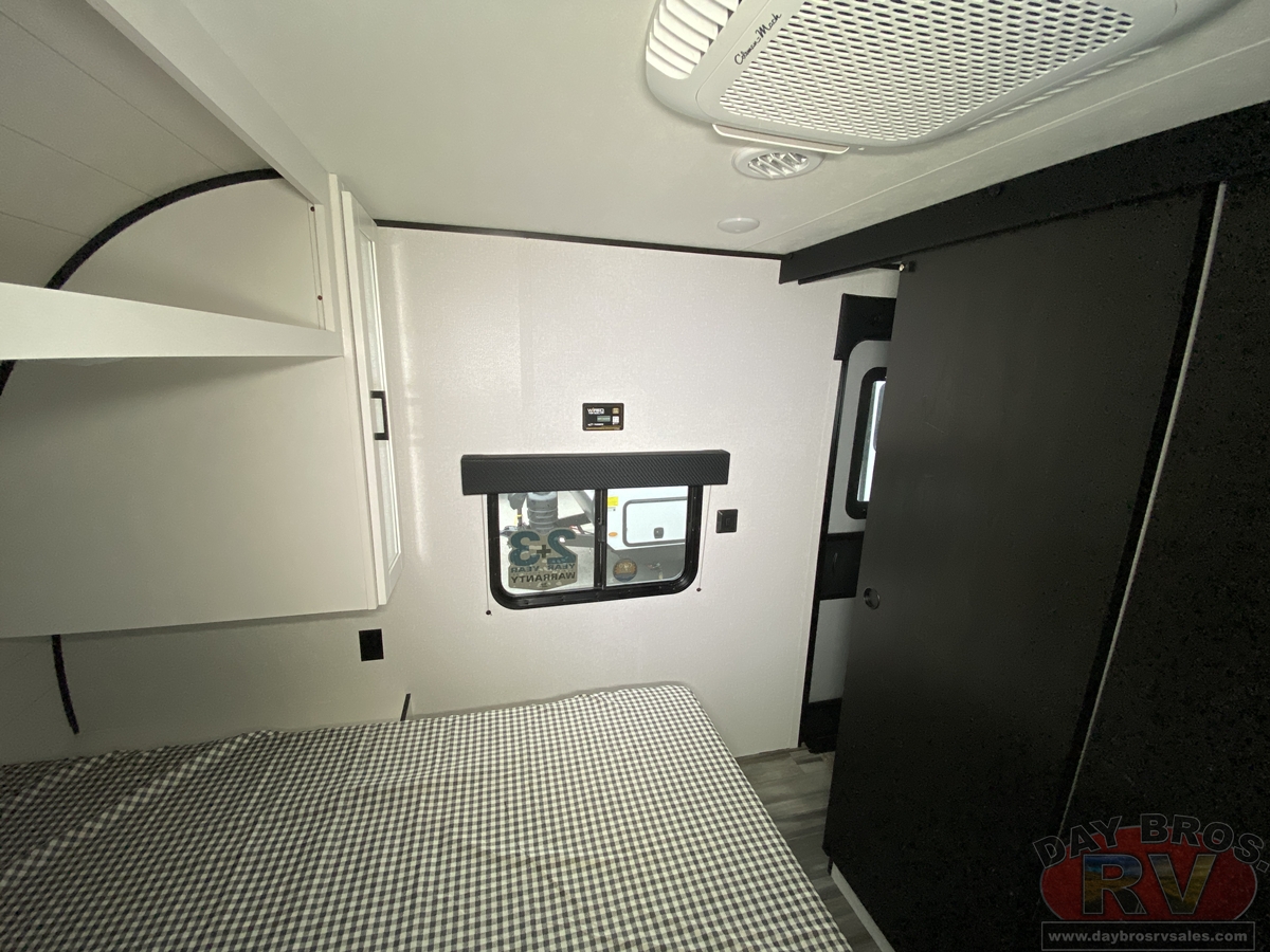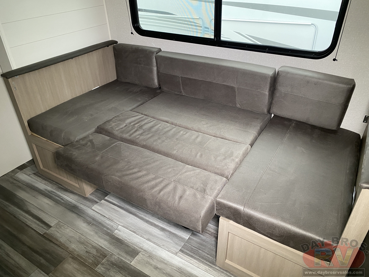 Inside, you’ll find solid hardwood cabinet doors with hidden hinges, giving the space a modern, residential feel. Oversized cabinets and under-bed storage ensure there’s room for everything you need, while the lit exterior passthrough storage makes packing and unpacking a breeze.