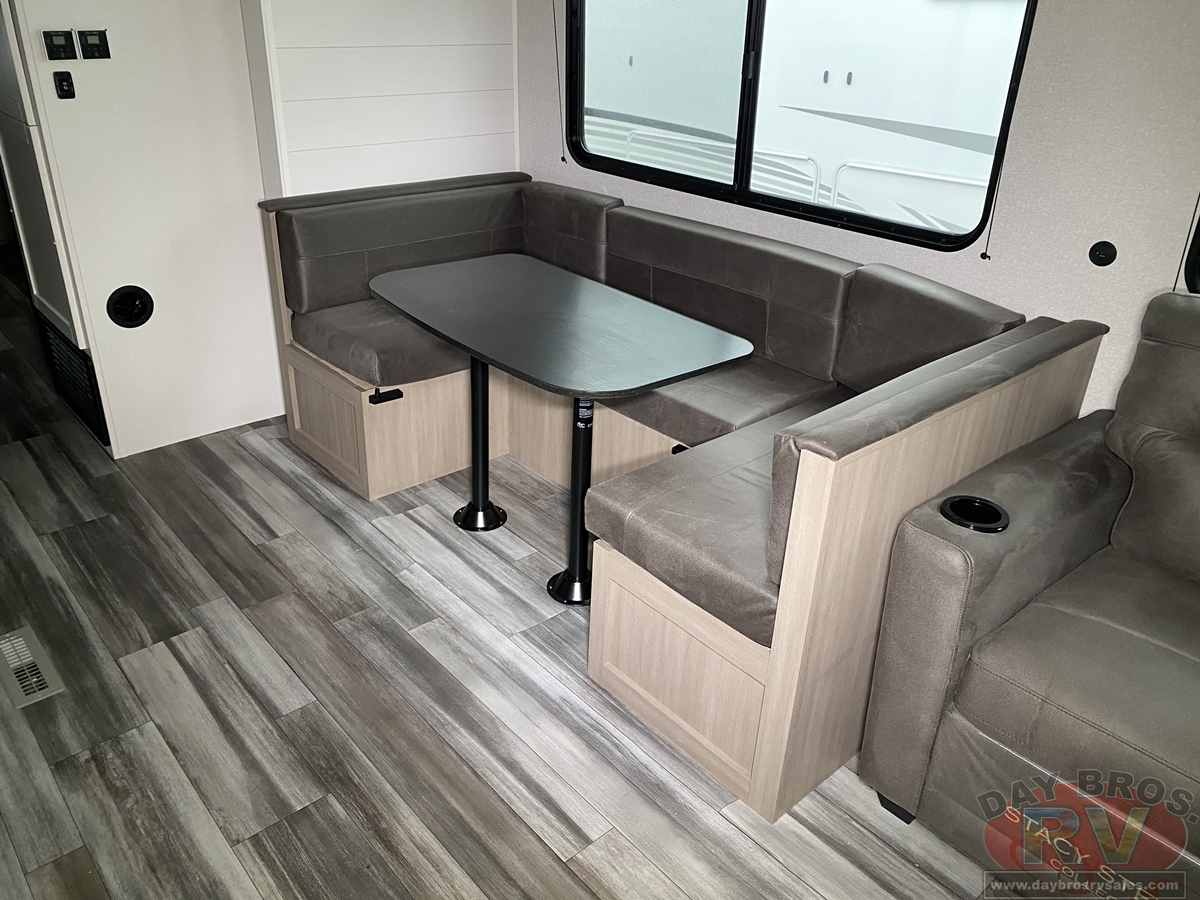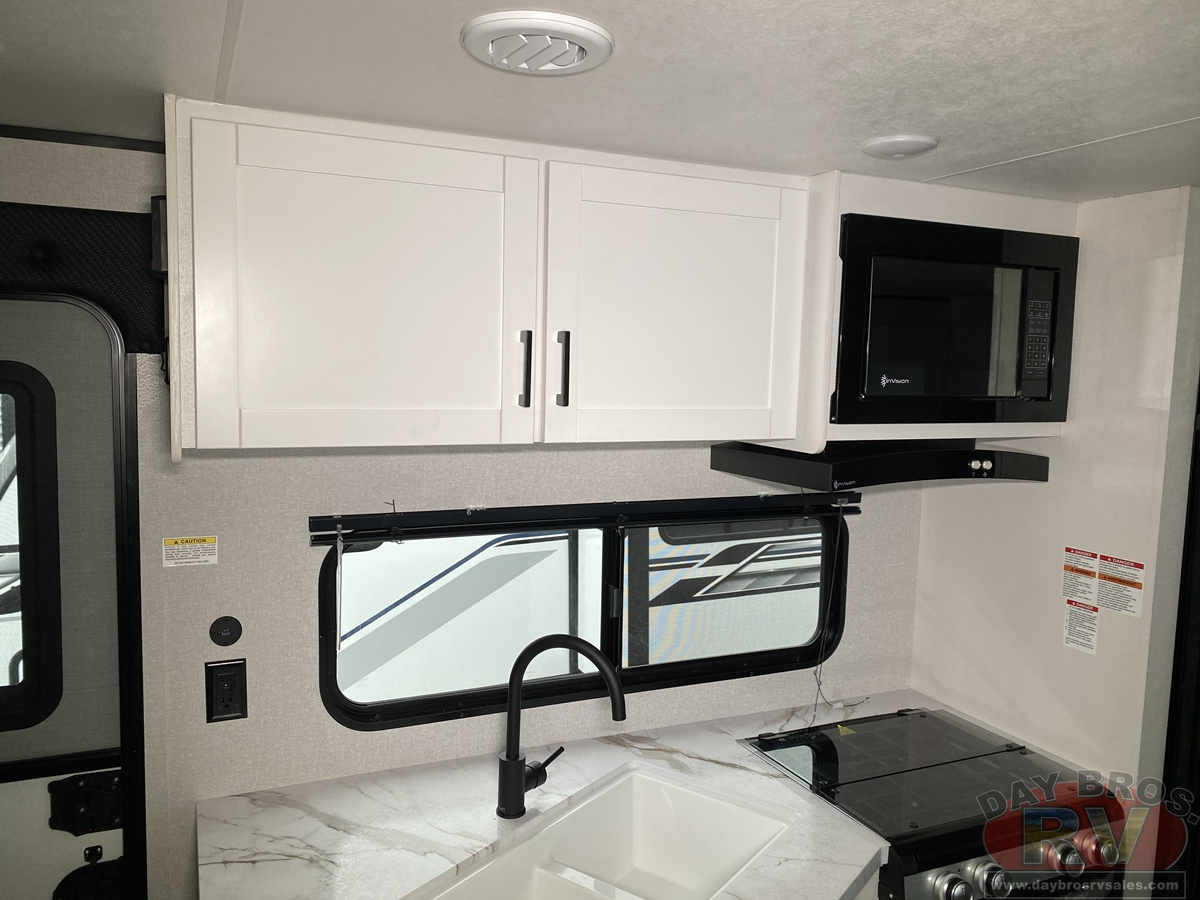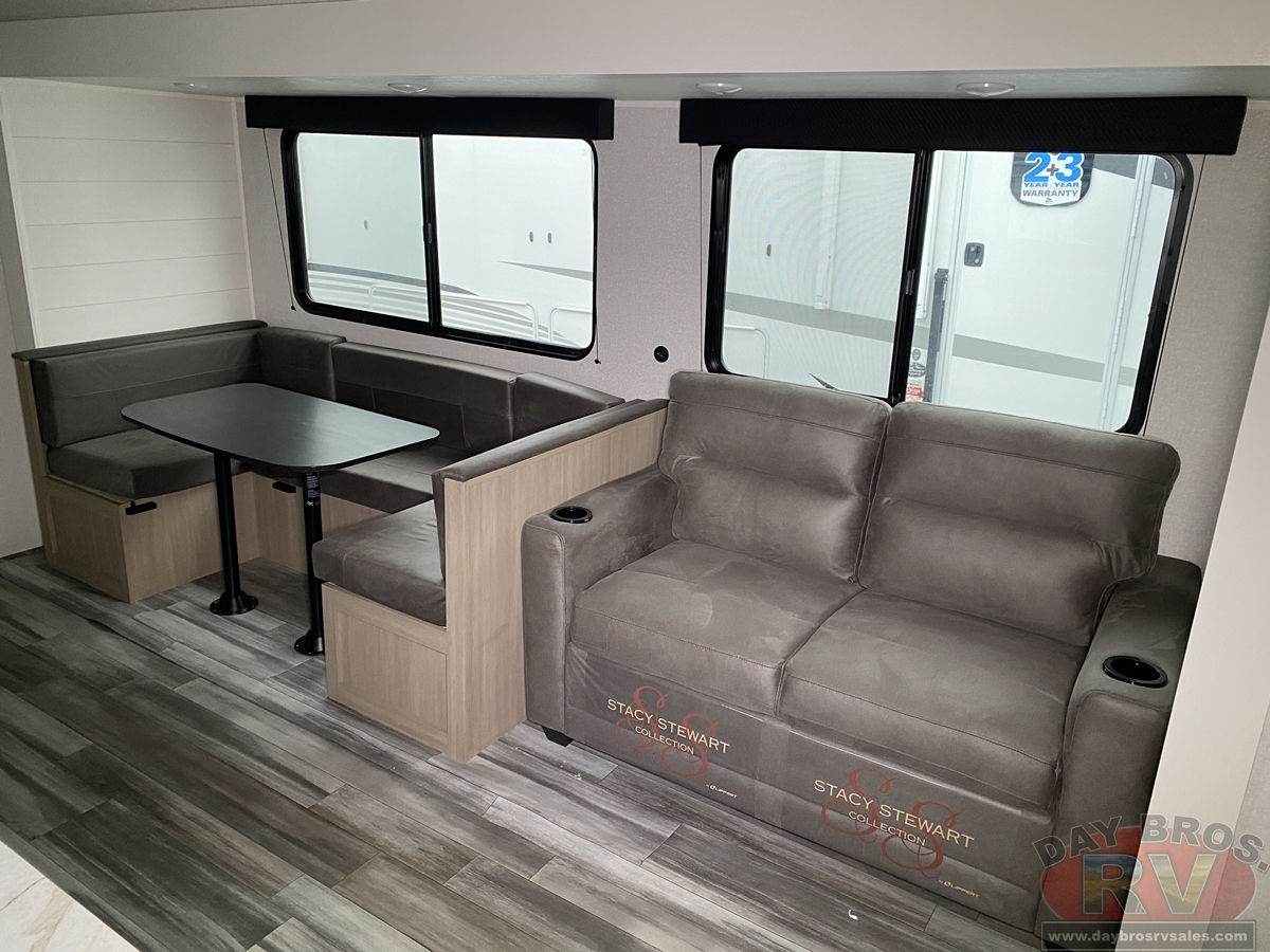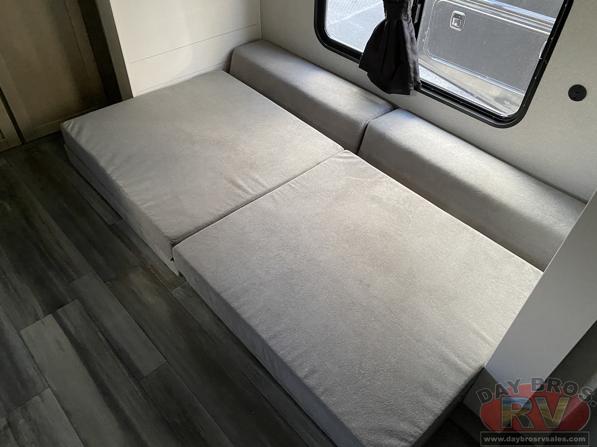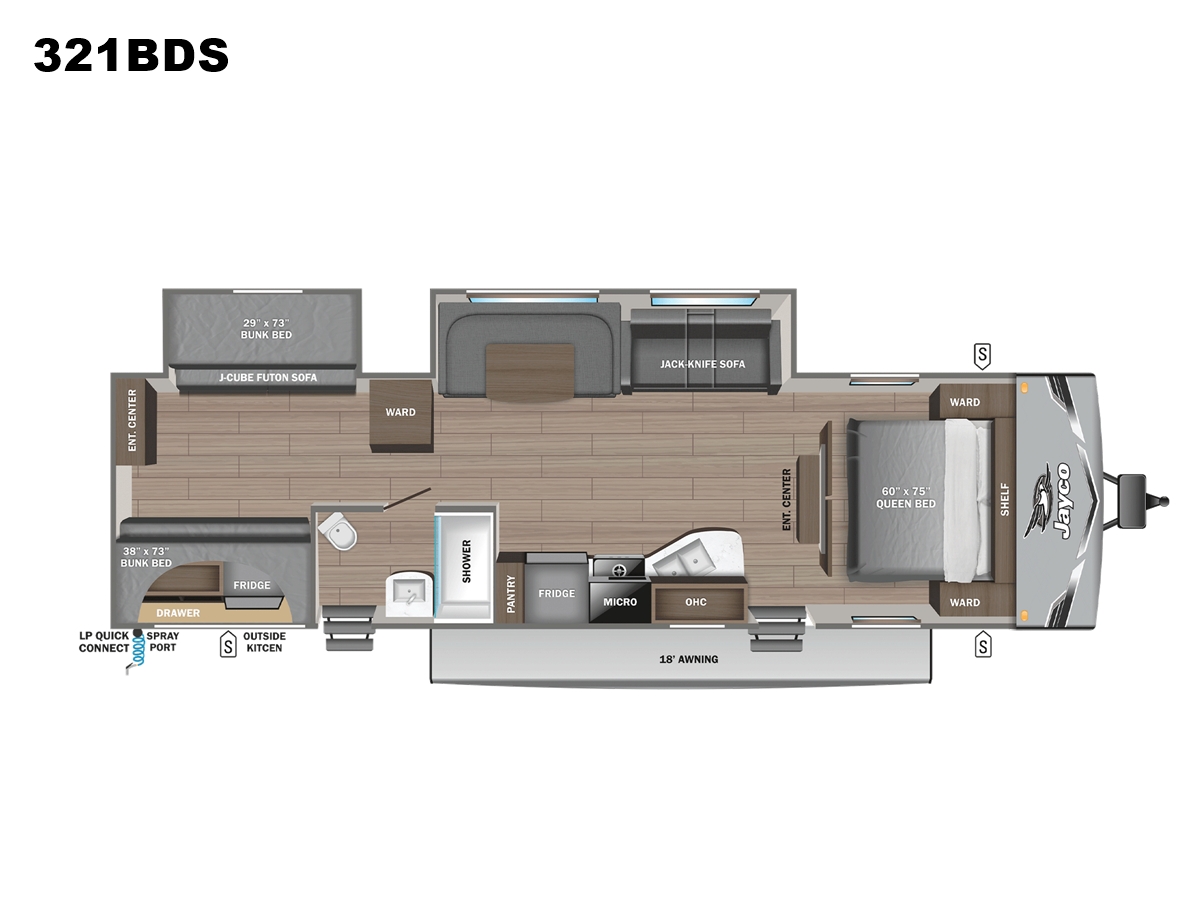Inside, the Jay Flight SLX boasts some luxe residential features. Solid hardwood cabinet doors and drawers, with hidden cabinet hinges, offer a modern and sleek look. We continue to keep our owner's needs at the top of our mind, by offering oversized cabinets for increased storage space. In addition, you'll find maximized storage underneath the bed or bunk beds, under the dinettes, under the jack-knife sofas and even a neatly finished and lit exterior passthrough storage space. And just like our larger units, the Jay Flight SLX comes standard with a 60,000 BTU on-demand tankless water heater, for comfortable water temperatures as needed.