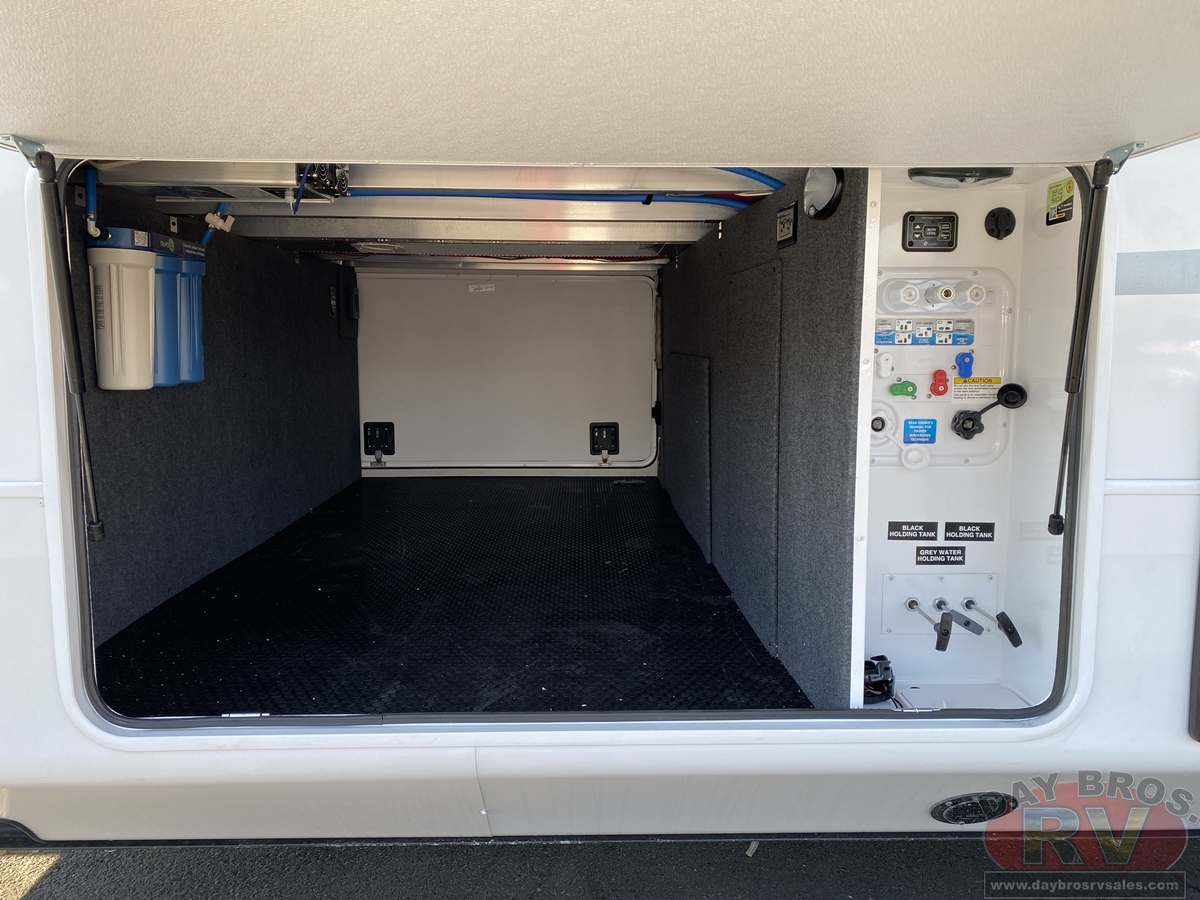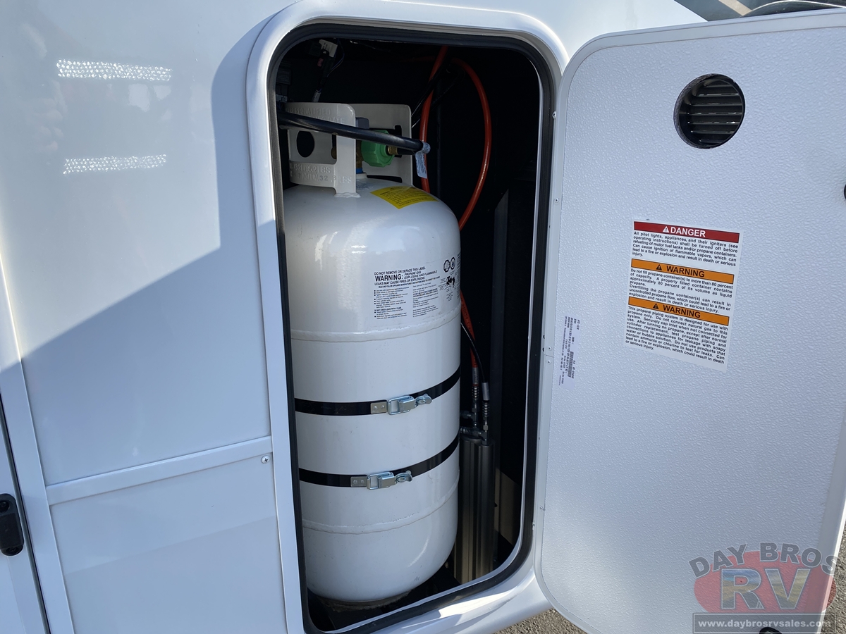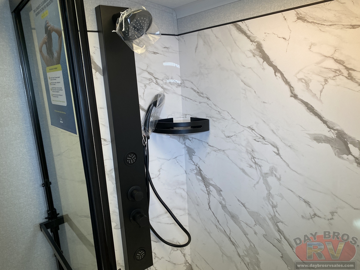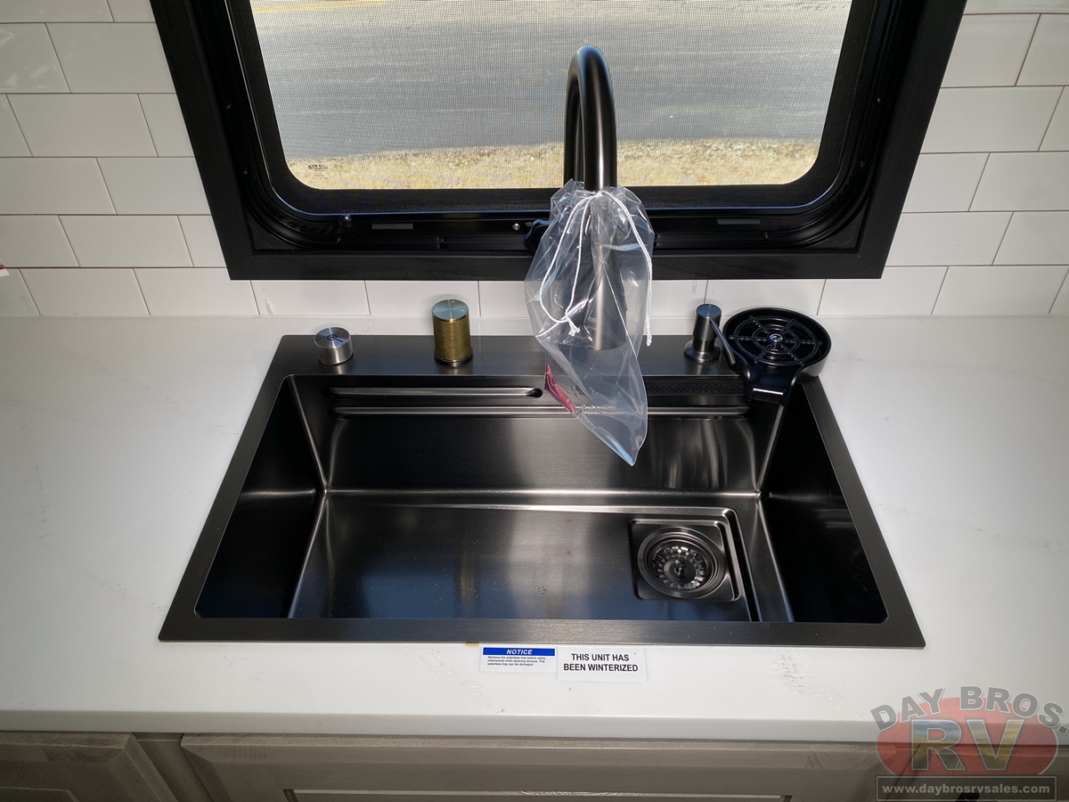 Pinnacle also features the AquaLuxe package—a premium setup that includes a high-capacity tankless water heater, (3) 40-lb. propane bottles for extended use, and the NuvoH2O filtration system. Together, they deliver instant hot water, longer off-grid capability and consistently cleaner, better-tasting water throughout the coach.