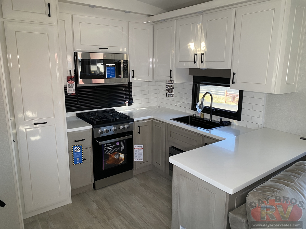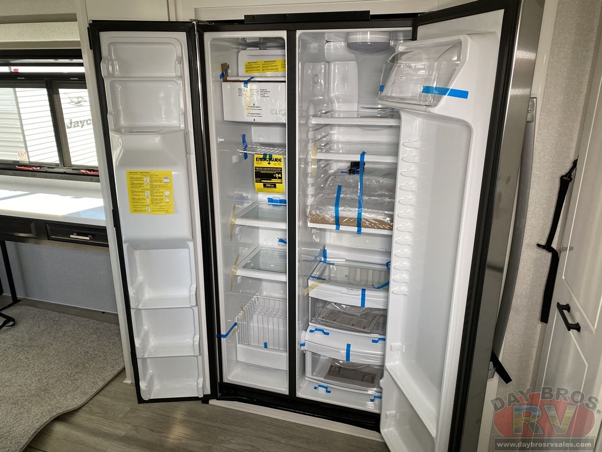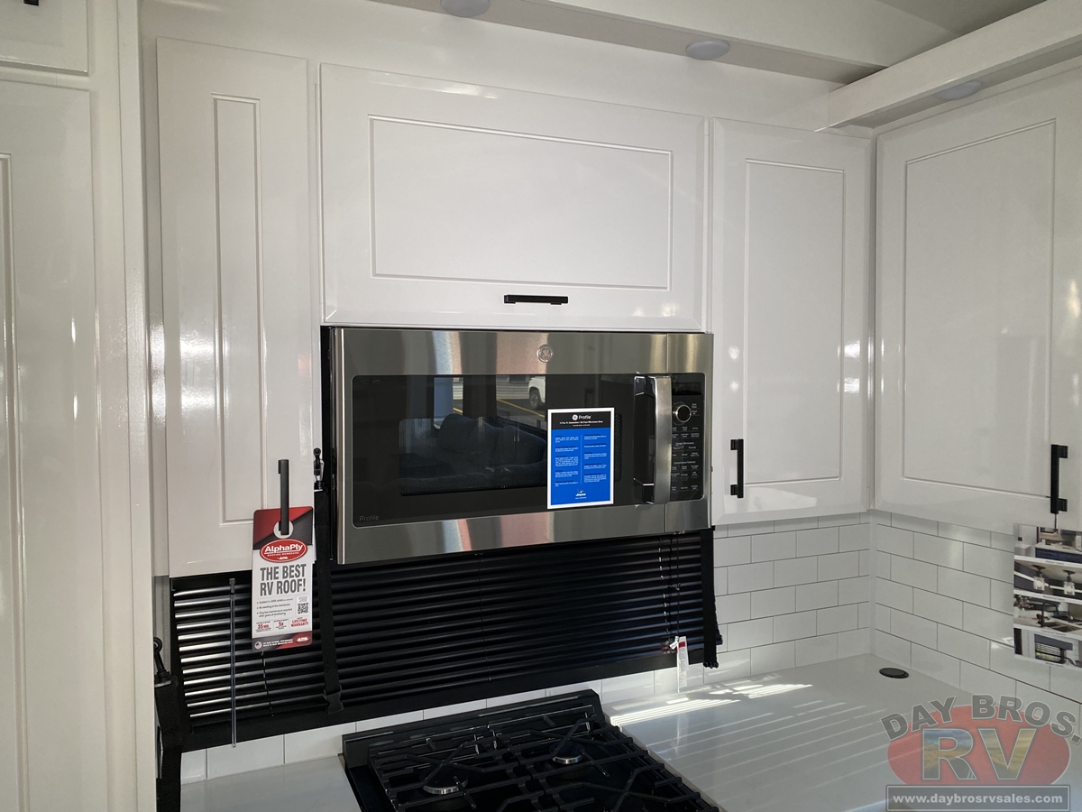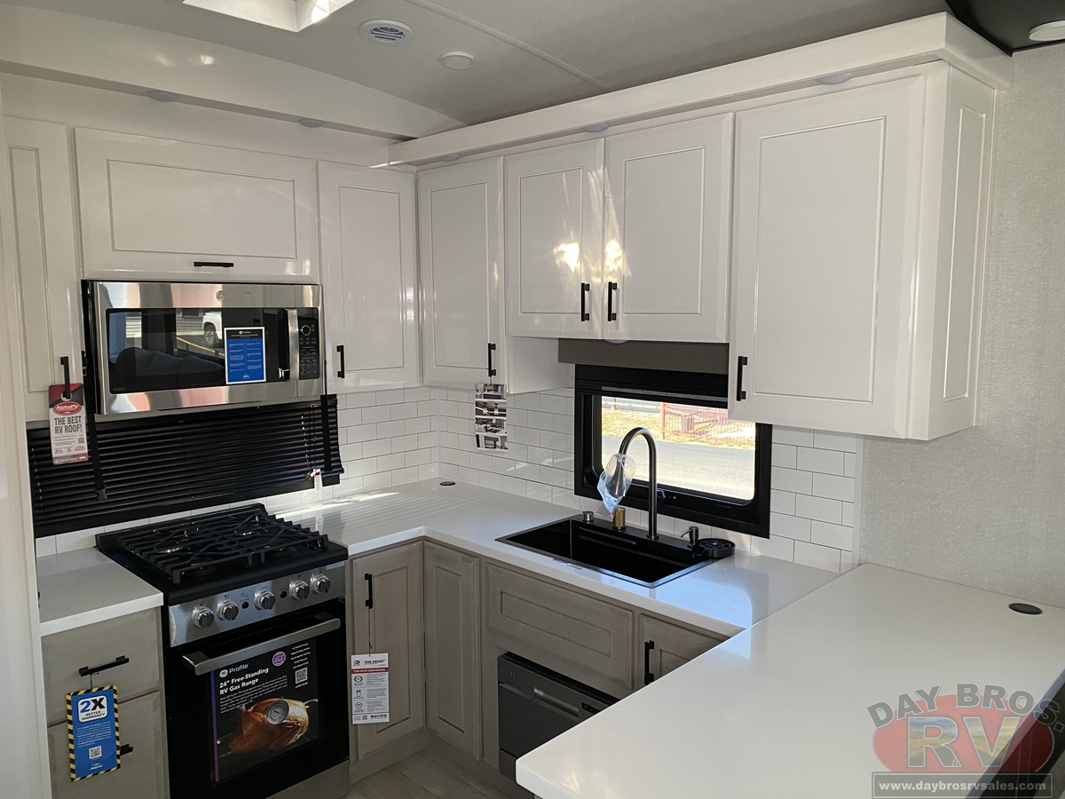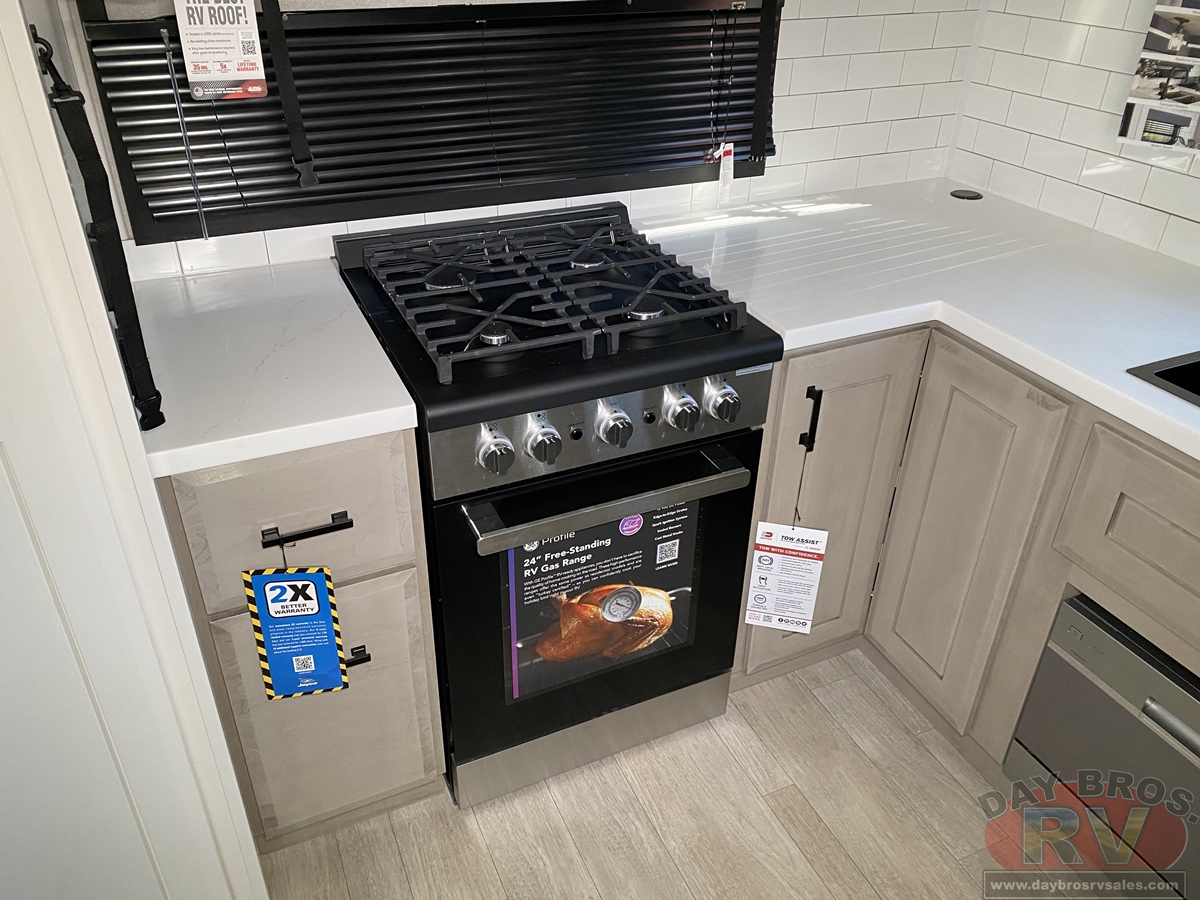 Step inside and experience the Jayco difference. From handcrafted solid hardwood maple cabinetry to sleek solid-surface countertops, every detail reflects intentional design and superior build quality. GE’s premium kitchen suite includes a 21 cu. ft. residential refrigerator, a 30 in. convection microwave with built-in air fryer, and a 24 in. high-output range—along with an available built-in dishwasher and extended bar top for effortless entertaining.