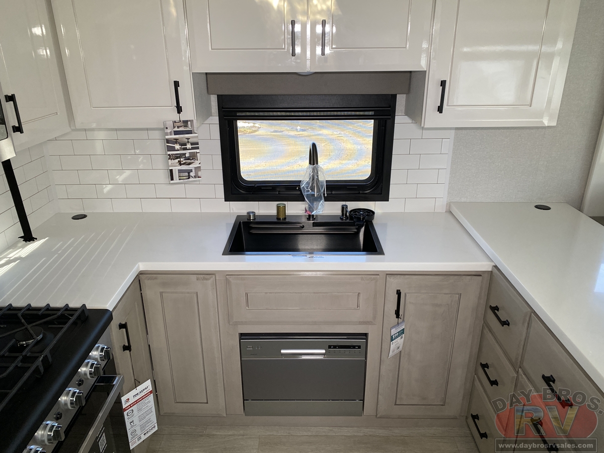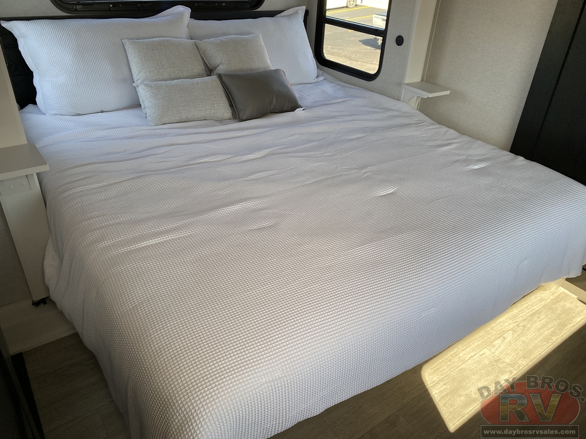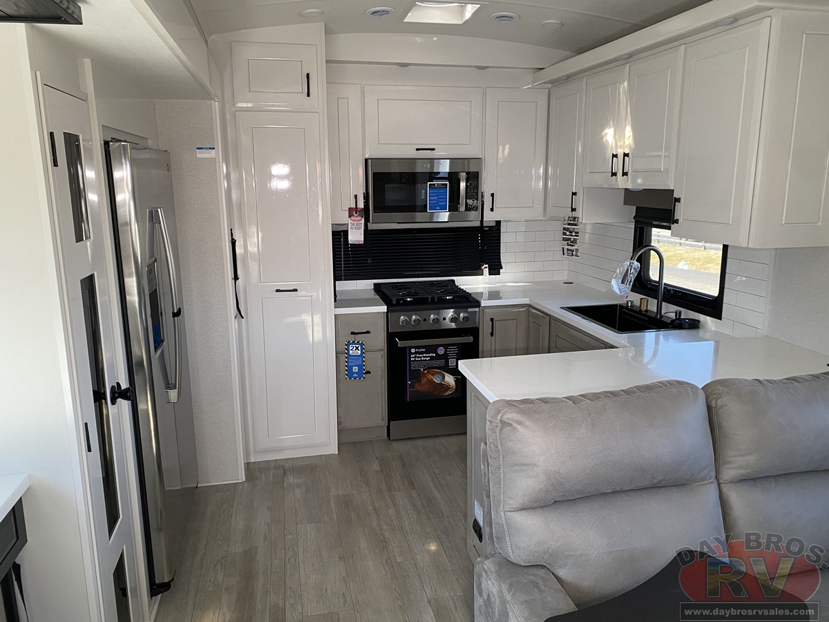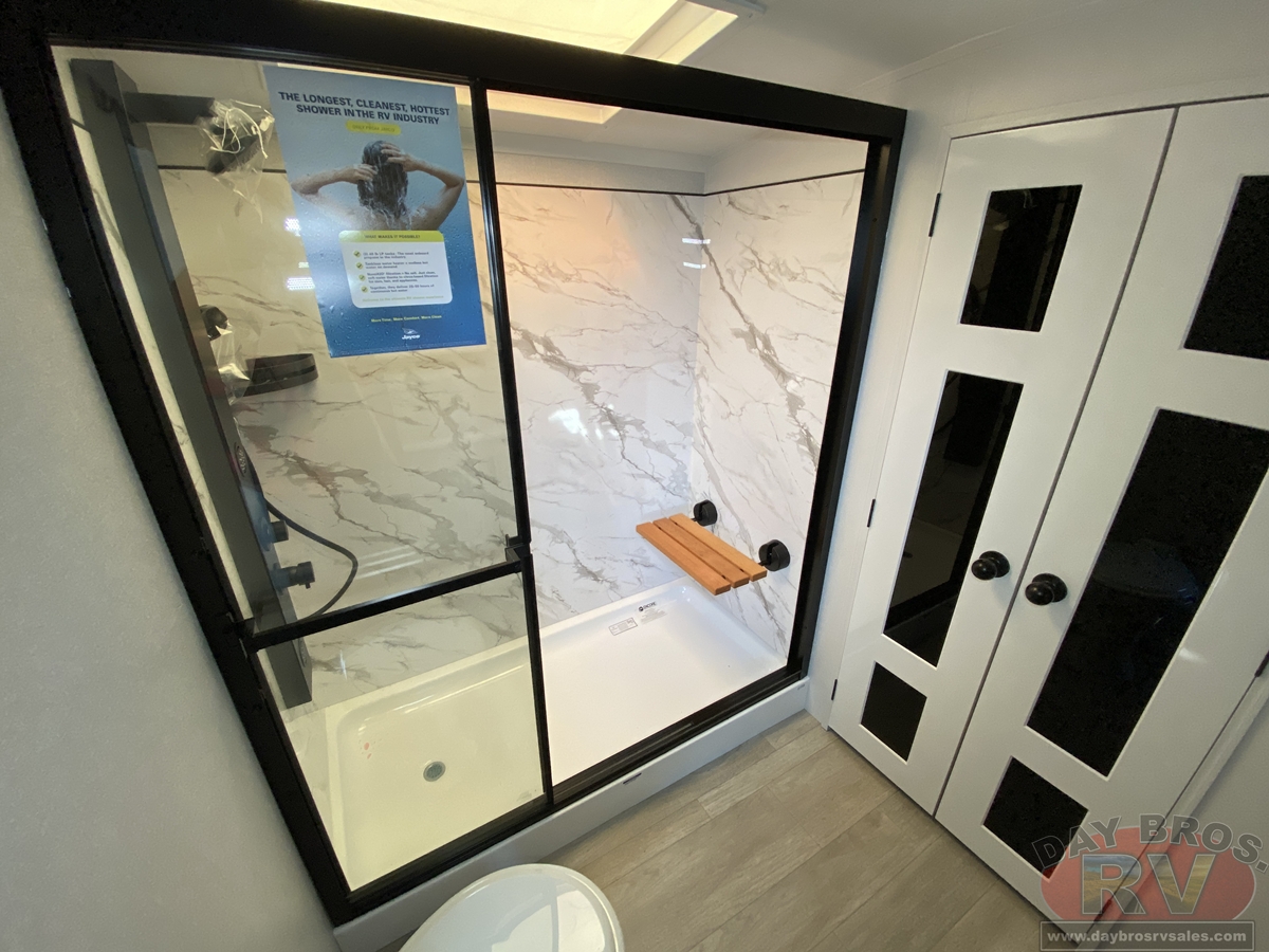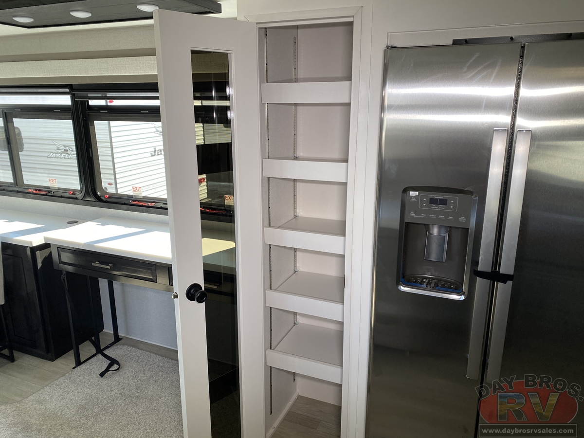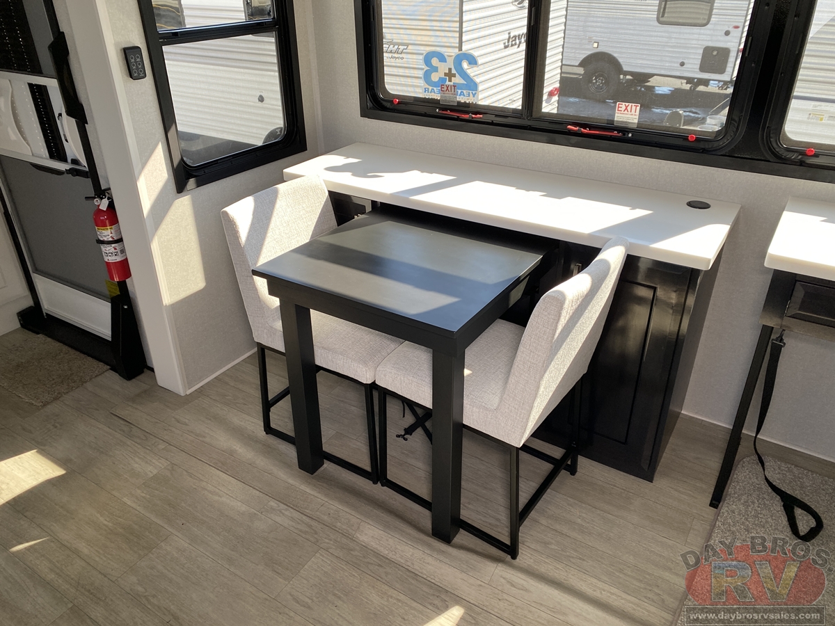 Step inside and experience the Jayco difference. From handcrafted solid hardwood maple cabinetry to sleek solid-surface countertops, every detail reflects intentional design and superior build quality. GE’s premium kitchen suite includes a 21 cu. ft. residential refrigerator, a 30 in. convection microwave with built-in air fryer, and a 24 in. high-output range—along with an available built-in dishwasher and extended bar top for effortless entertaining.