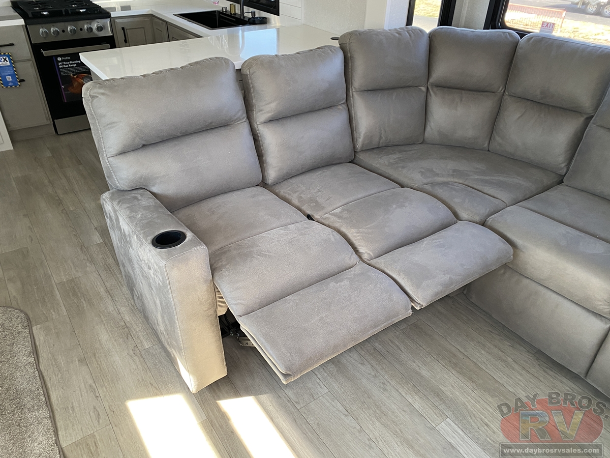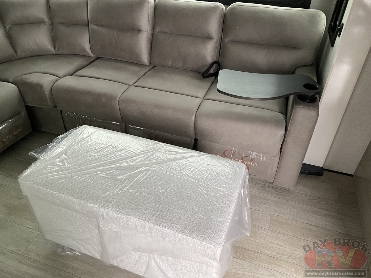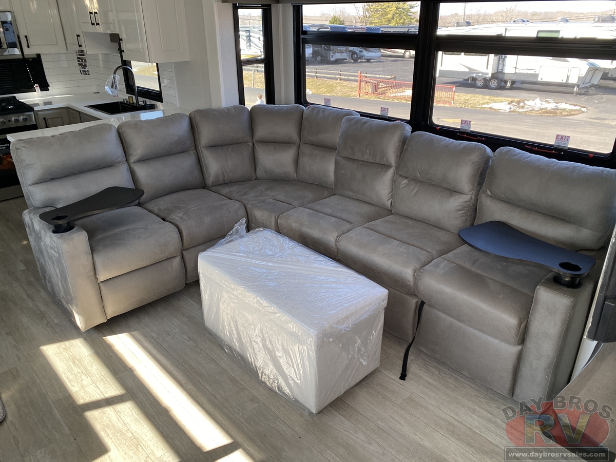 Relaxation reaches new heights with power theater seating that offers industry-first three-position headrests, heat, massage, power recline, LED lighting and integrated USB charging. Stain-resistant, cloth-covered cushions offer durability without sacrificing luxury. Climate control is seamless thanks to the HELIX Cooling System™ and ultra-efficient Whisper Quiet A/Cs.