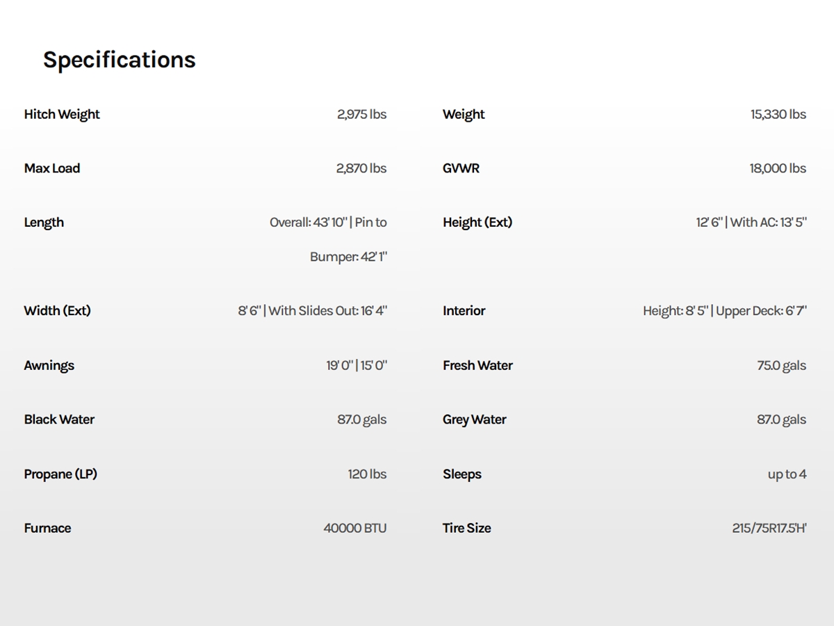 Overall: 43' 10" | Pin to Bumper: 42' 1"