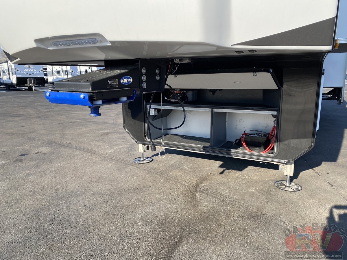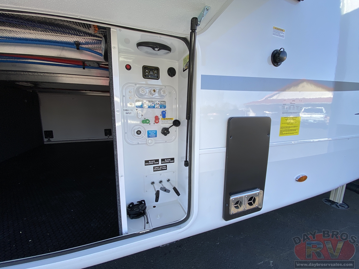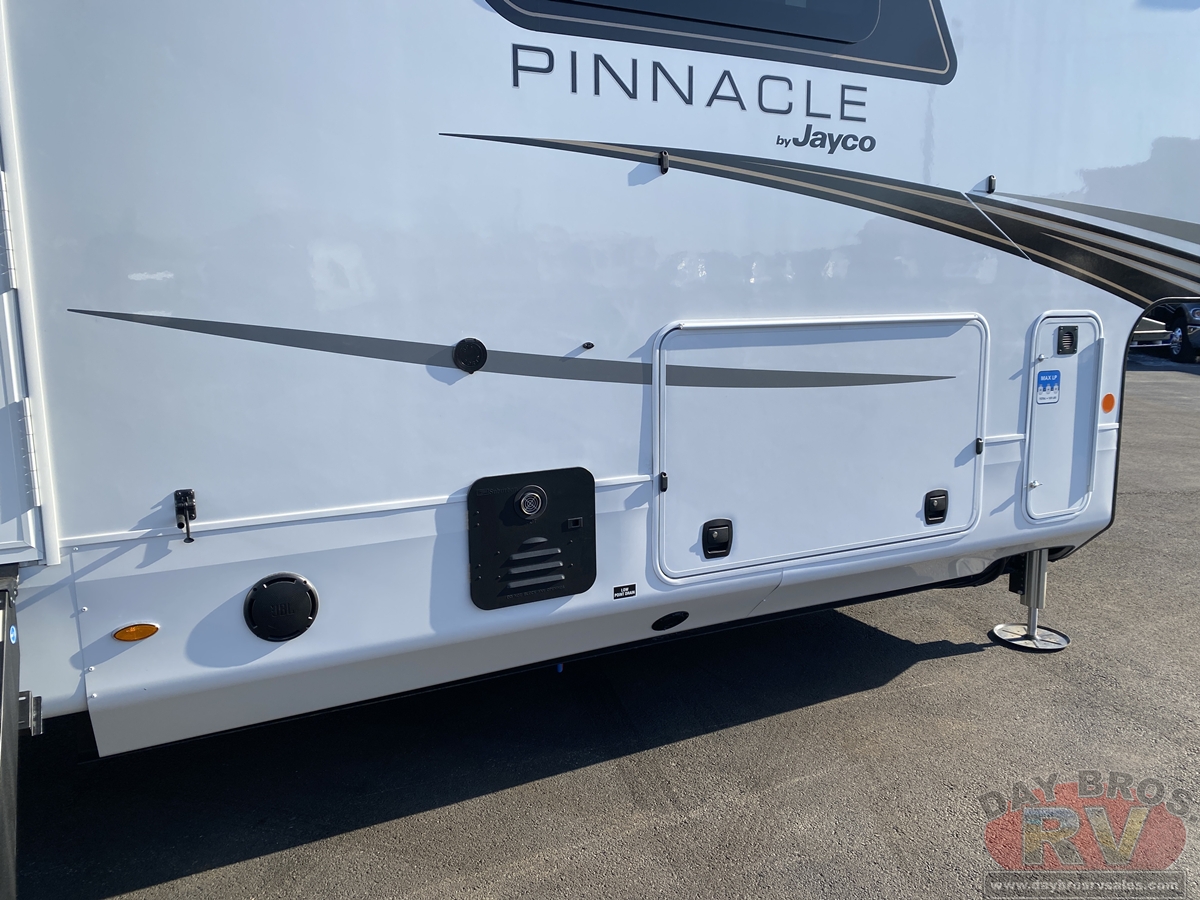 A 102-inch wide-body foundation, 120 lbs. of LP capacity, a 3,000 lb. rear tow hitch and massive pass-through storage with Slam-latch™ doors add real-world function to Pinnacle’s luxurious form. Backed by Stronghold VBL™ laminated walls and JaySMART™ safety lighting, it’s as durable and dependable as it is elegant.