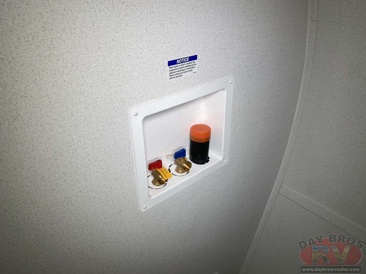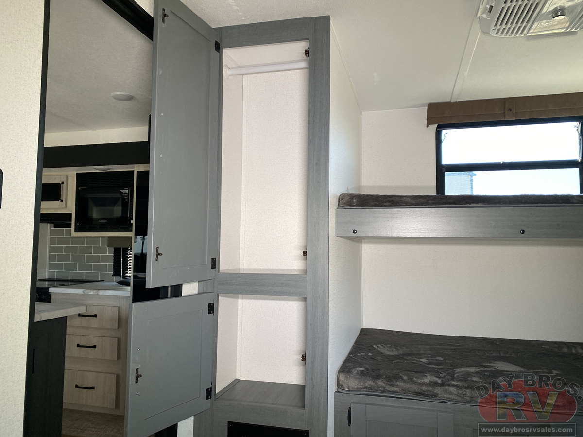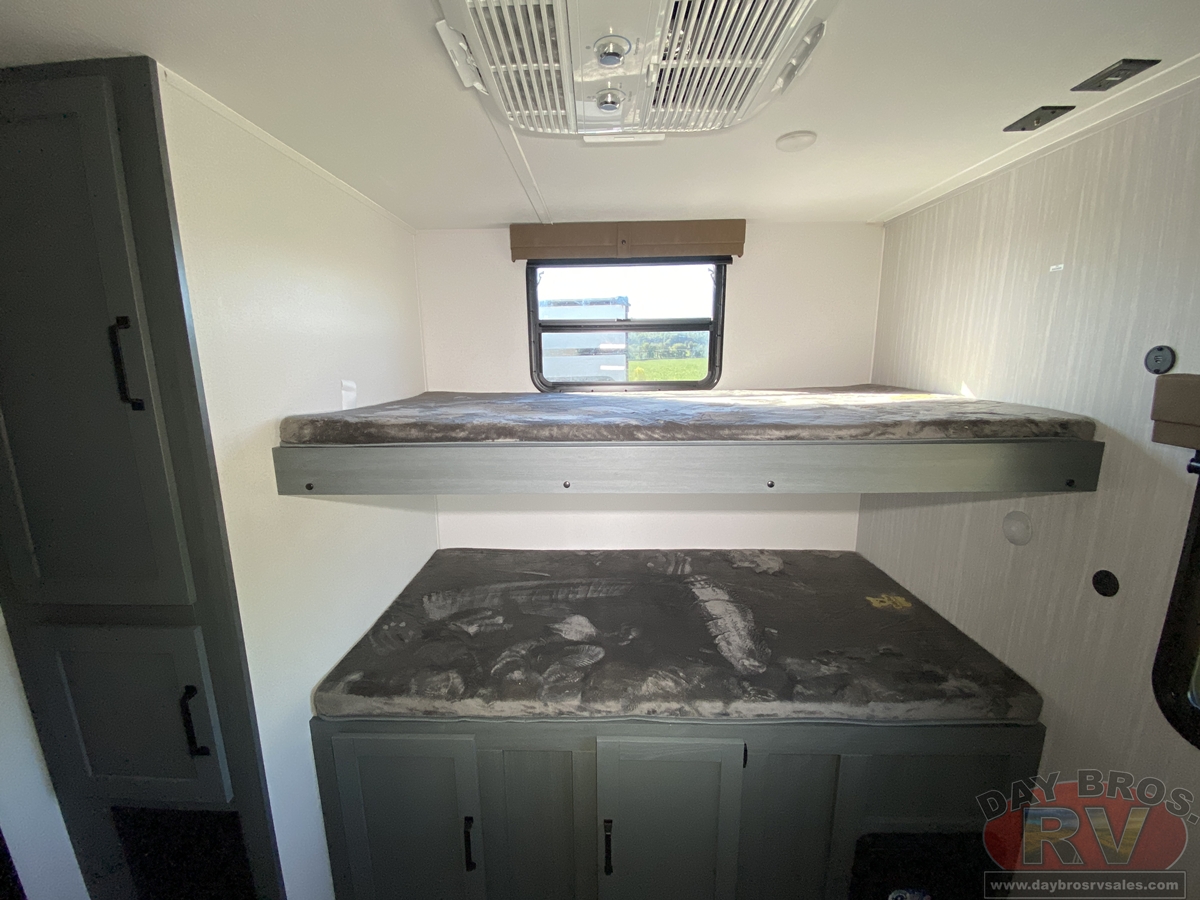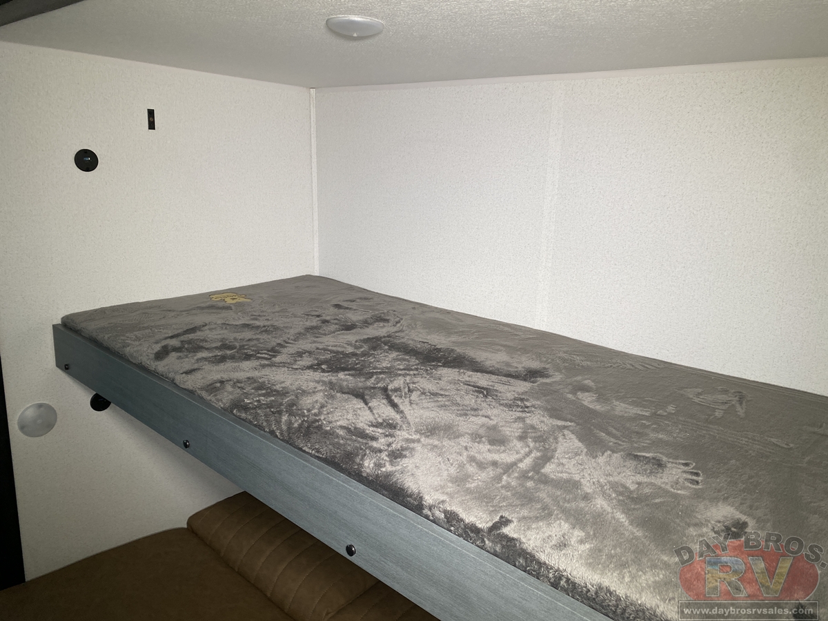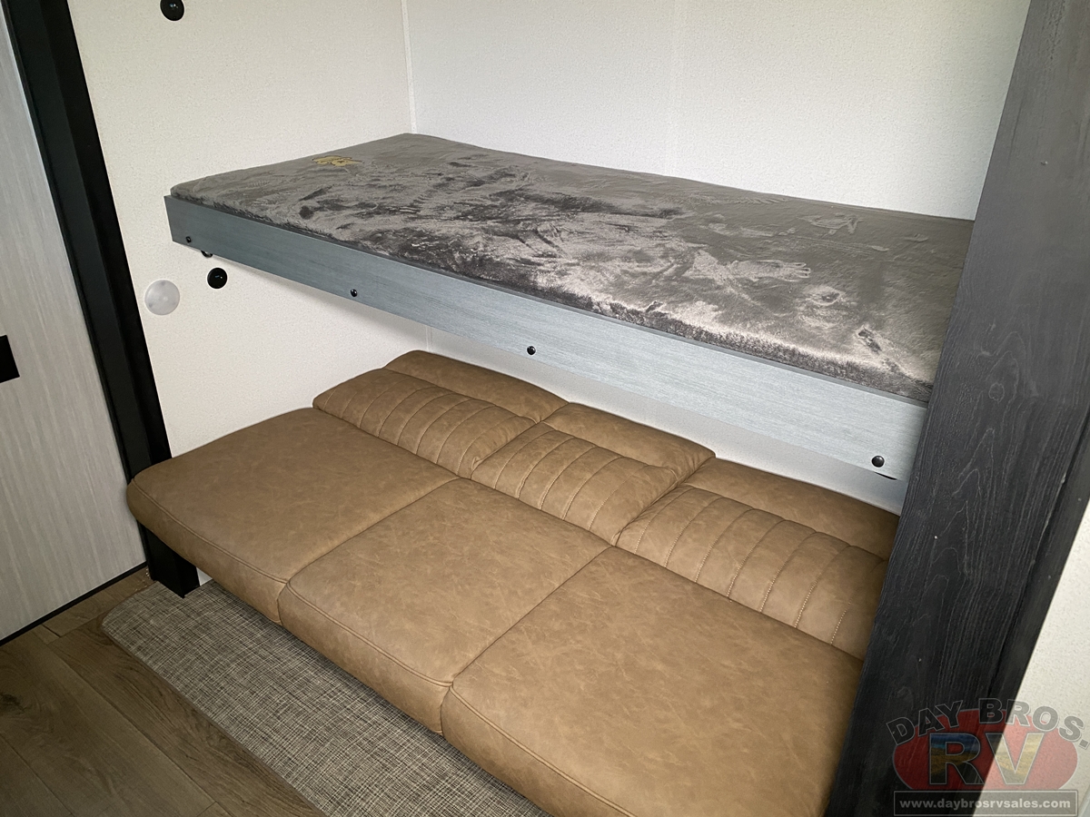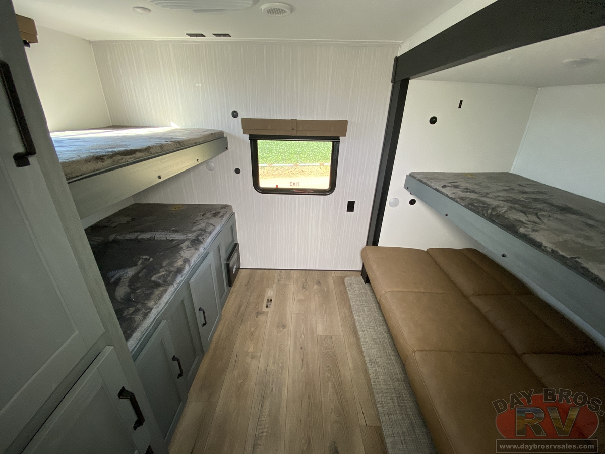 This bunk house travel trailer has four slide outs. Three on the same side and provide plenty of space for entertaining and all of your family/guests. The front bedroom with a slideout contains a queen bed, a very large closet, and washer/dryer prep. The whole layout of this camper contains no shortness of sleeping arrangements due to the bunk house in the rear as well. This bunk house will grant you three bunks a and a fold down sofa for everyone to enjoy their stay comfortably.