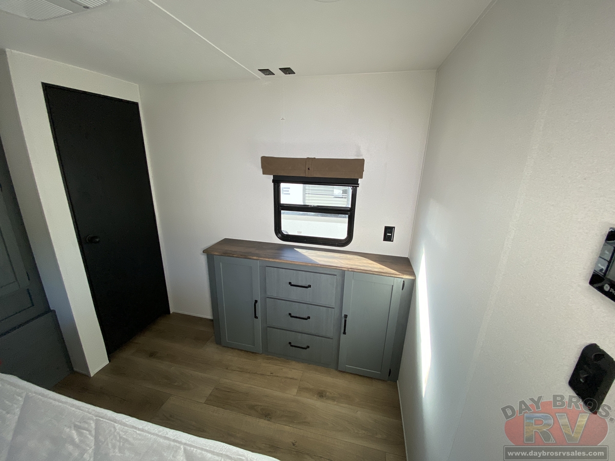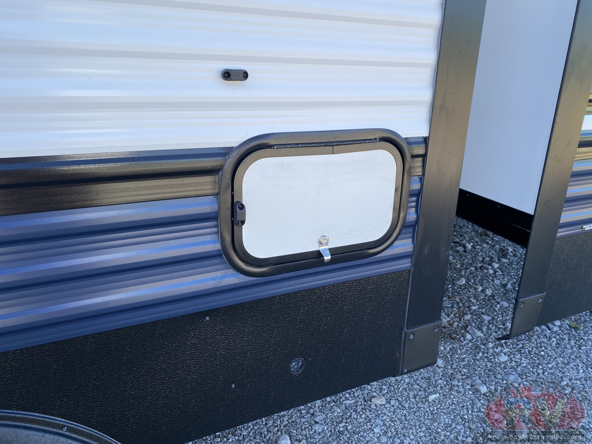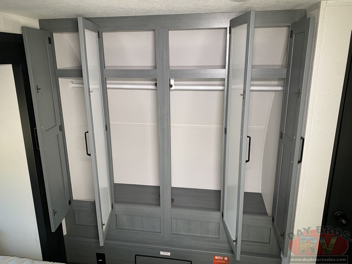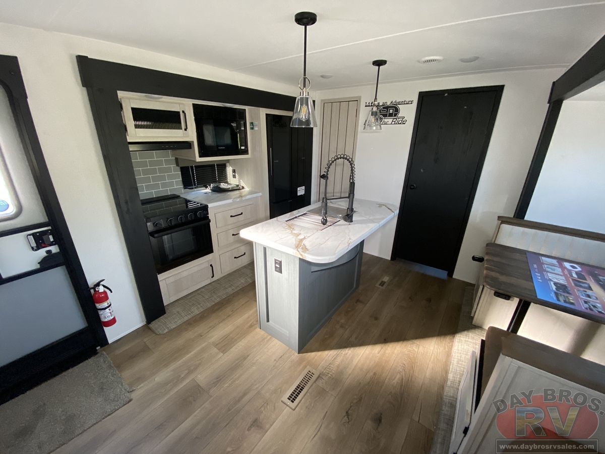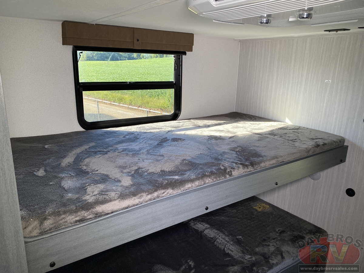 This bunk house travel trailer has four slide outs. Three on the same side and provide plenty of space for entertaining and all of your family/guests. The front bedroom with a slideout contains a queen bed, a very large closet, and washer/dryer prep. The whole layout of this camper contains no shortness of sleeping arrangements due to the bunk house in the rear as well. This bunk house will grant you three bunks a and a fold down sofa for everyone to enjoy their stay comfortably.