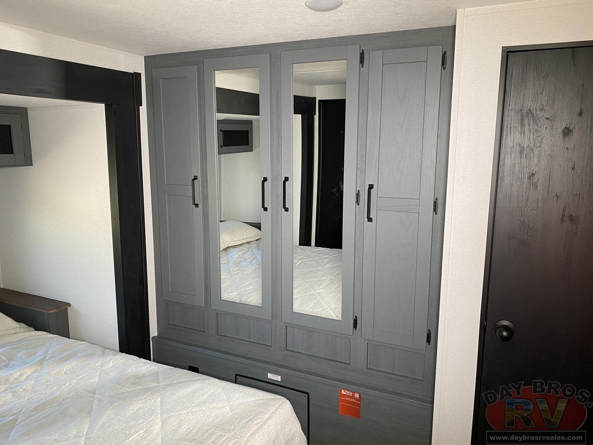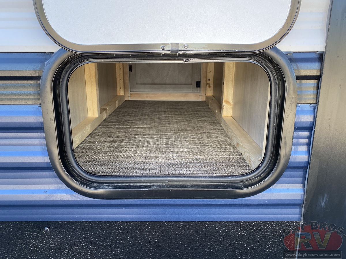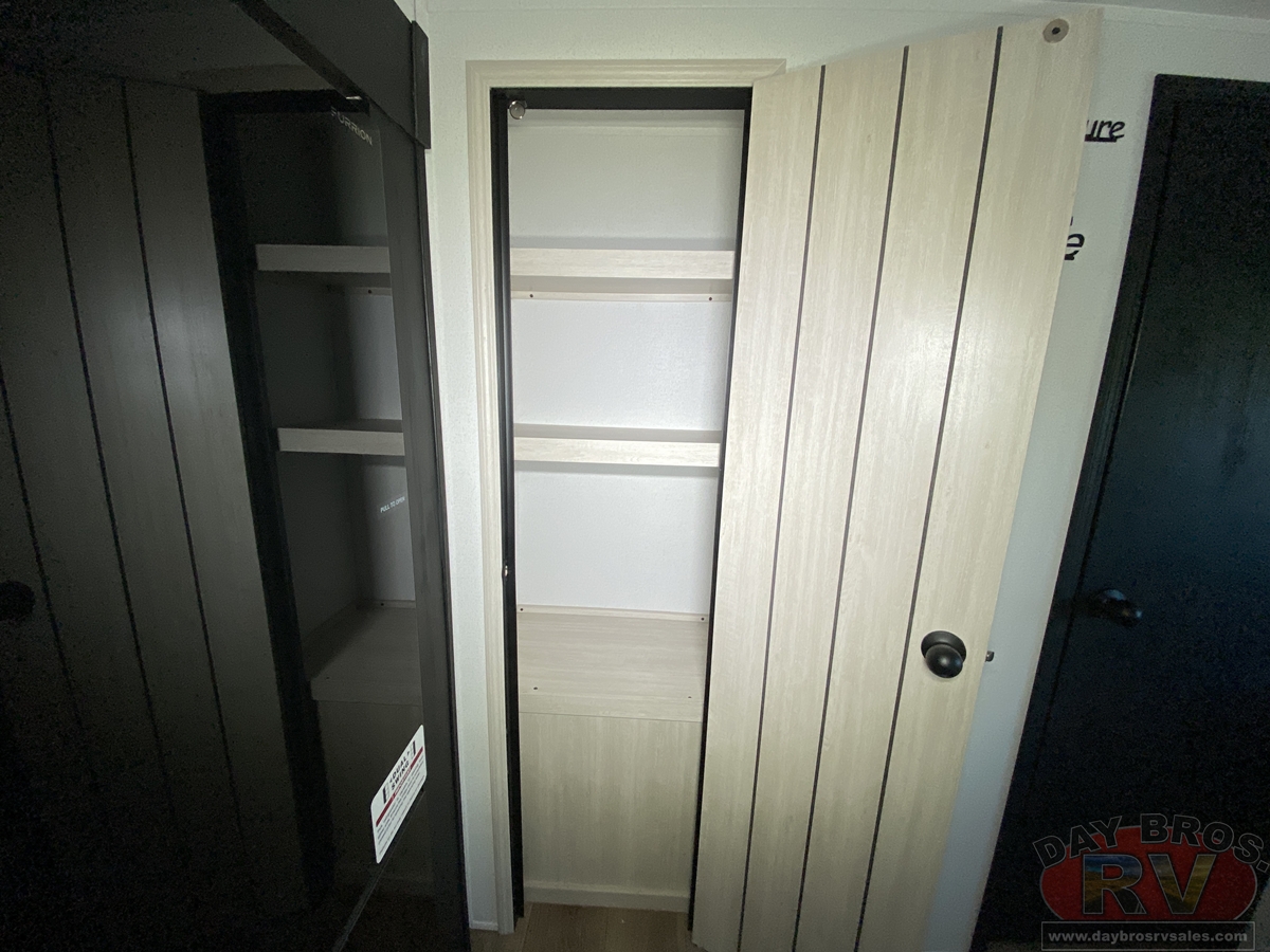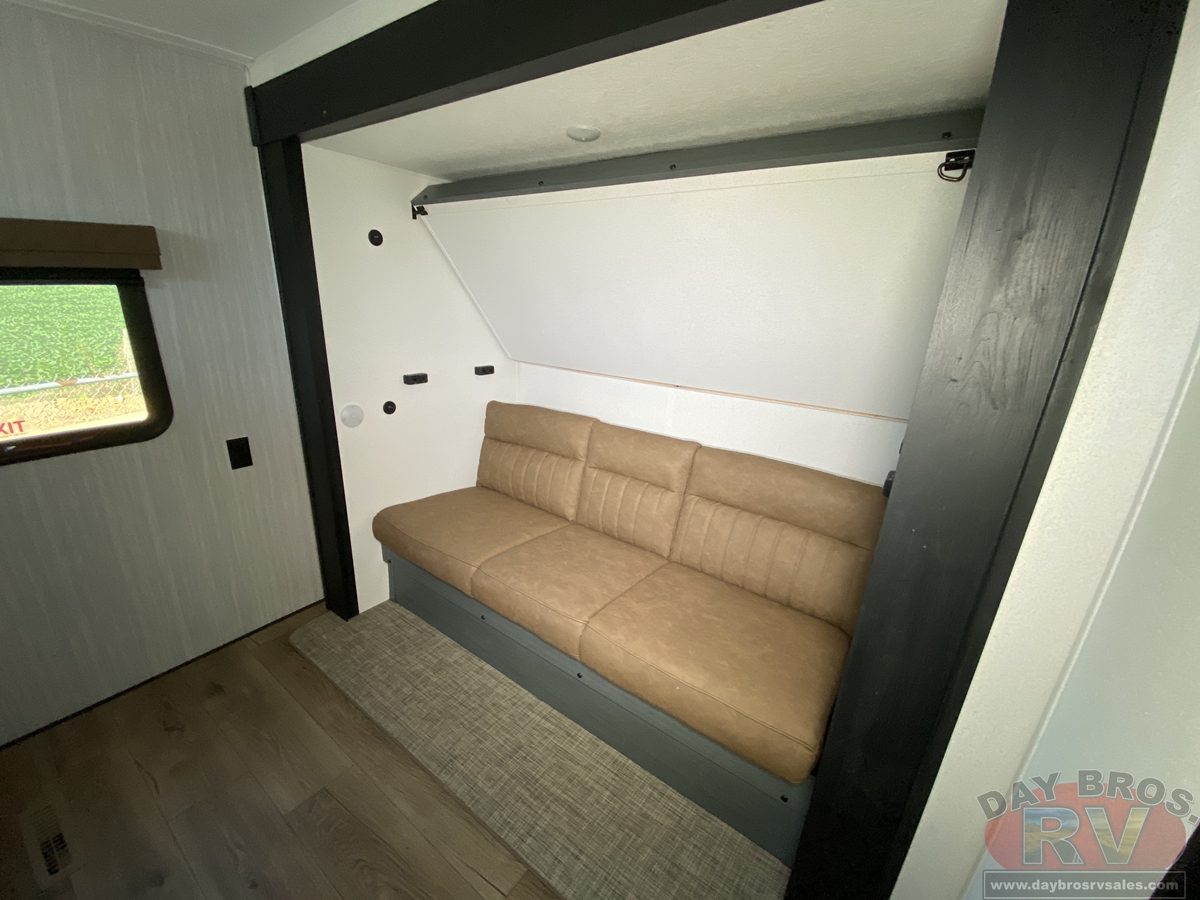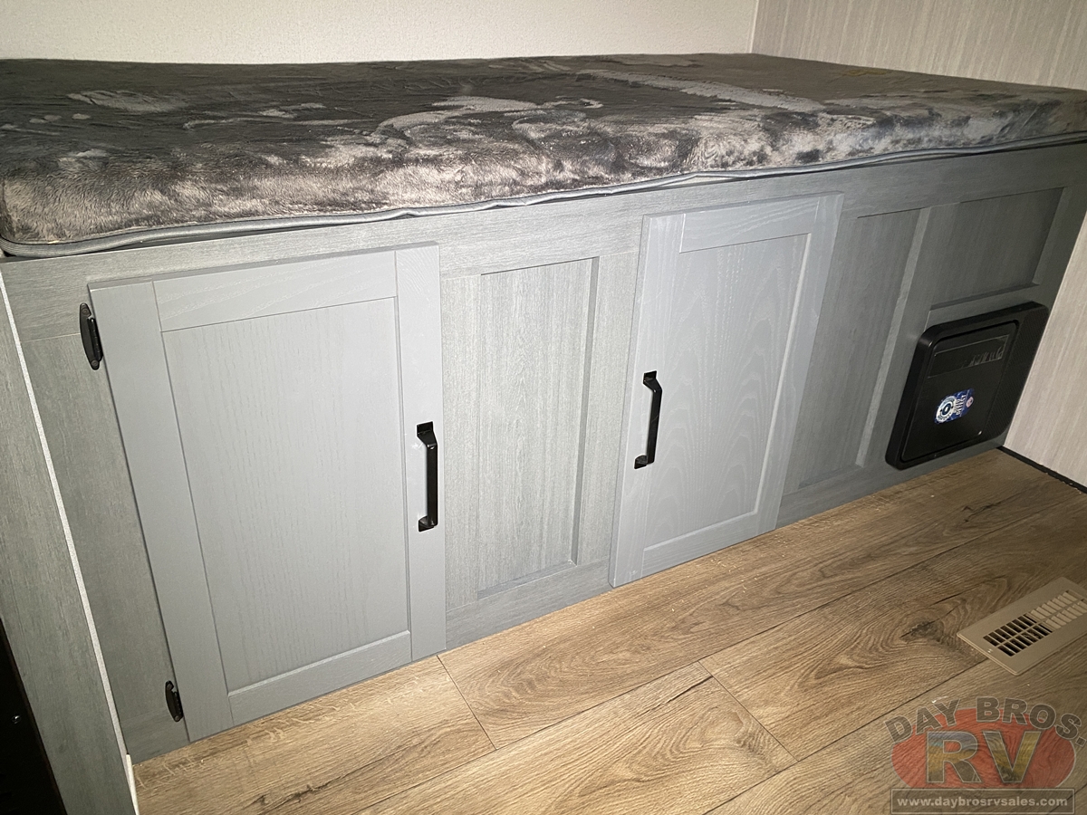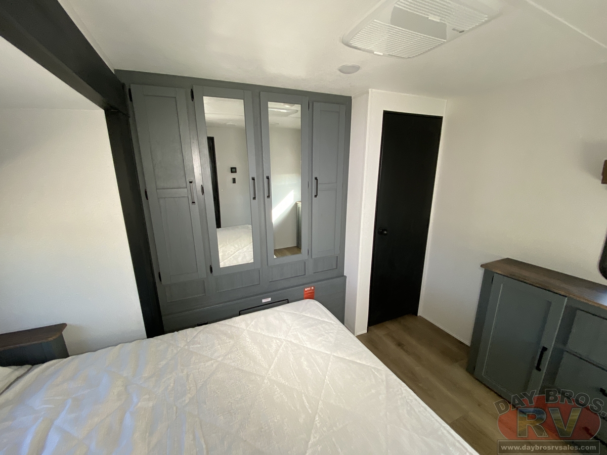 This bunk house travel trailer has four slide outs. Three on the same side and provide plenty of space for entertaining and all of your family/guests. The front bedroom with a slideout contains a queen bed, a very large closet, and washer/dryer prep. The whole layout of this camper contains no shortness of sleeping arrangements due to the bunk house in the rear as well. This bunk house will grant you three bunks a and a fold down sofa for everyone to enjoy their stay comfortably.